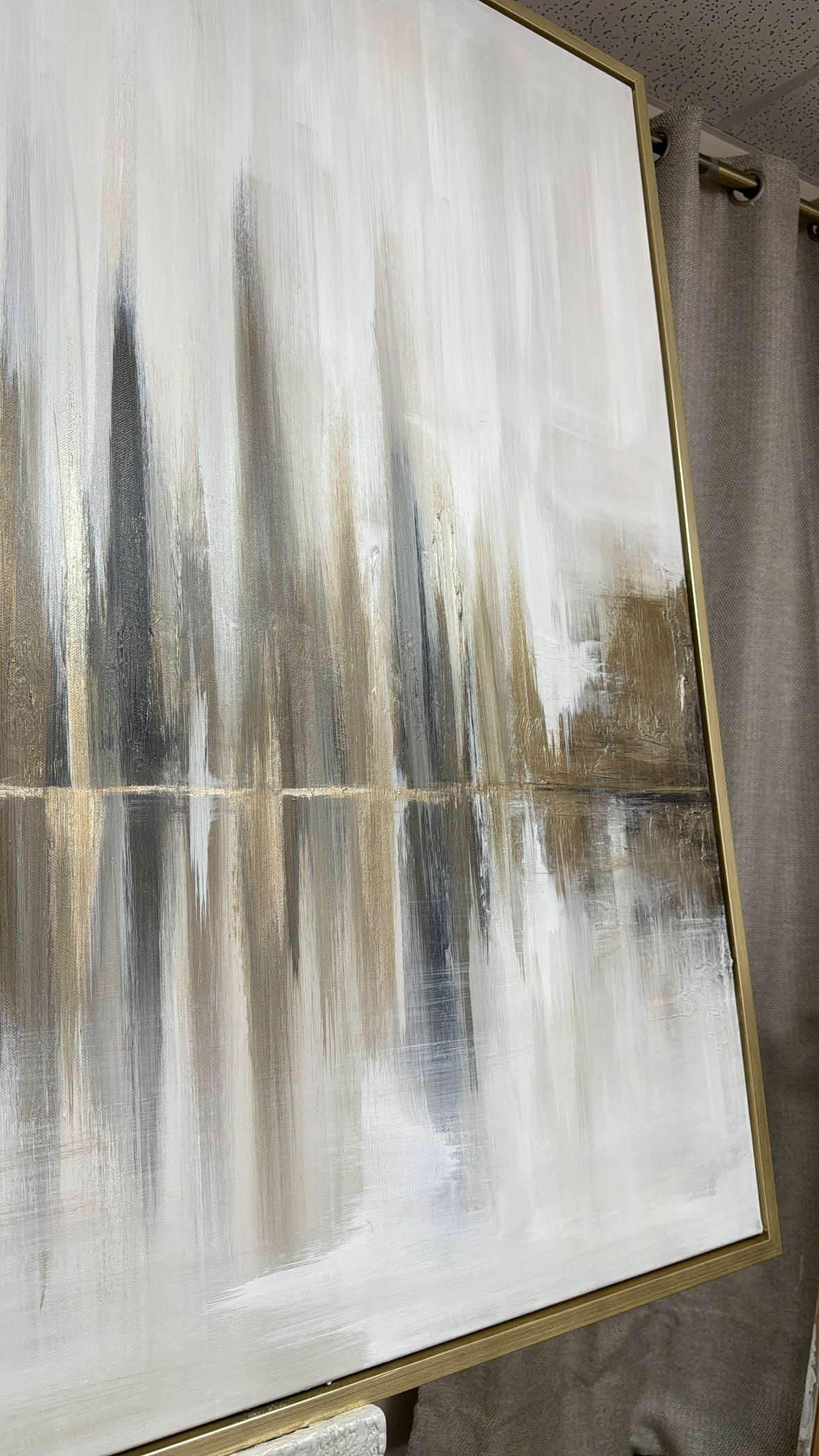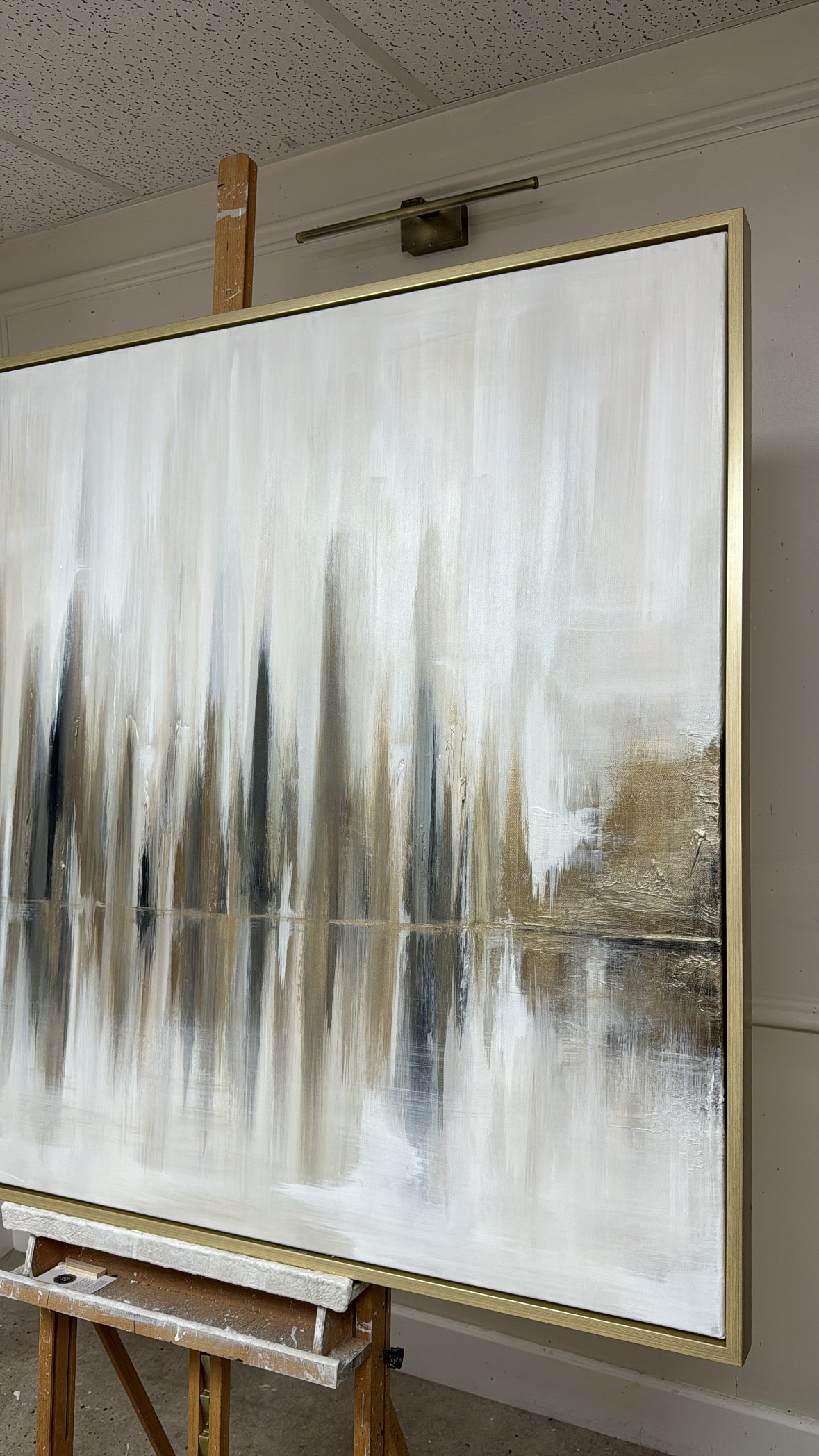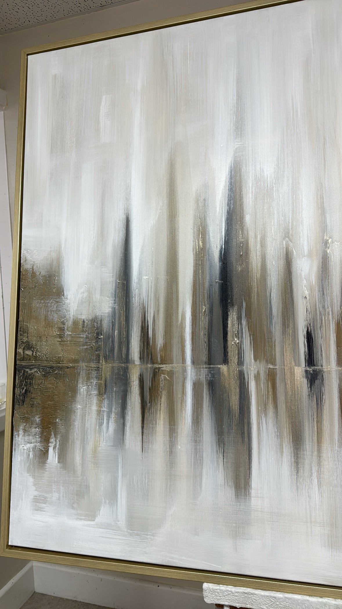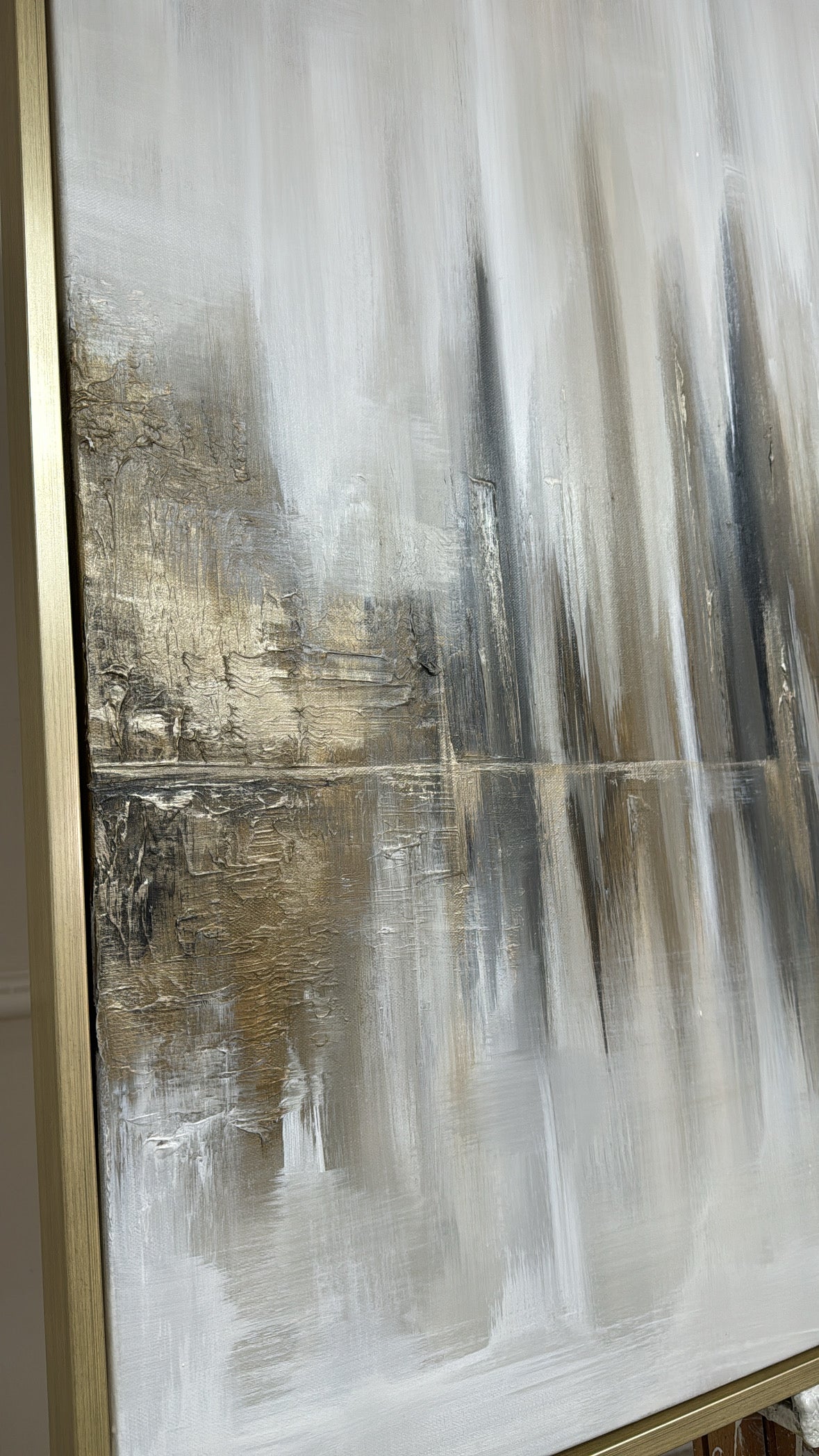 'Bronzed Skyline' Originally shown here is a cream, grey, white, black, mixed taupe, bronze with a gold centre - Featured is a 100x120 cm piece in champagne frame
