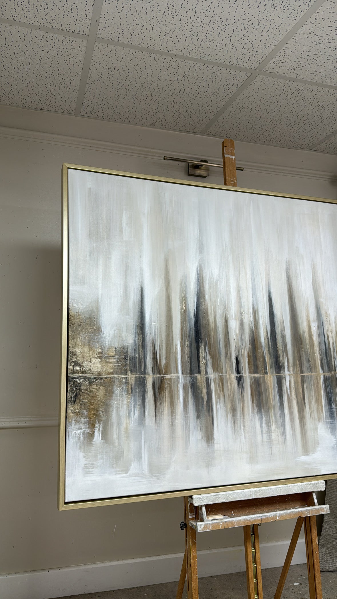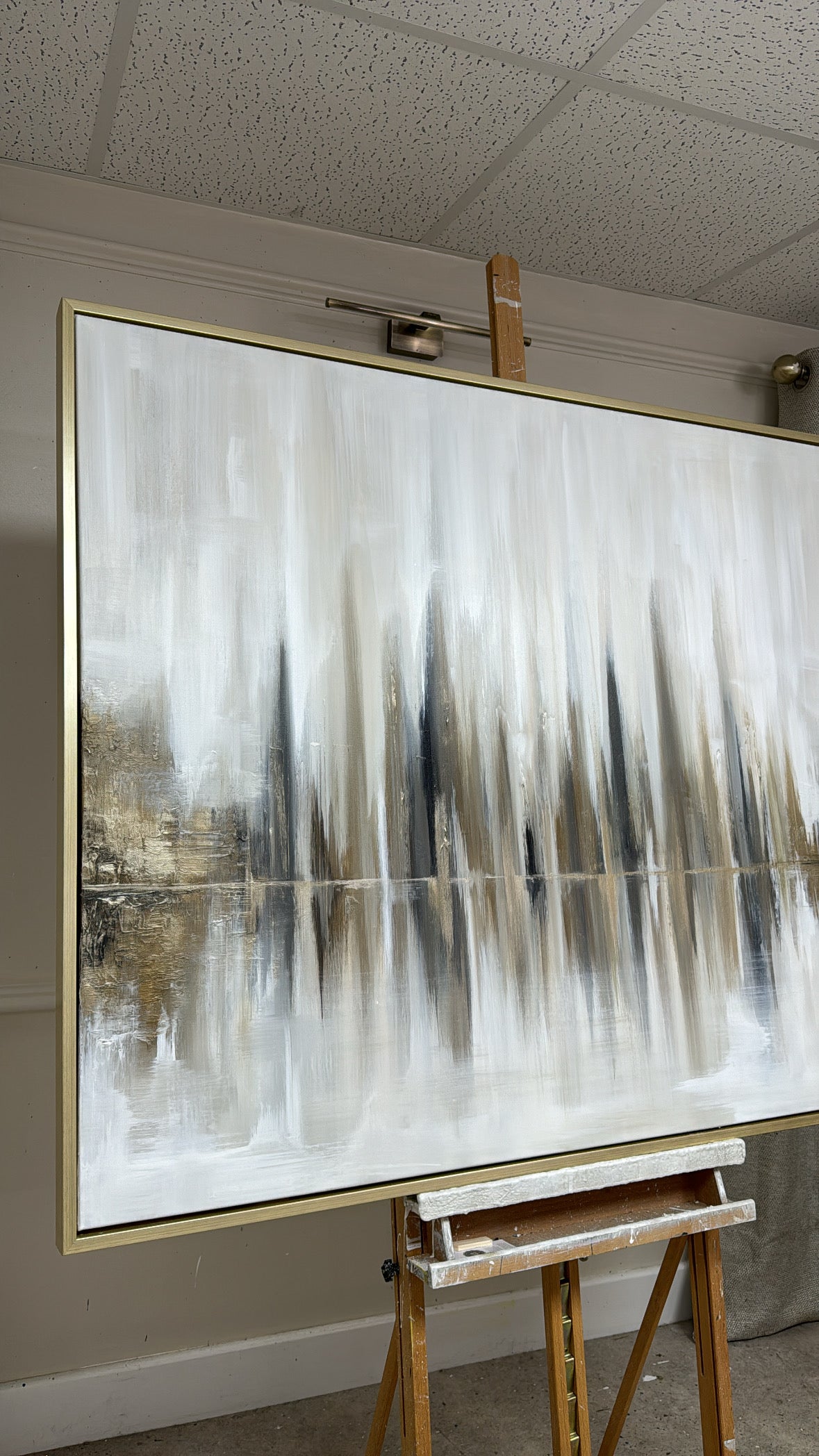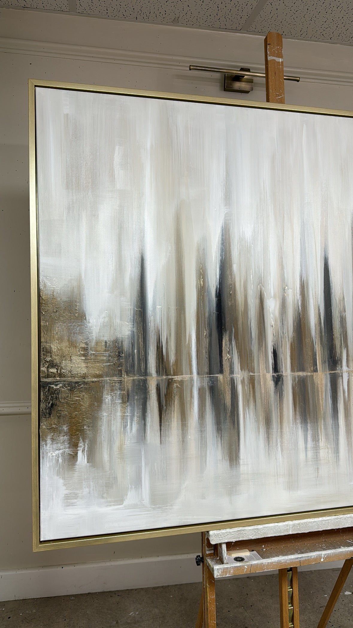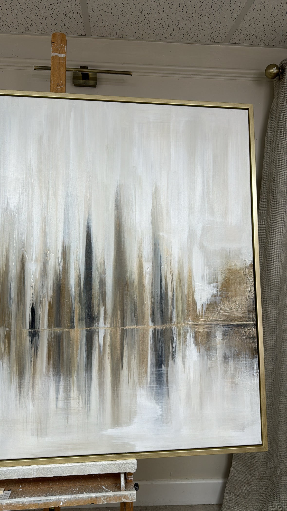 'Bronzed Skyline' Originally shown here is a cream, grey, white, black, mixed taupe, bronze with a gold centre - Featured is a 100x120 cm piece in champagne frame