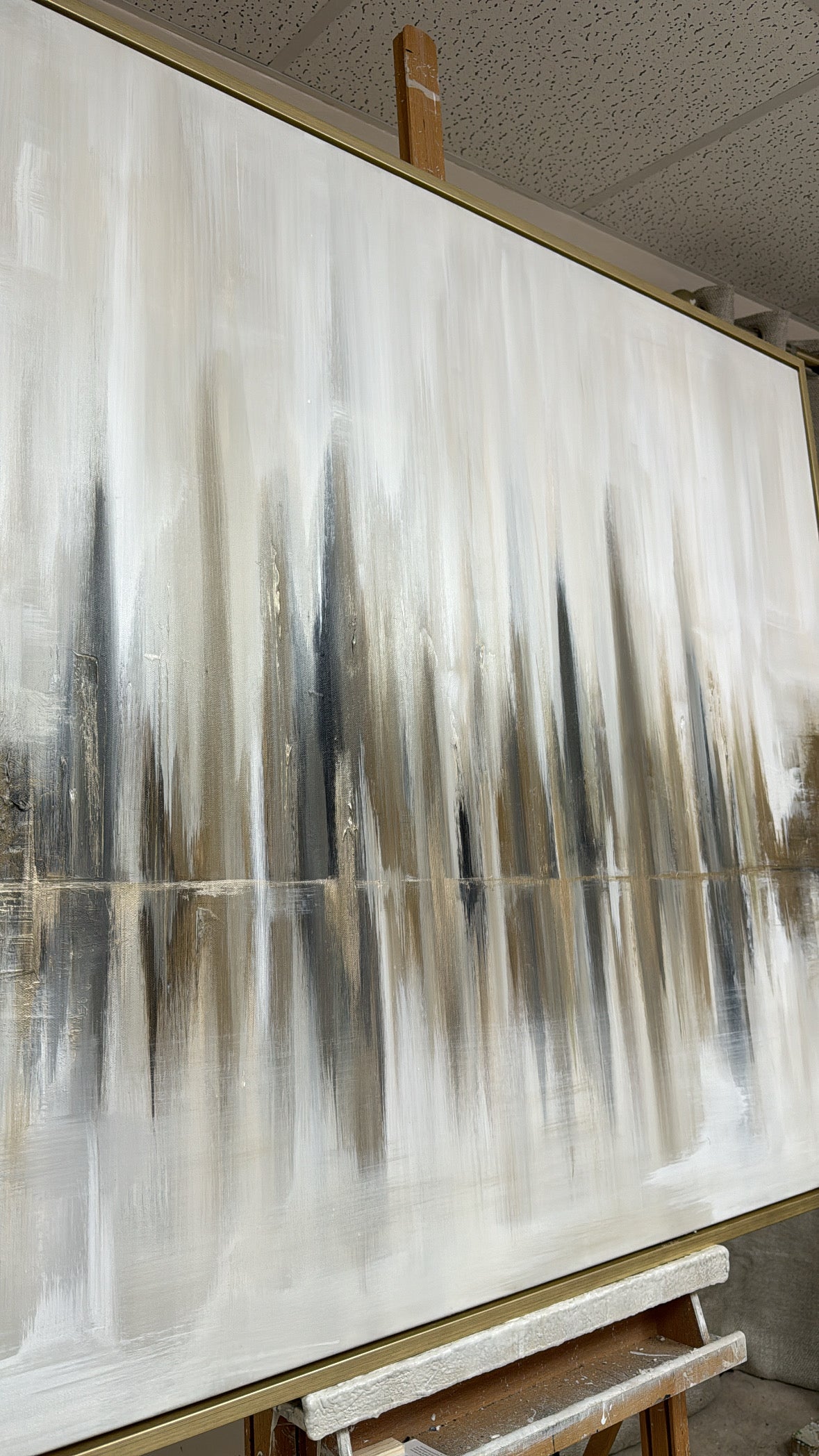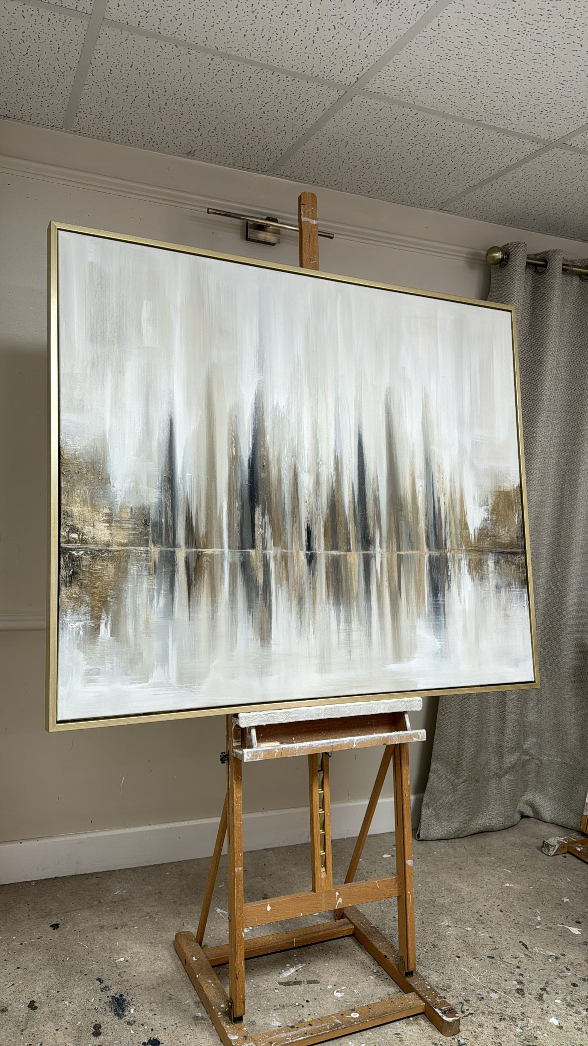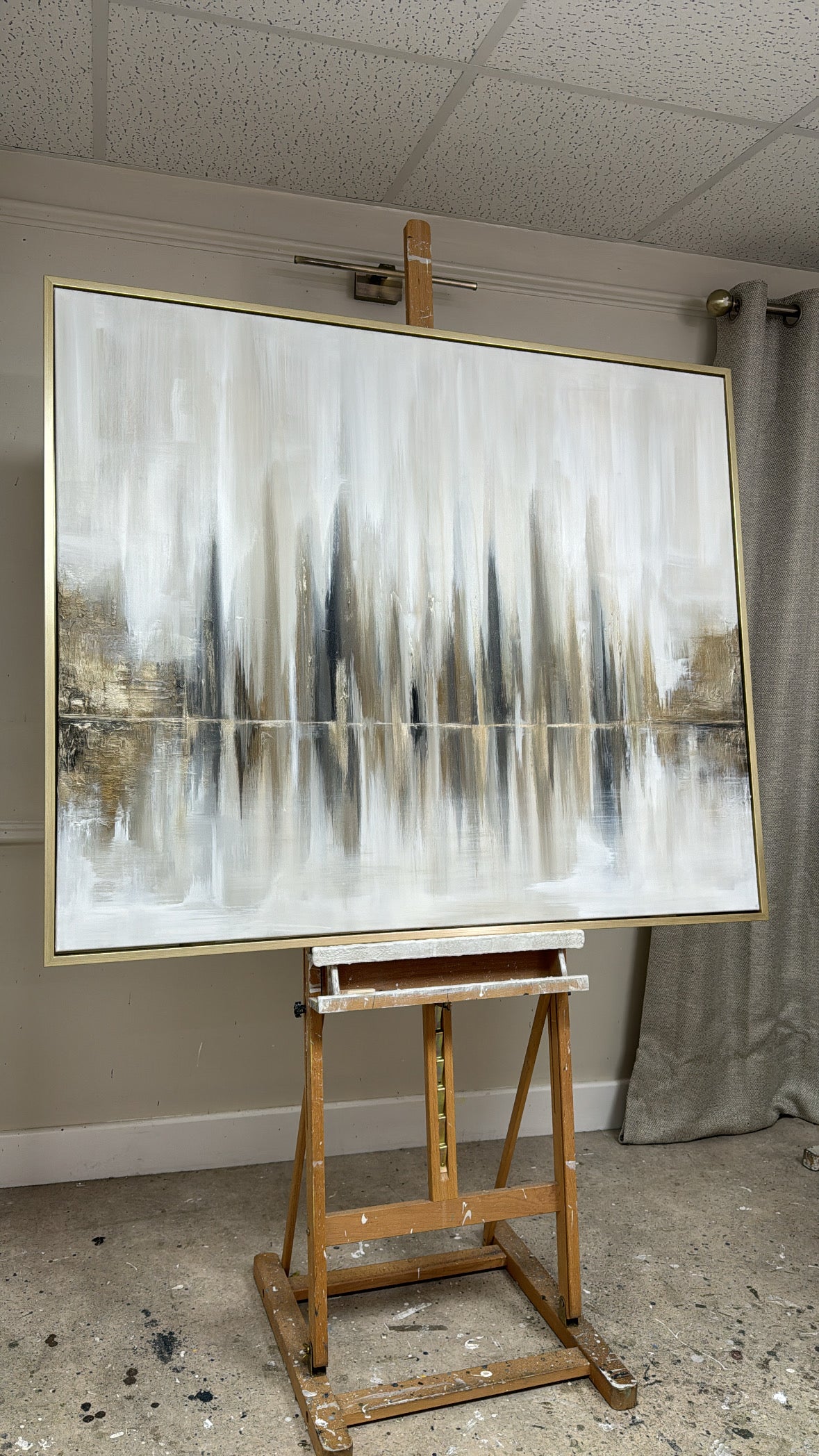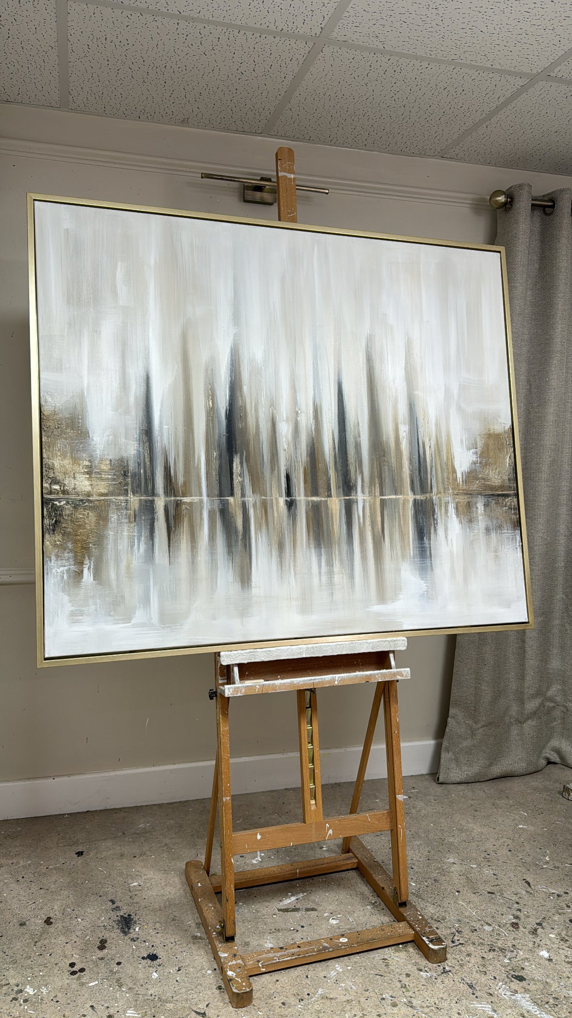 'Bronzed Skyline' Originally shown here is a cream, grey, white, black, mixed taupe, bronze with a gold centre - Featured is a 100x120 cm piece in champagne frame