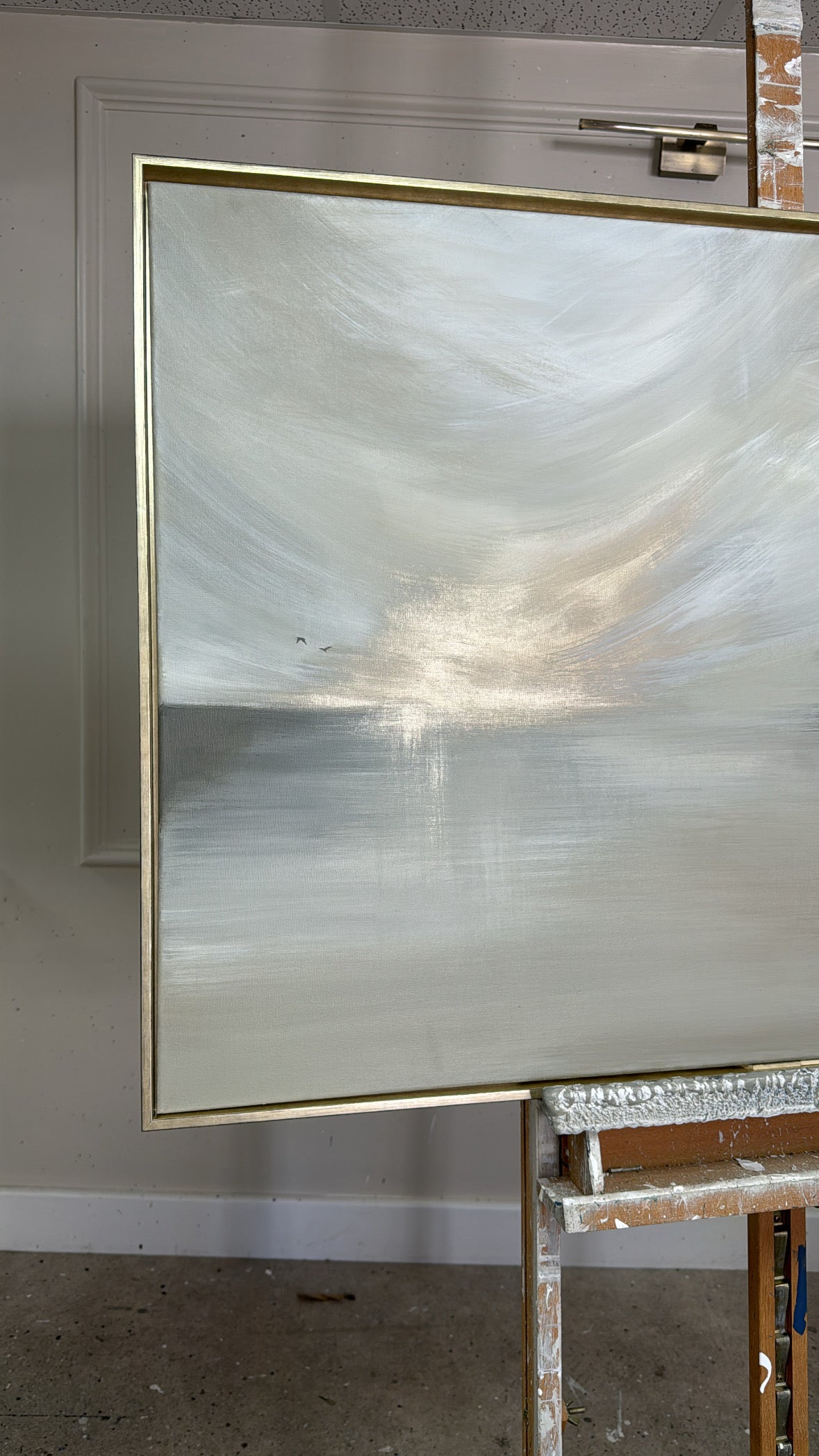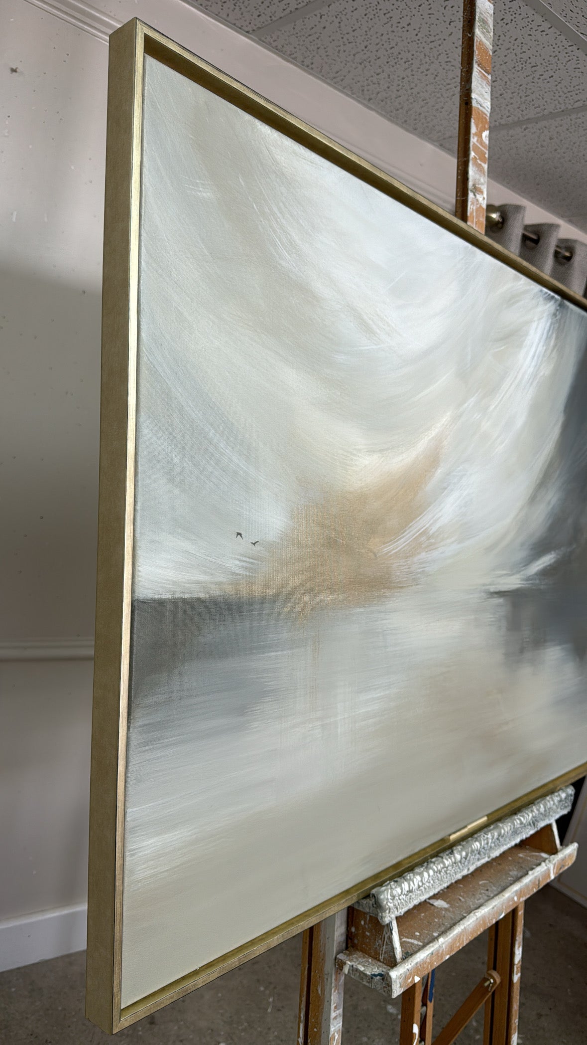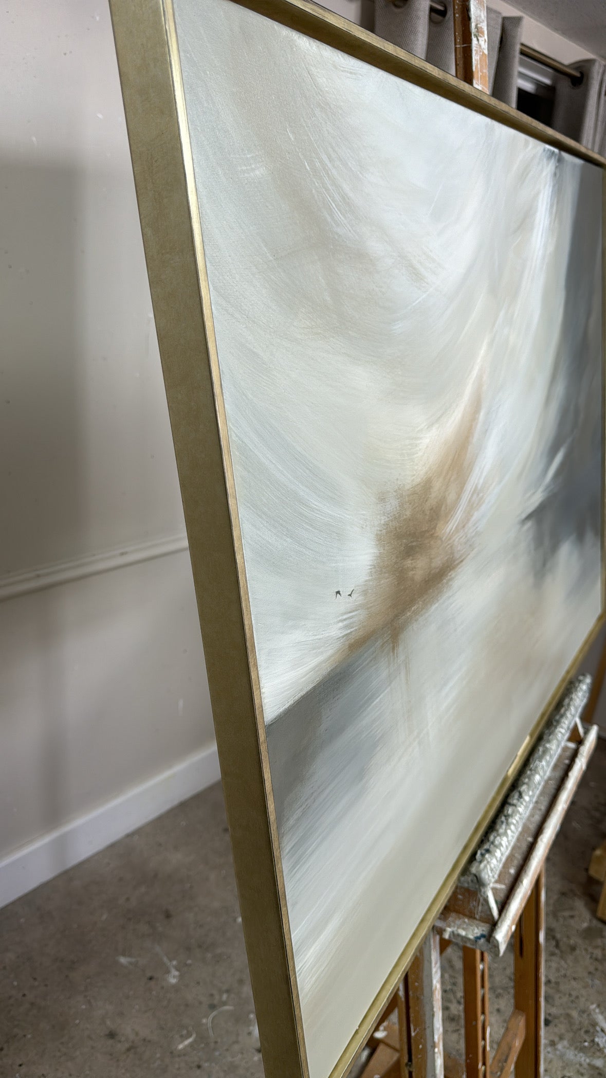 The Details - 'This Too Shall Pass' is a a cream, white, taupe, greige, grey and gold piece. This piece features two delicate birds. The size is a 100x70 cm piece in slim gold frame which brings the total measurements to approximately 103x73cn