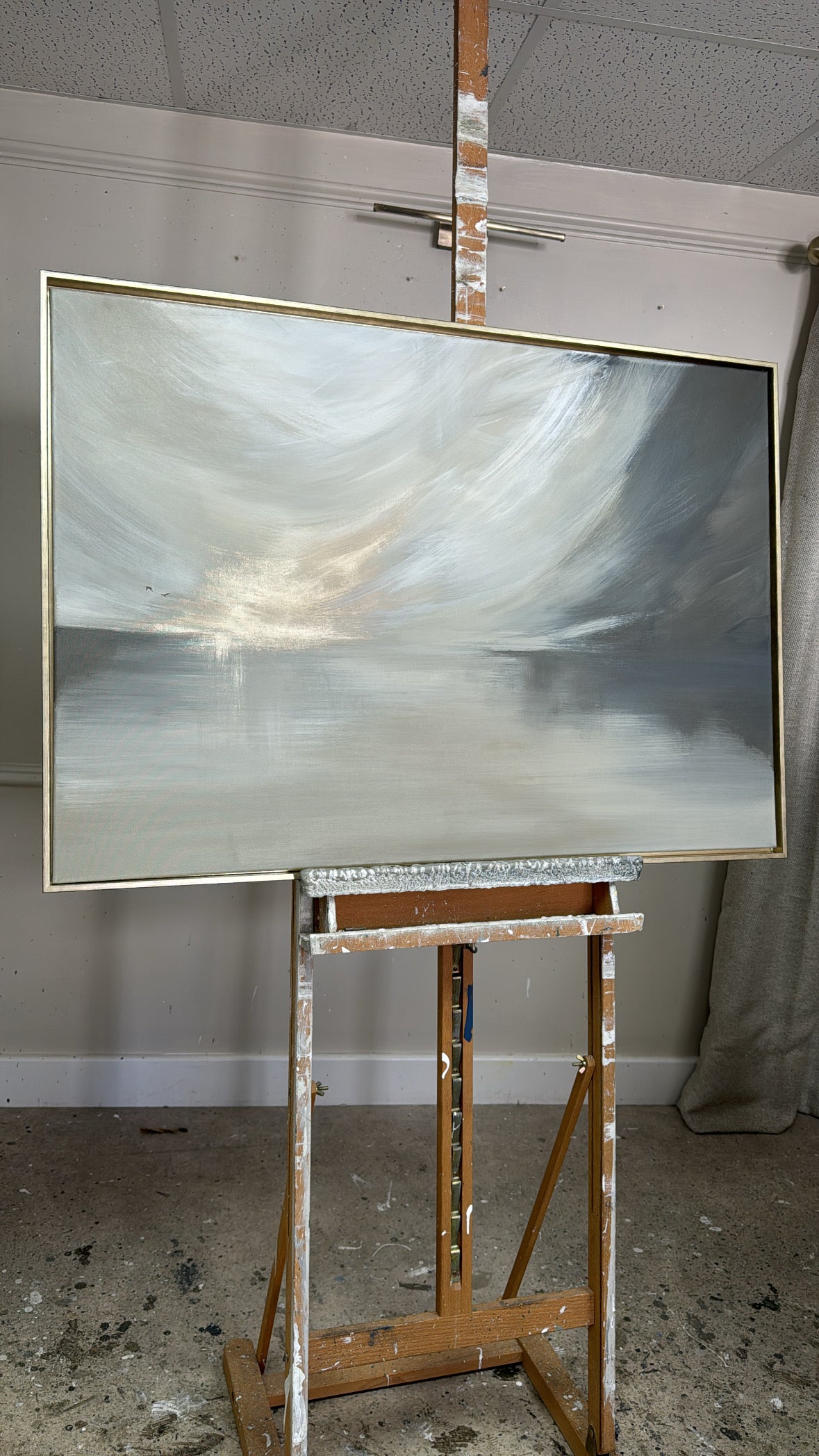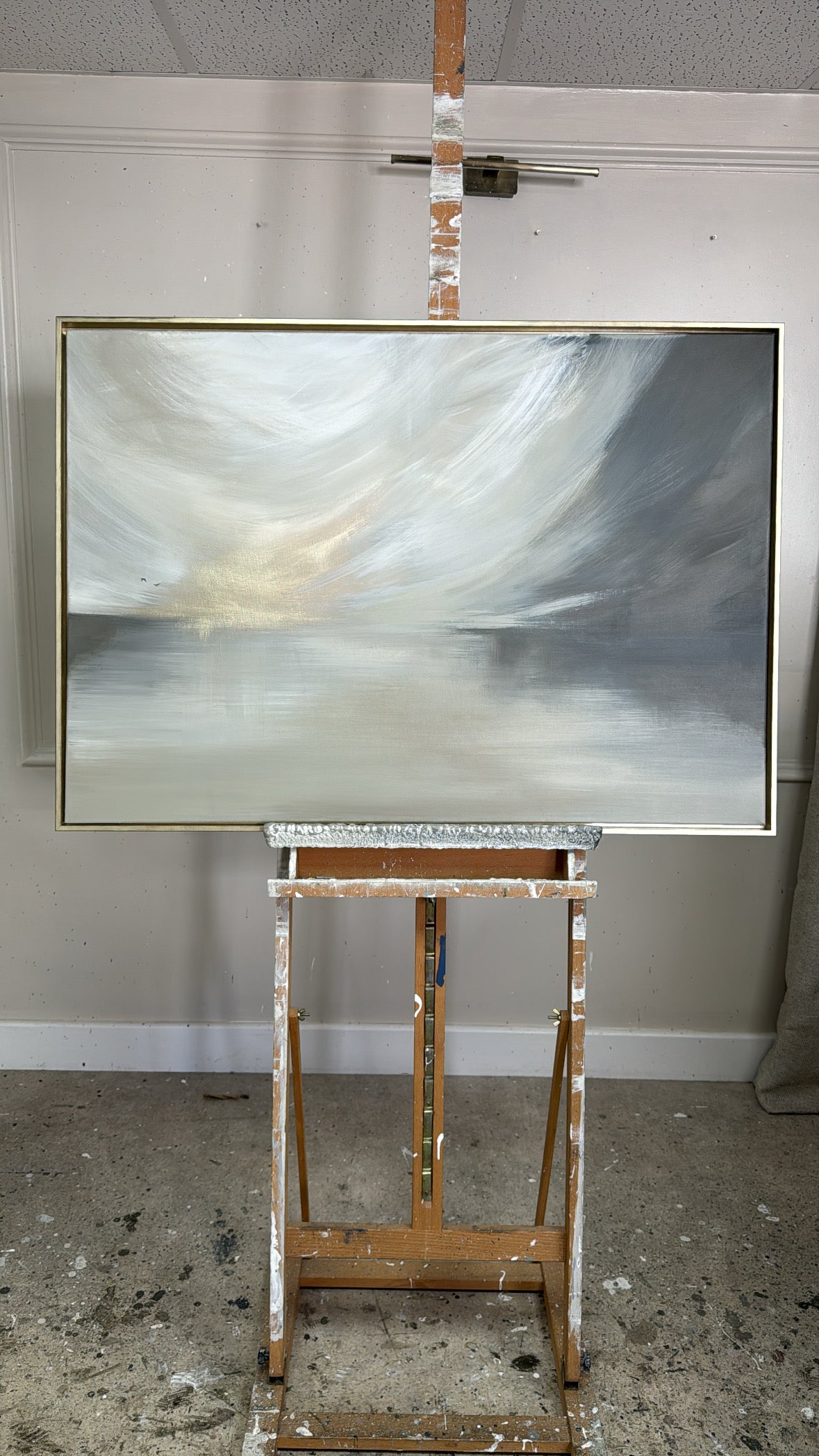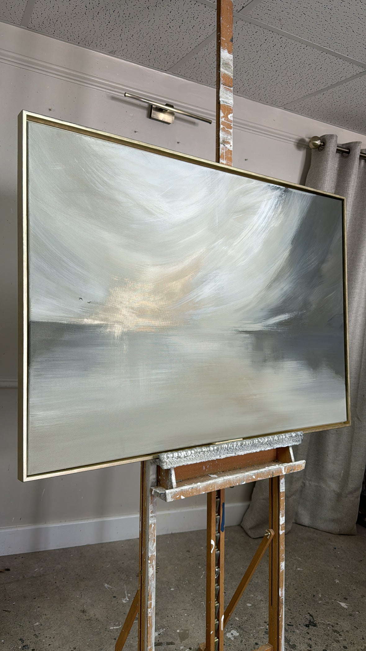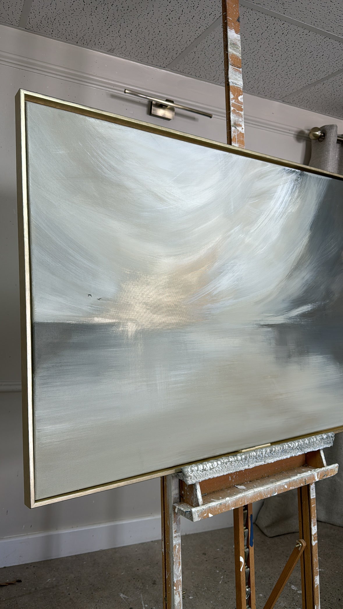 The Details - 'This Too Shall Pass' is a a cream, white, taupe, greige, grey and gold piece. This piece features two delicate birds. The size is a 100x70 cm piece in slim gold frame which brings the total measurements to approximately 103x73cn