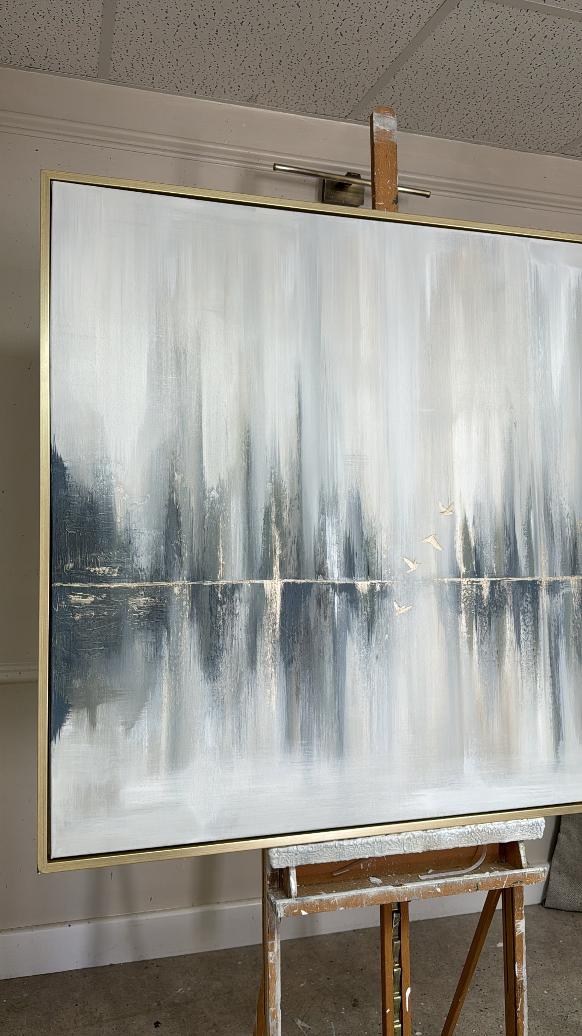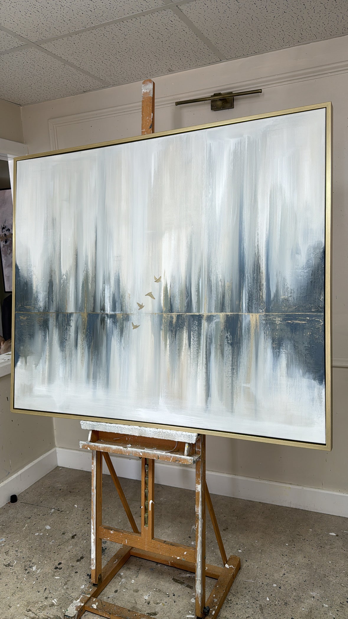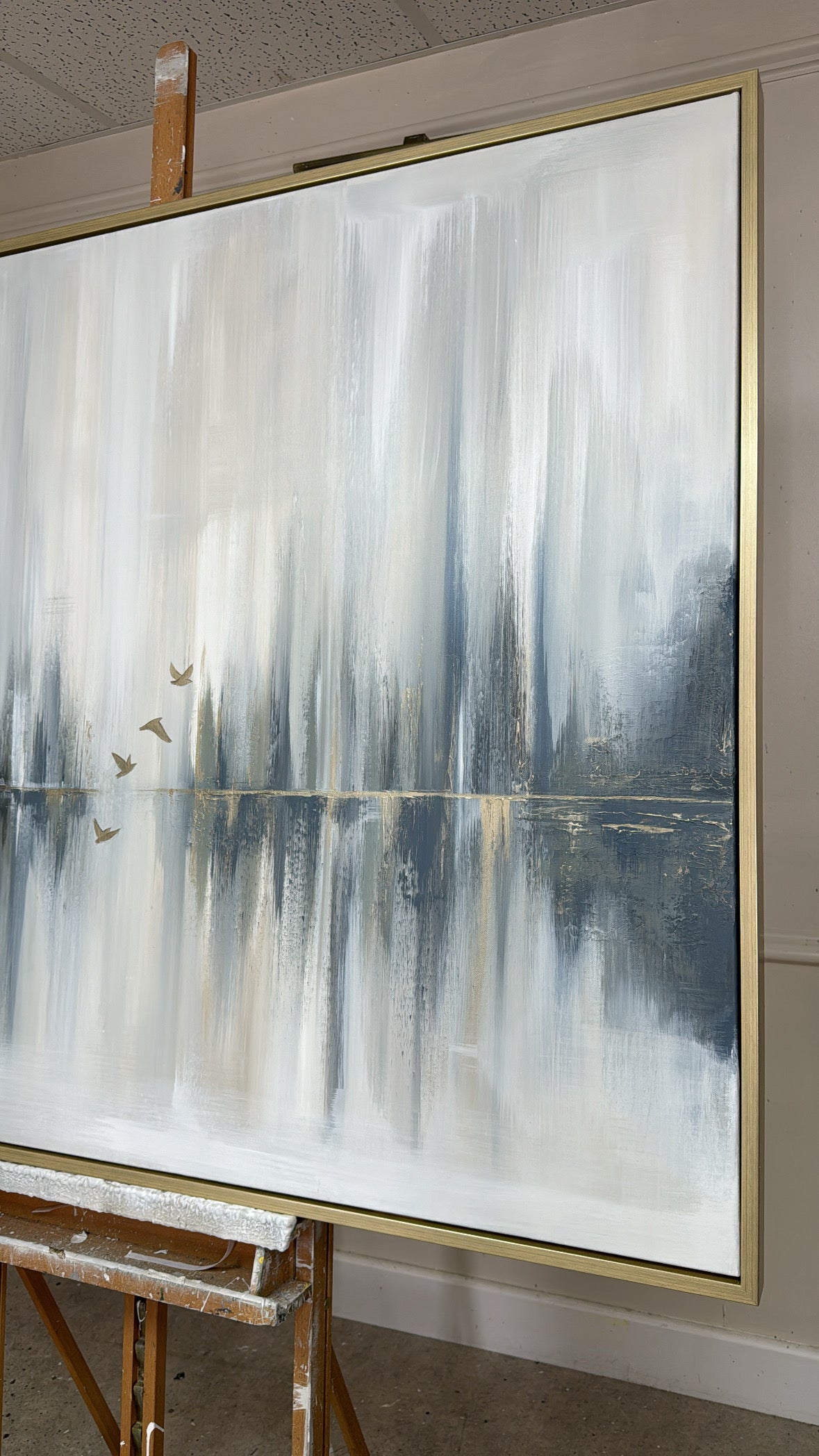 'Sapphire City' Originally shown here is a cream, greige, white, dusky blues and navy and gold piece with 4 gold and tan birds - Featured is a 100x120 cm piece in champagne frame
