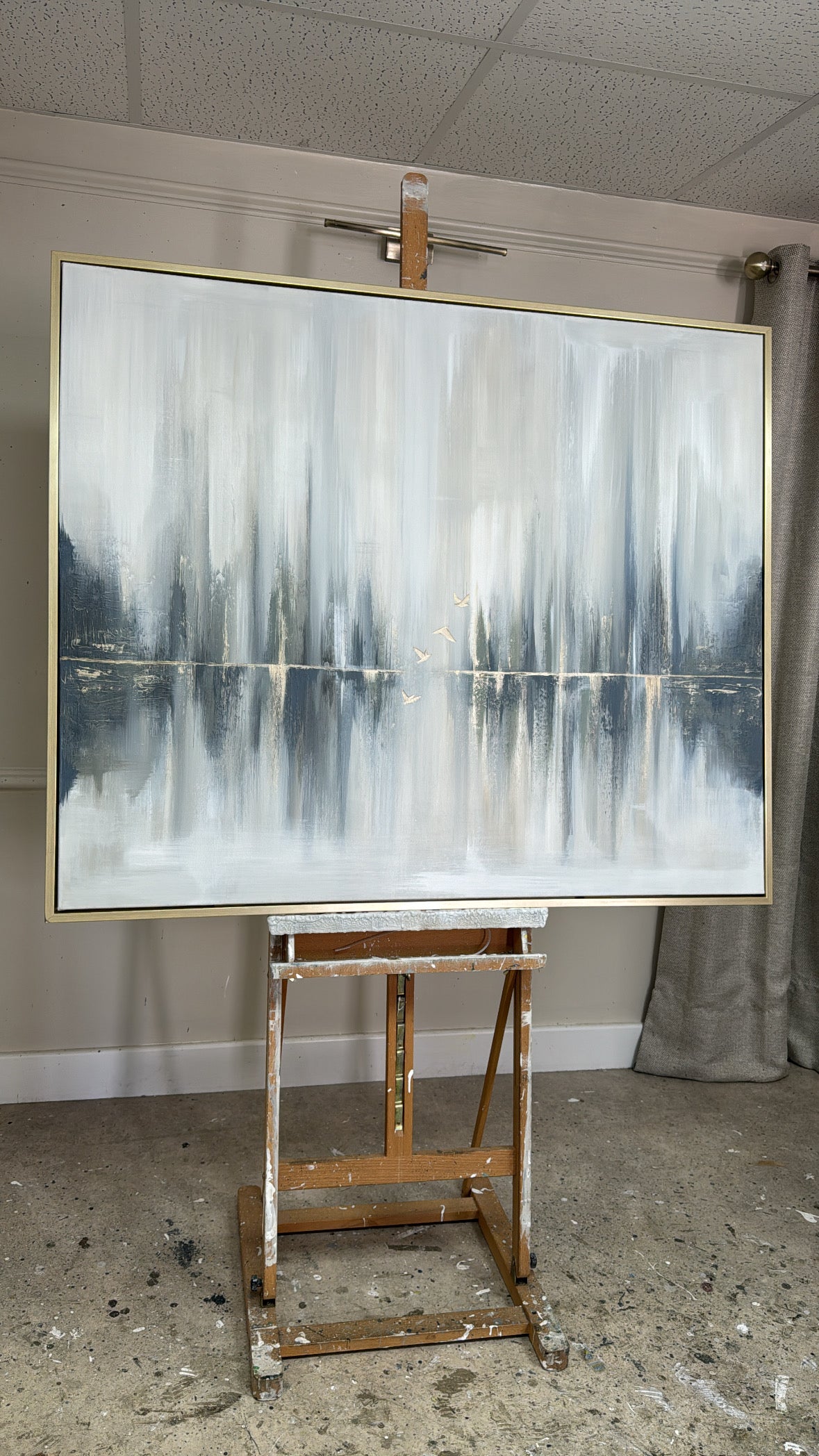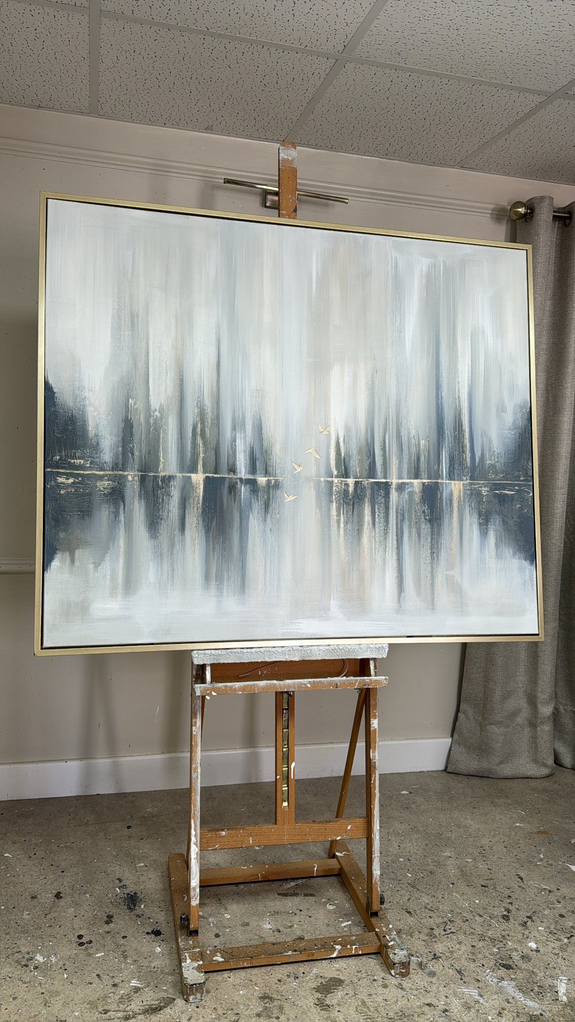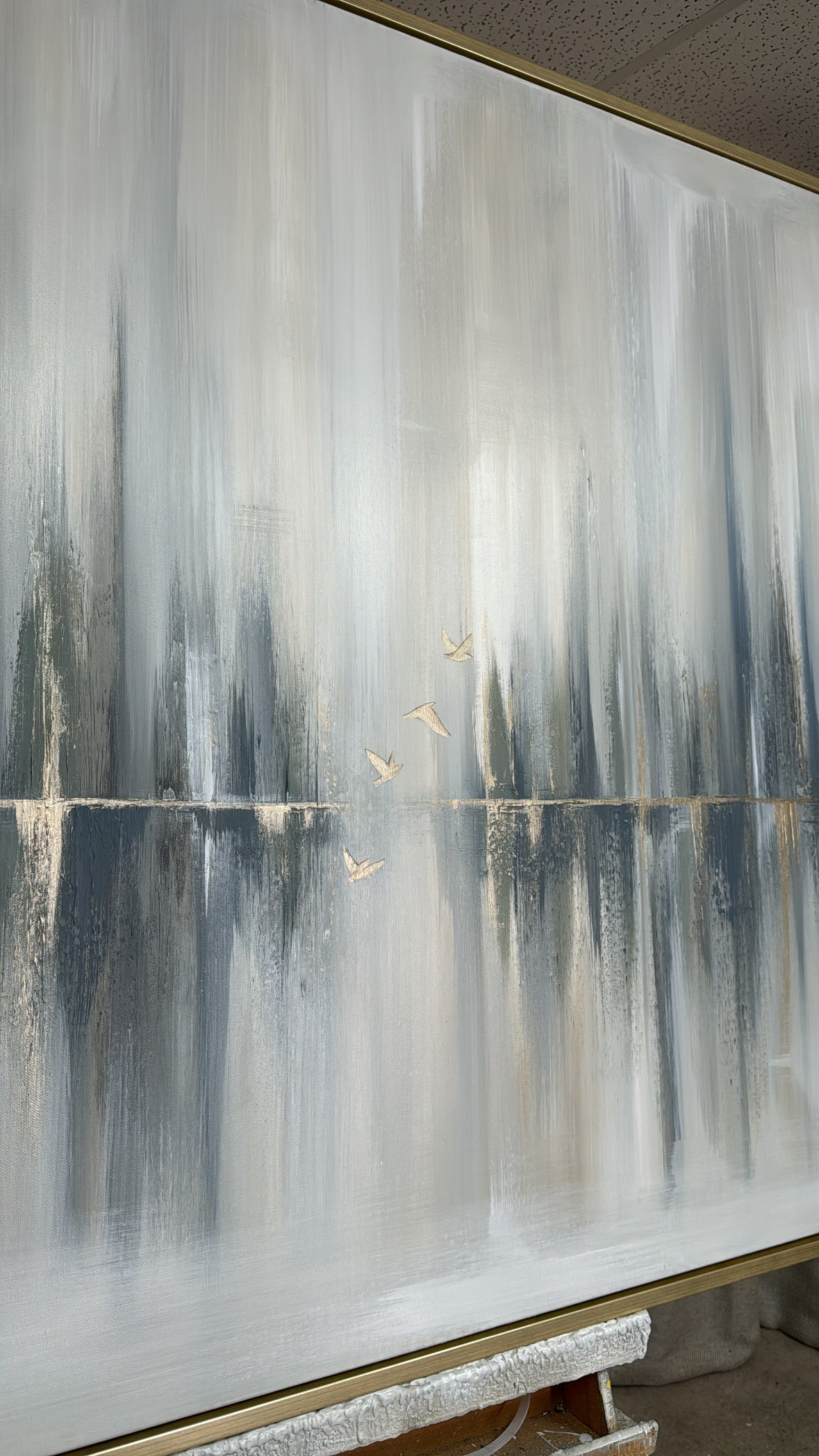'Sapphire City' Originally shown here is a cream, greige, white, dusky blues and navy and gold piece with 4 gold and tan birds - Featured is a 100x120 cm piece in champagne frame