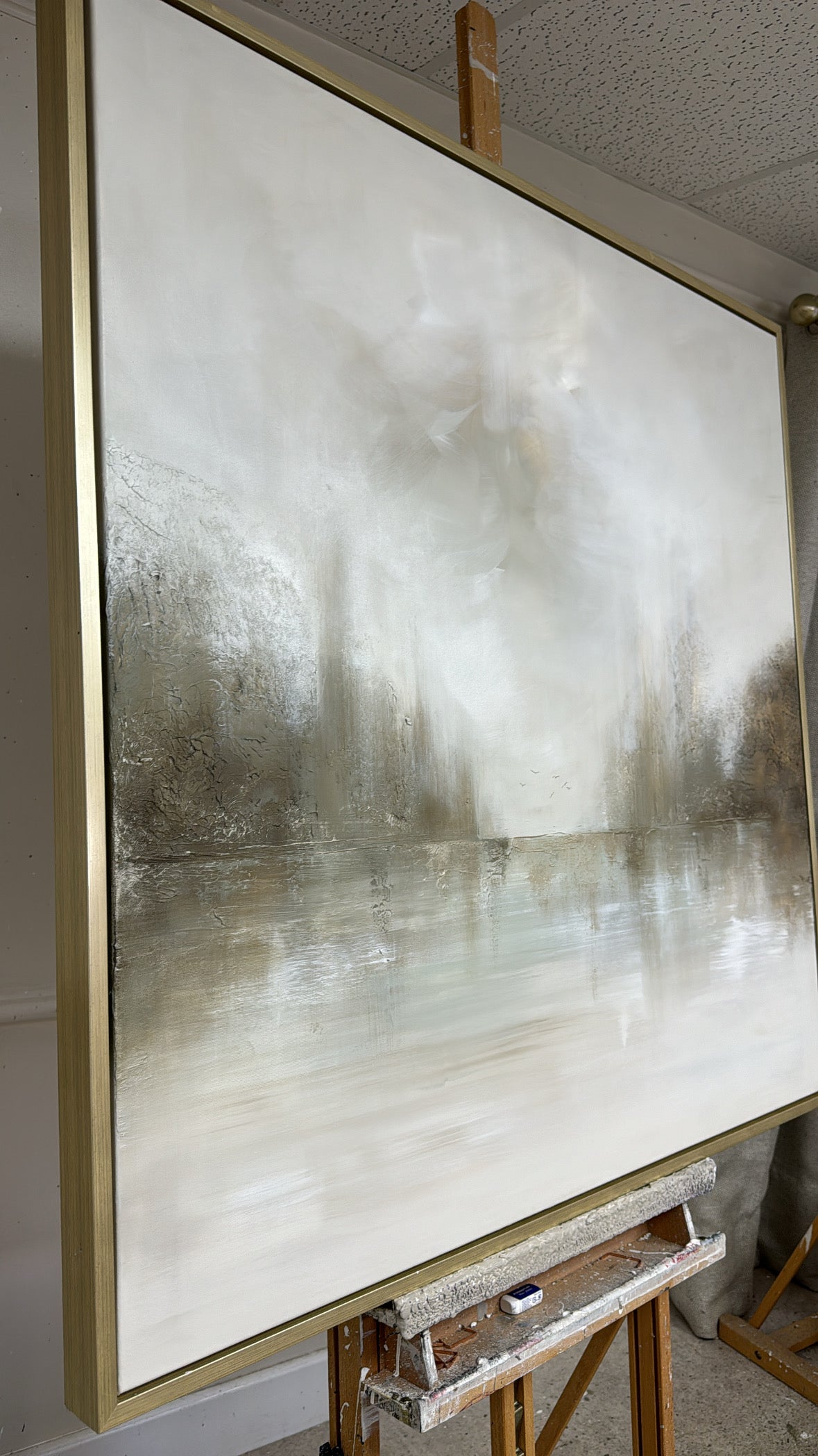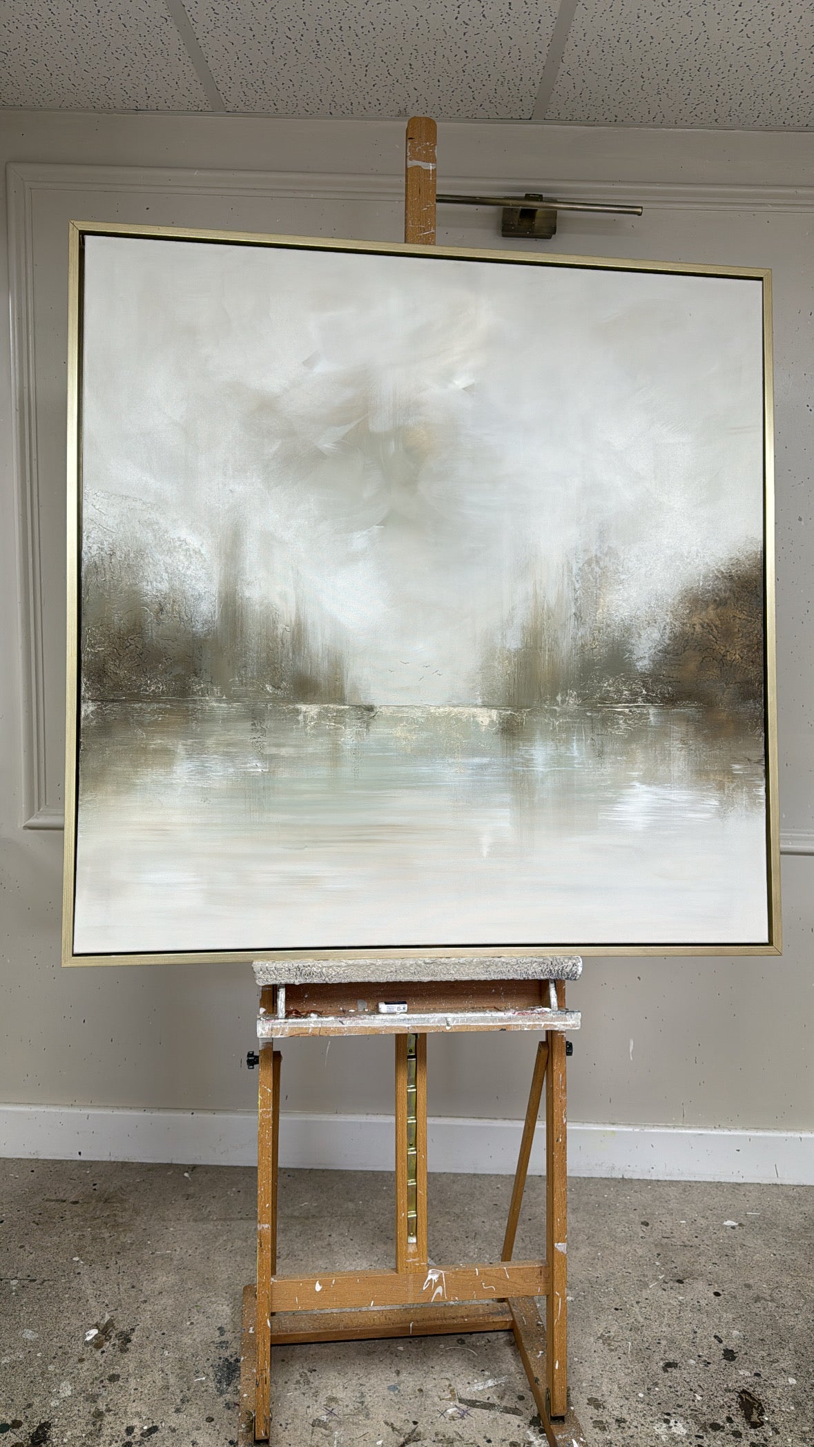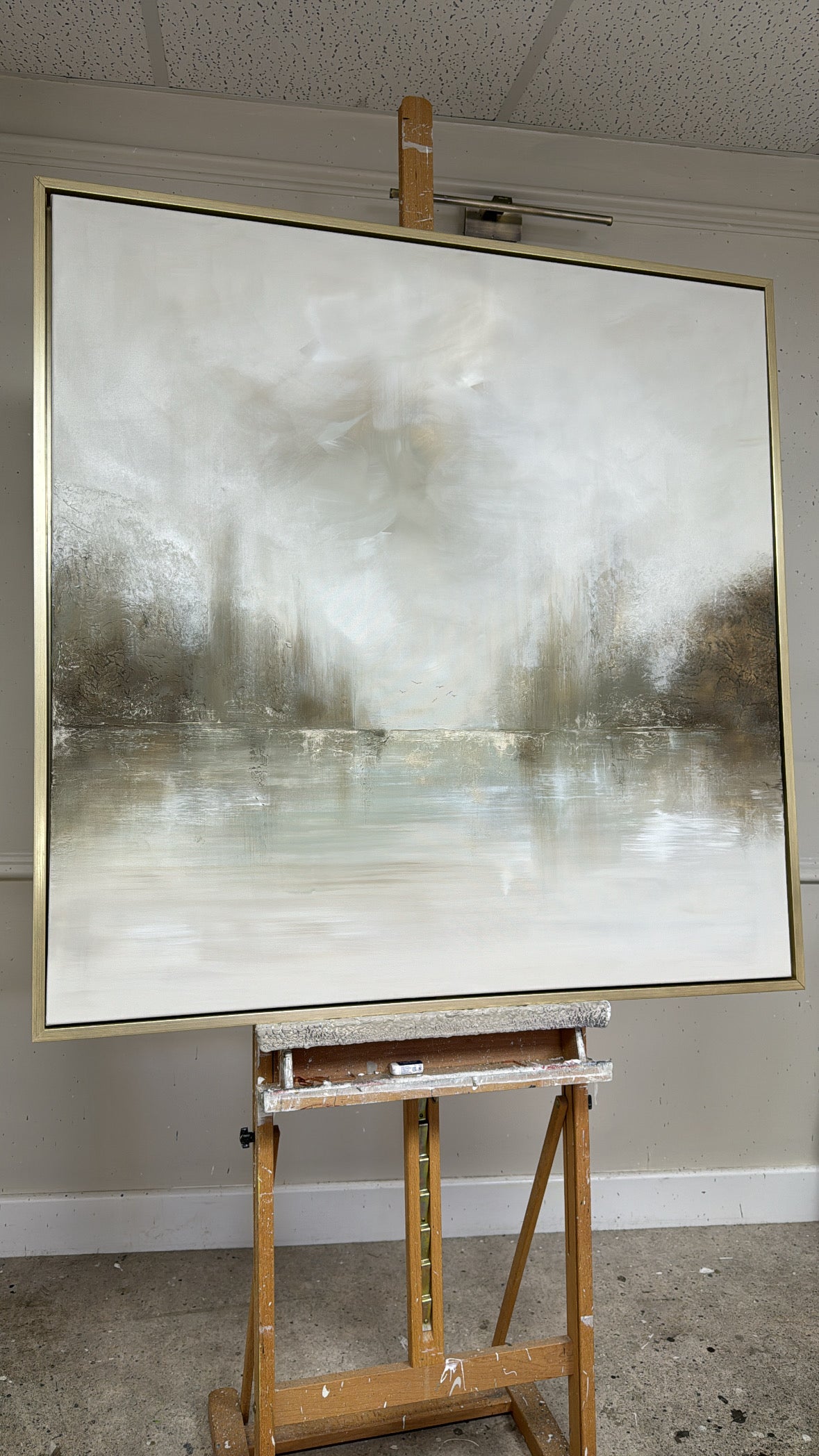 The Details - ''Crawdads" is a heavily textured piece, Coloured with dusky greens and neutrals and lashings of gold and two little birds. The size is a 100x100cm and is resting in a gold frame which brings the total measurements to approximately 104x104cm