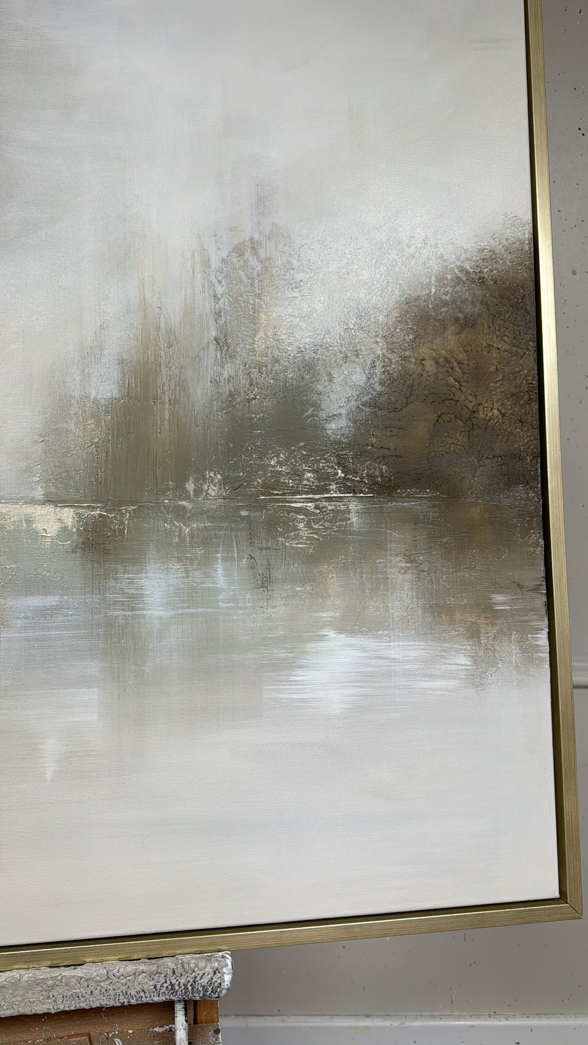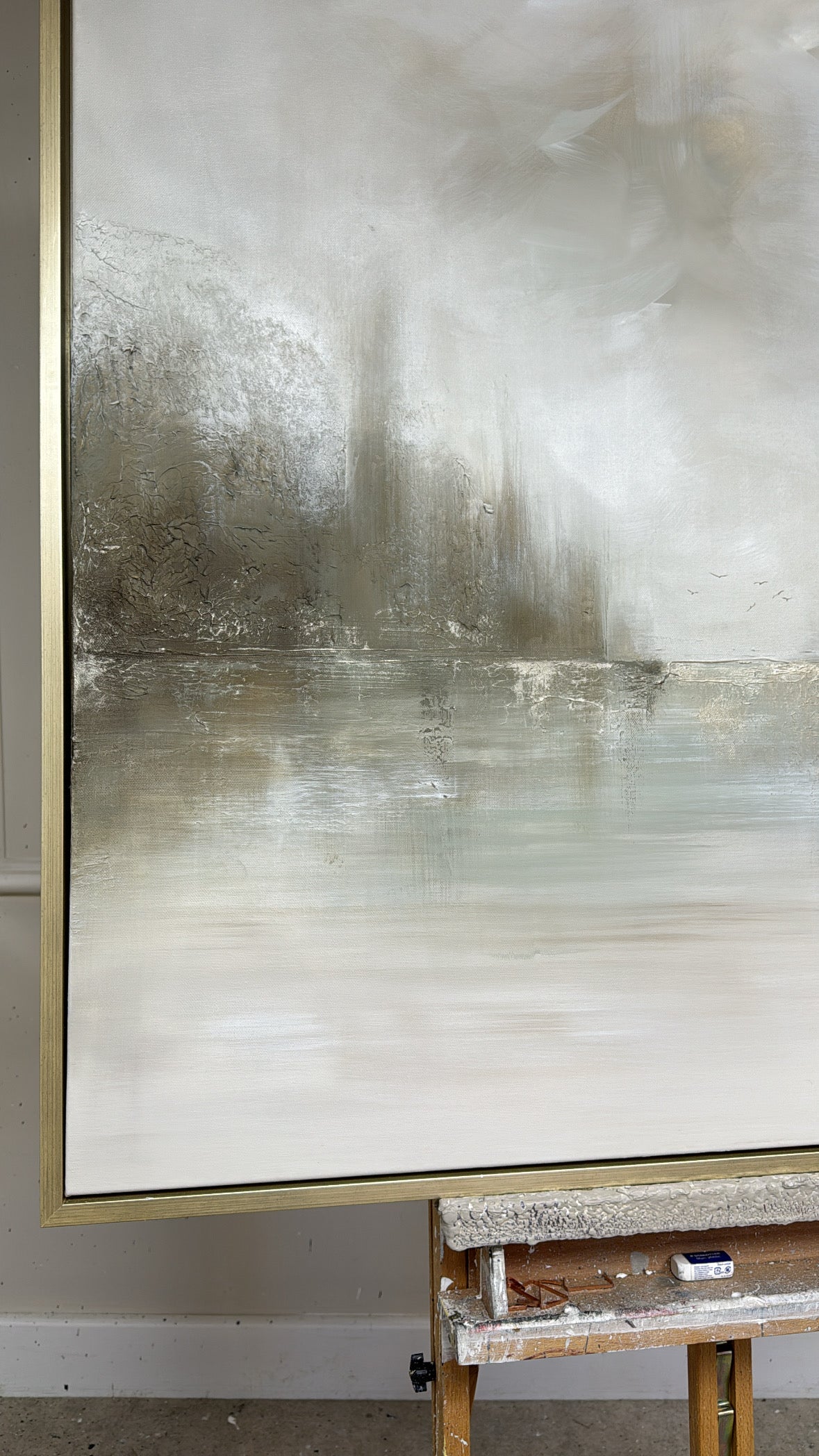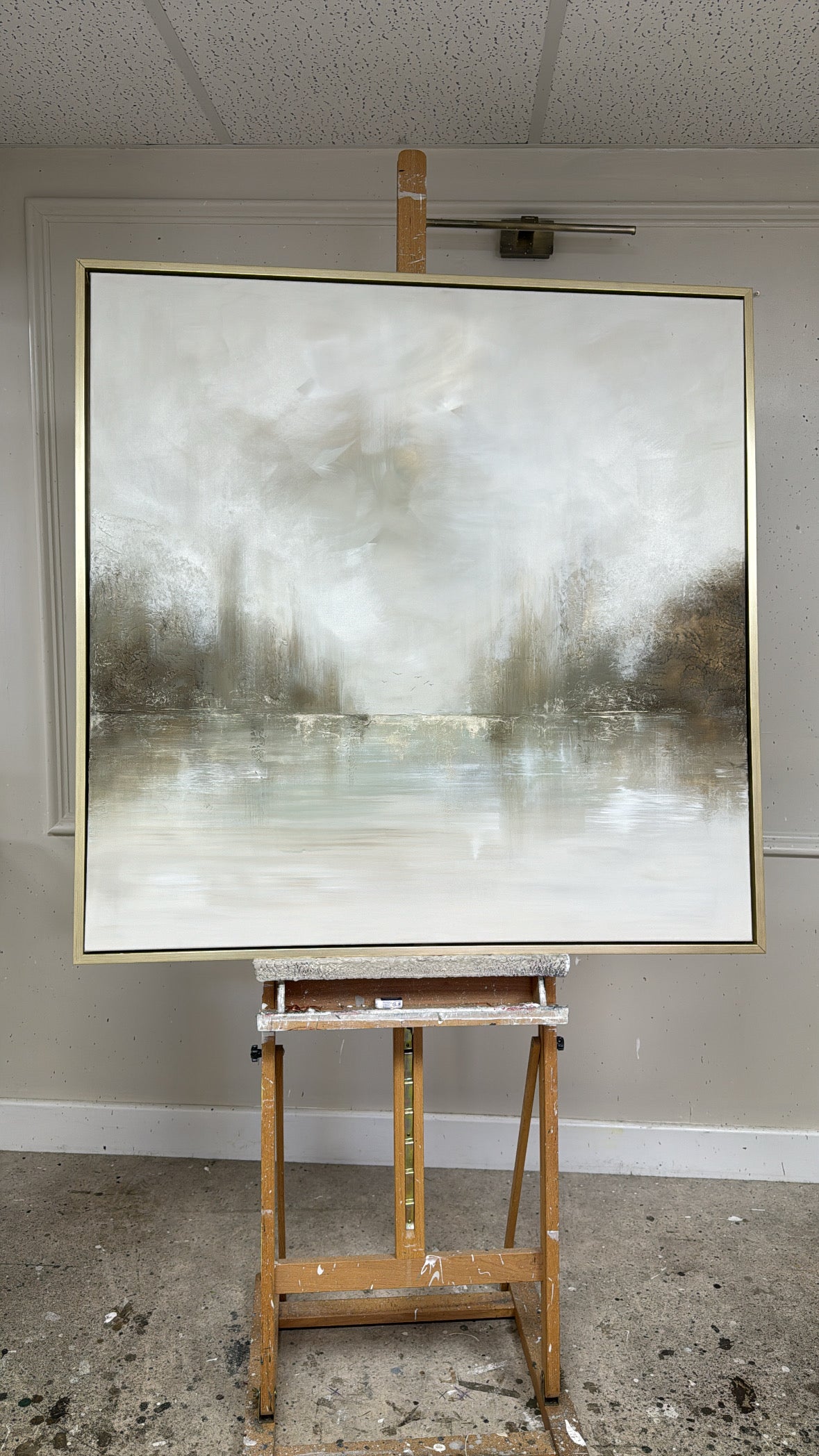 The Details - ''Crawdads" is a heavily textured piece, Coloured with dusky greens and neutrals and lashings of gold and two little birds. The size is a 100x100cm and is resting in a gold frame which brings the total measurements to approximately 104x104cm