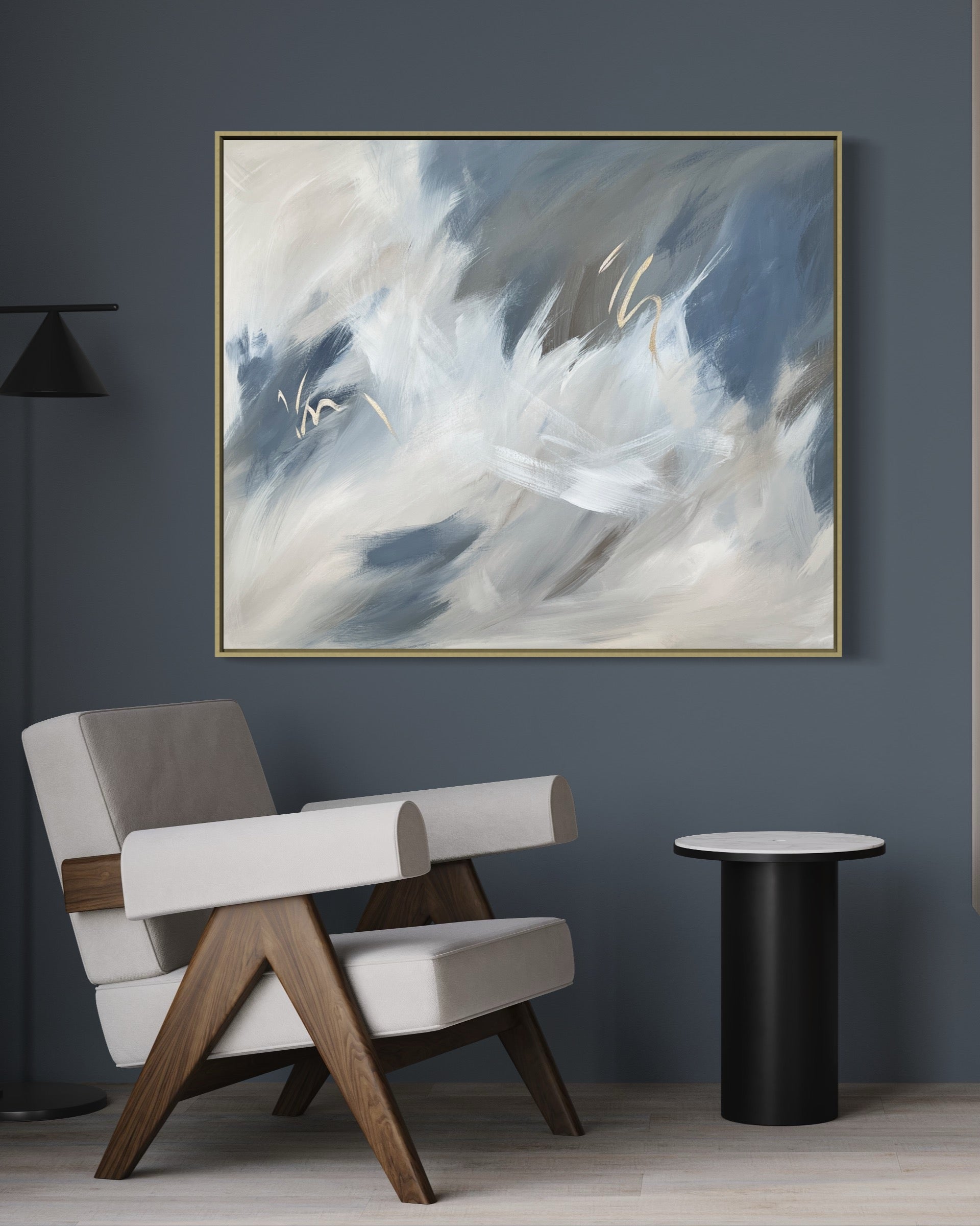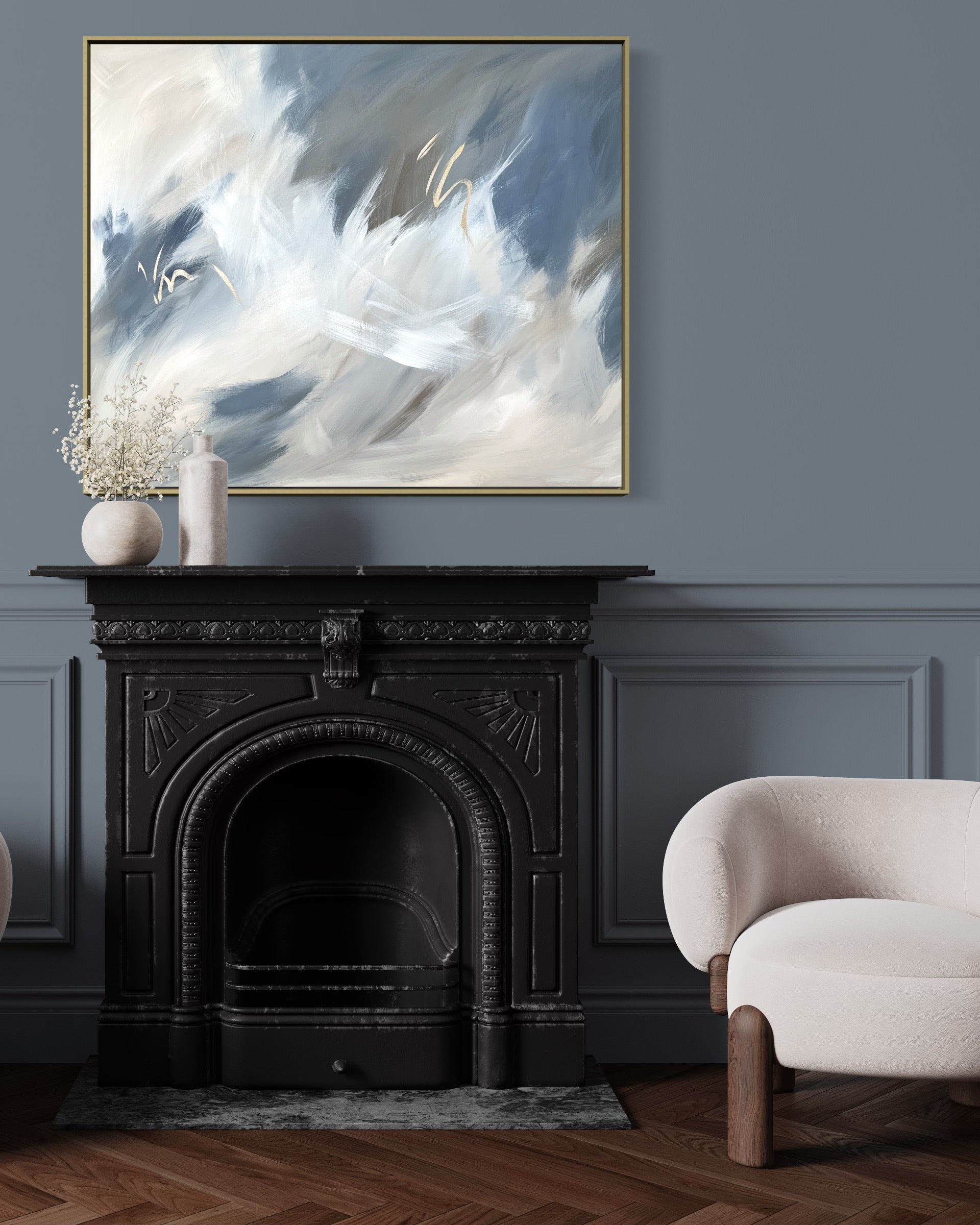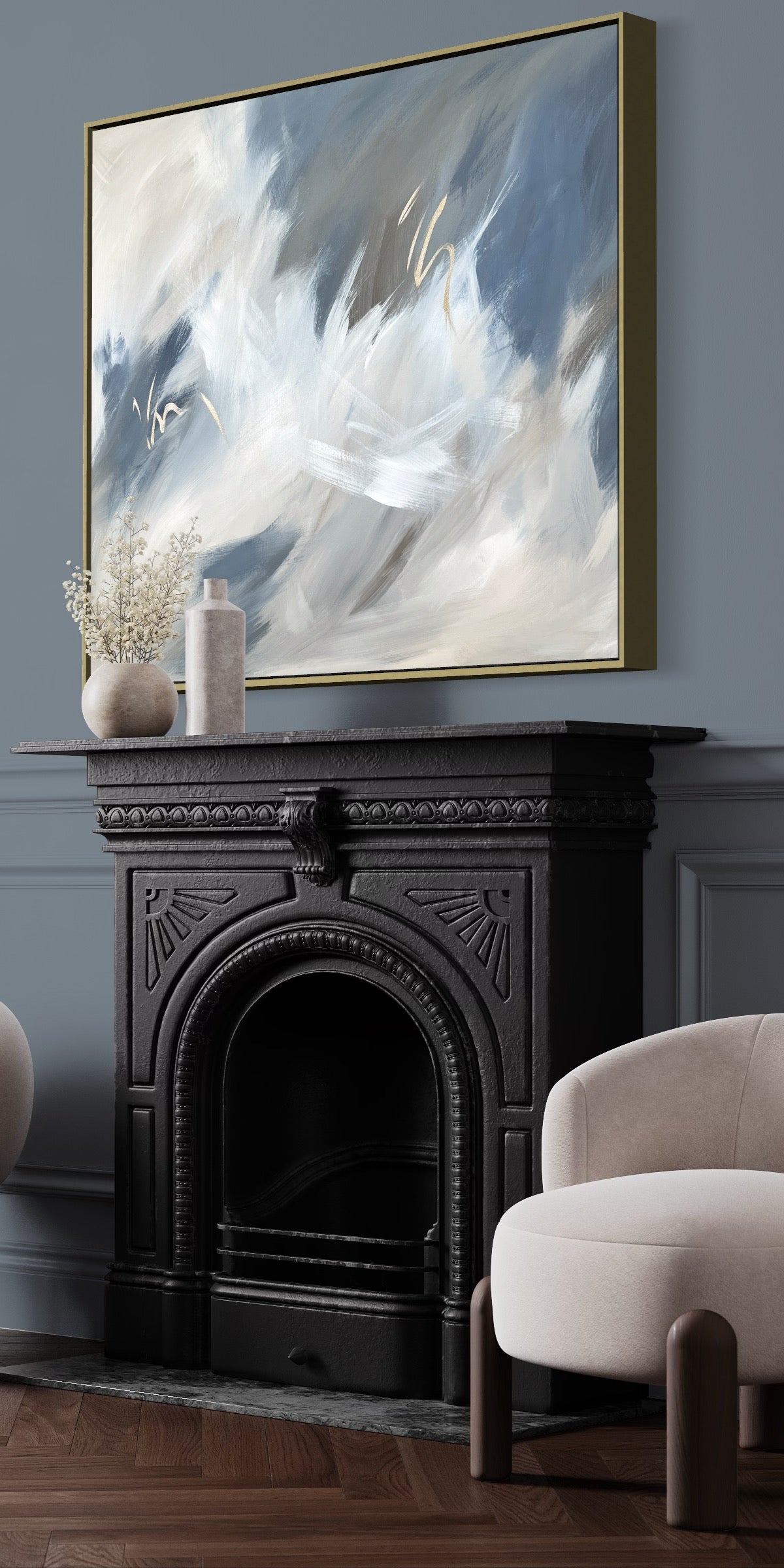 'Halcyon' Originally shown here dusky cornflower blue and denim shades. surrounded by earthy shades of browns and taupe, cream, grey, off whites and golden metallic elements, In size 100 x 120 cm