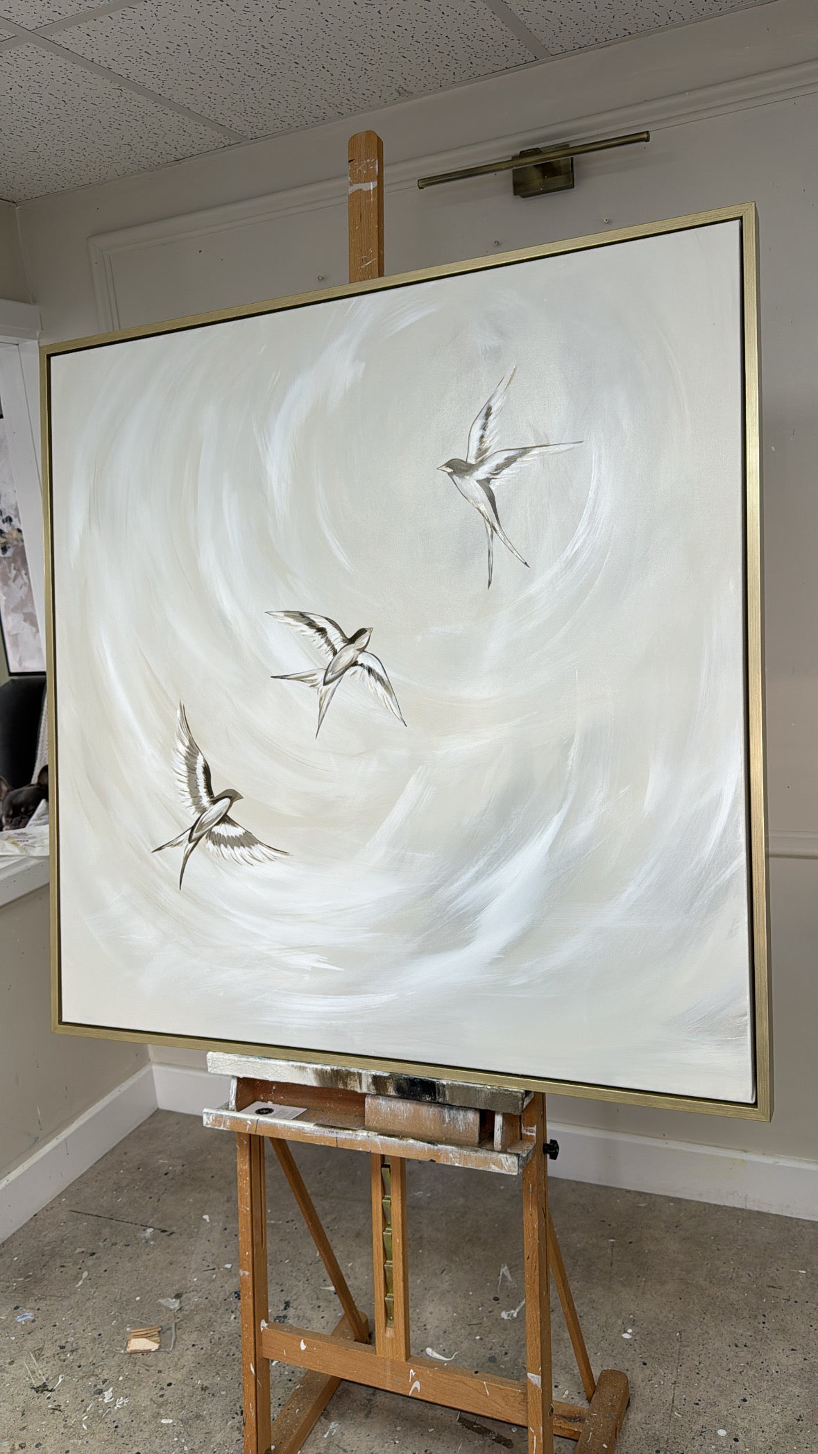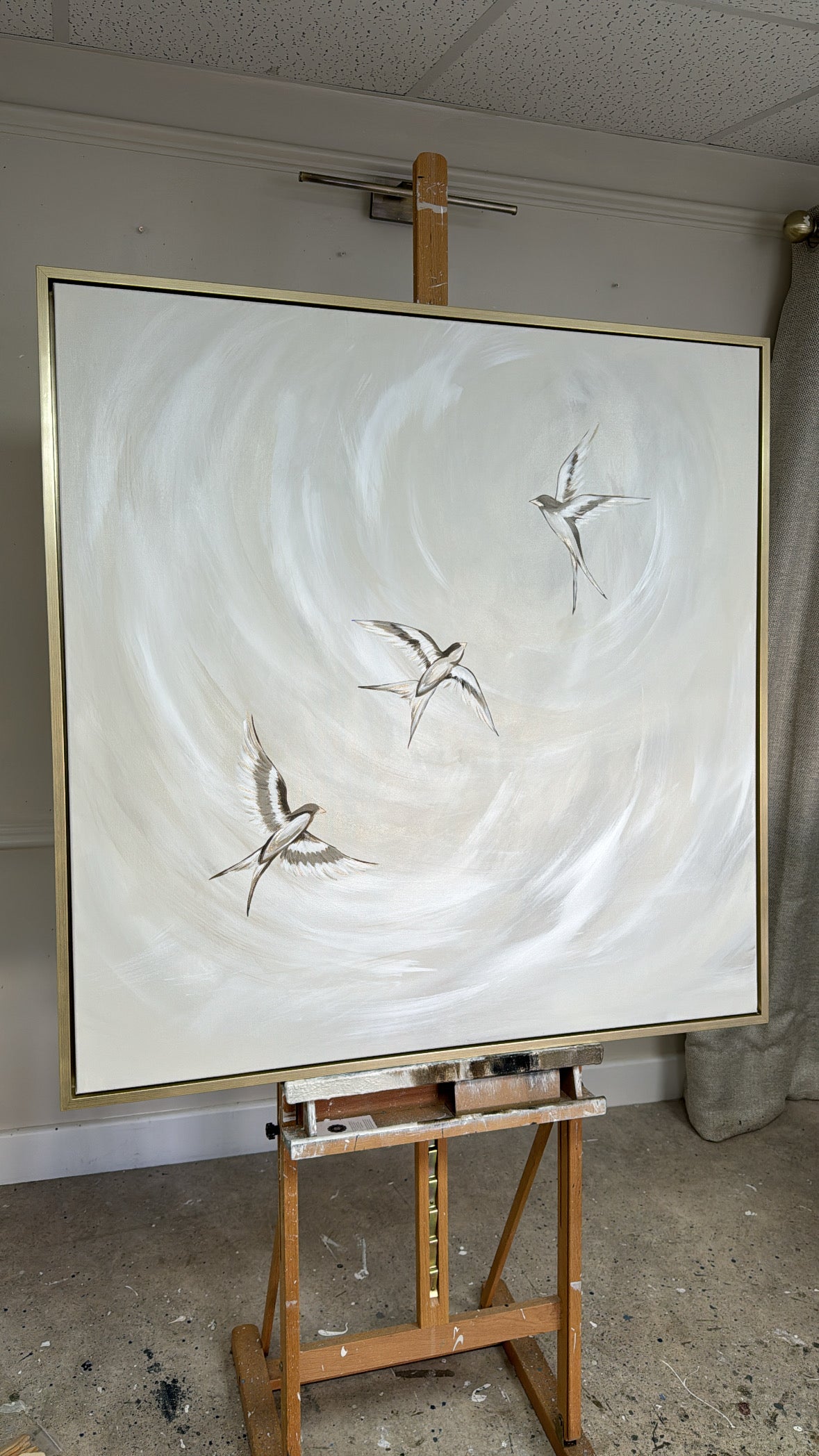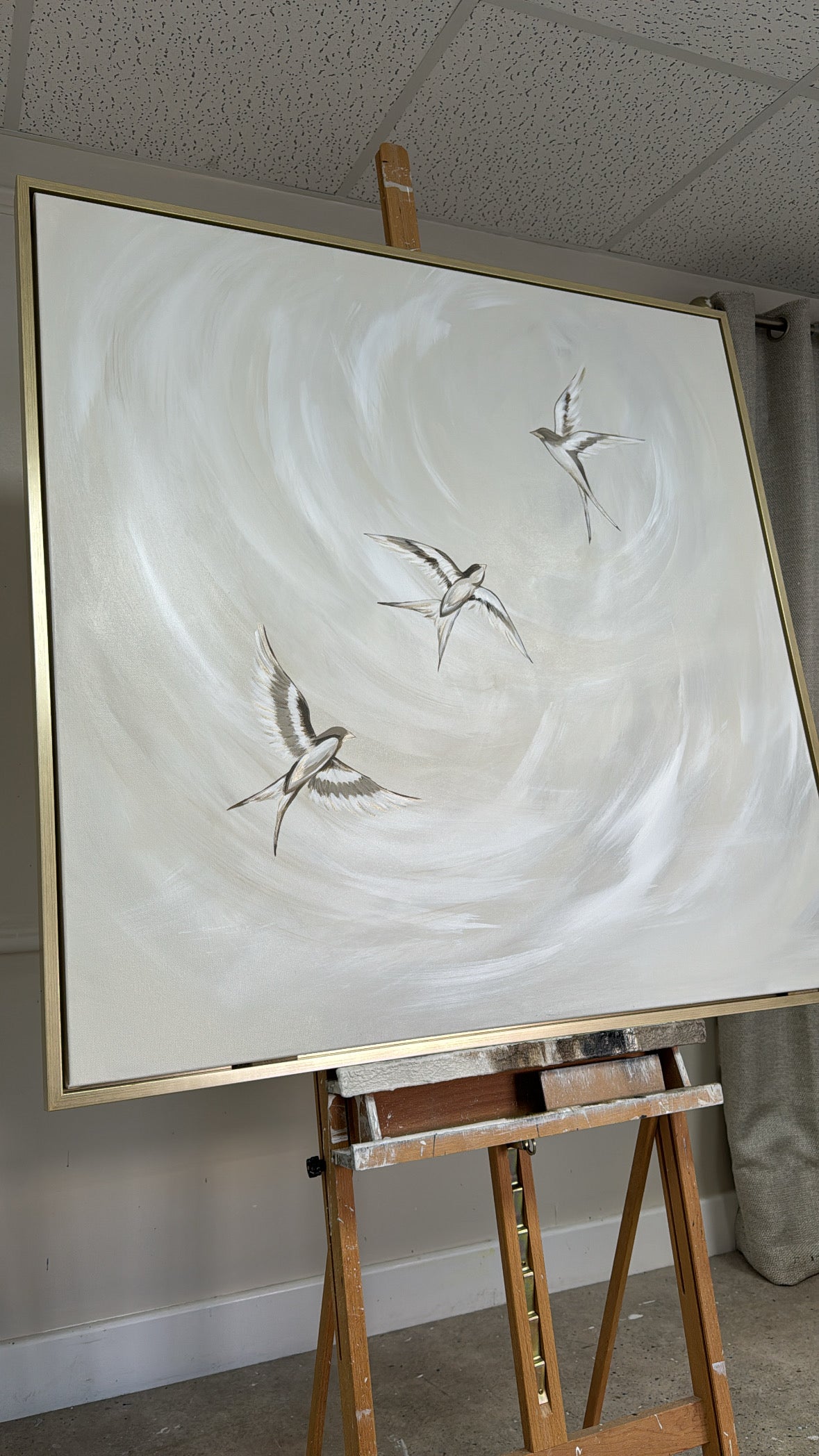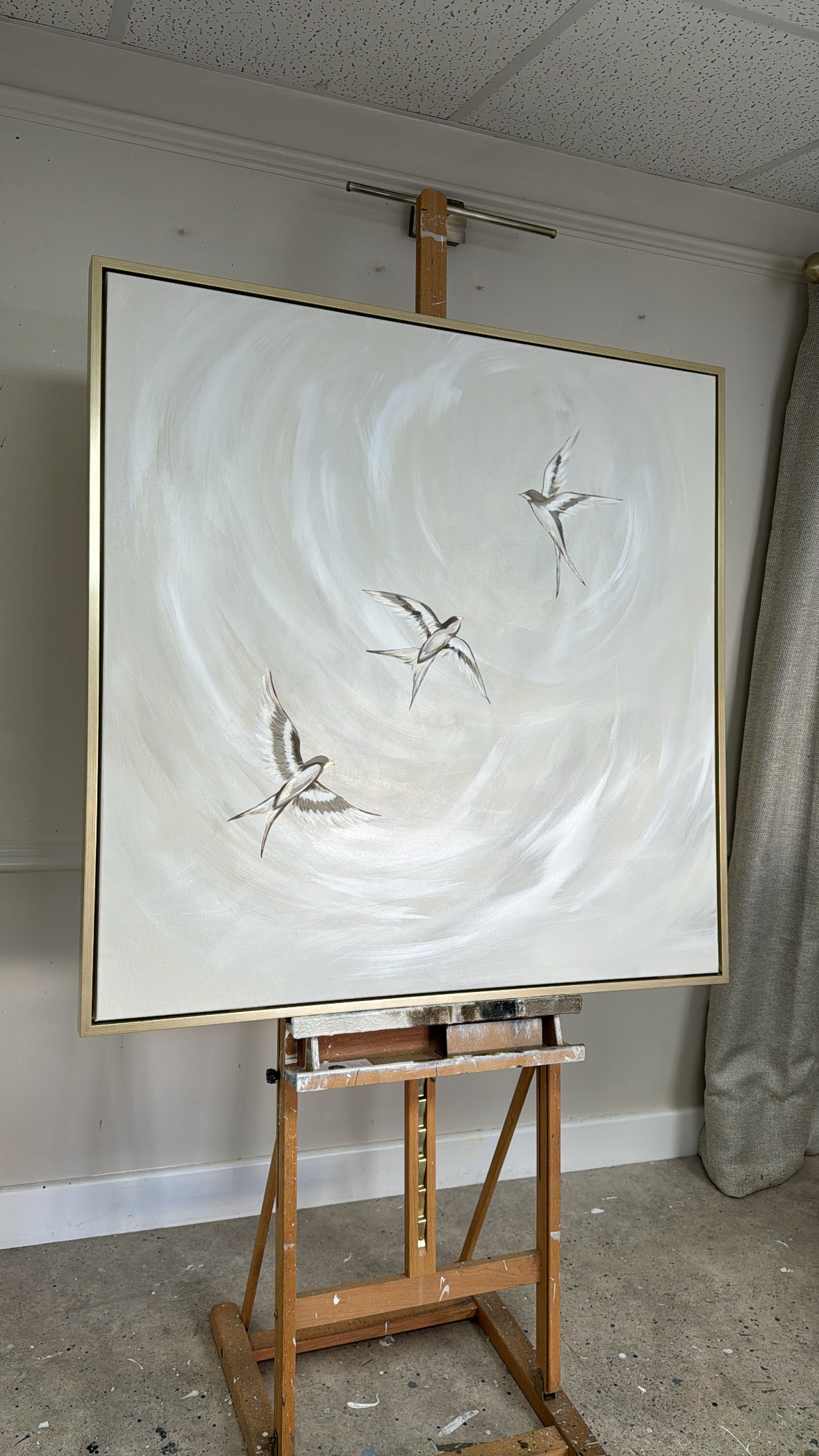 'Harmony' is a light and airy, soft cream, warm light grey and off white peaceful artwork on canvas with three brown white and gold birds with golden beaks. The canvas size is 100x100cm and is resting in a champagne gold frame (Please note framing adds around 3-4cm all round dependant on frame option selected) Framing is included in the cost.