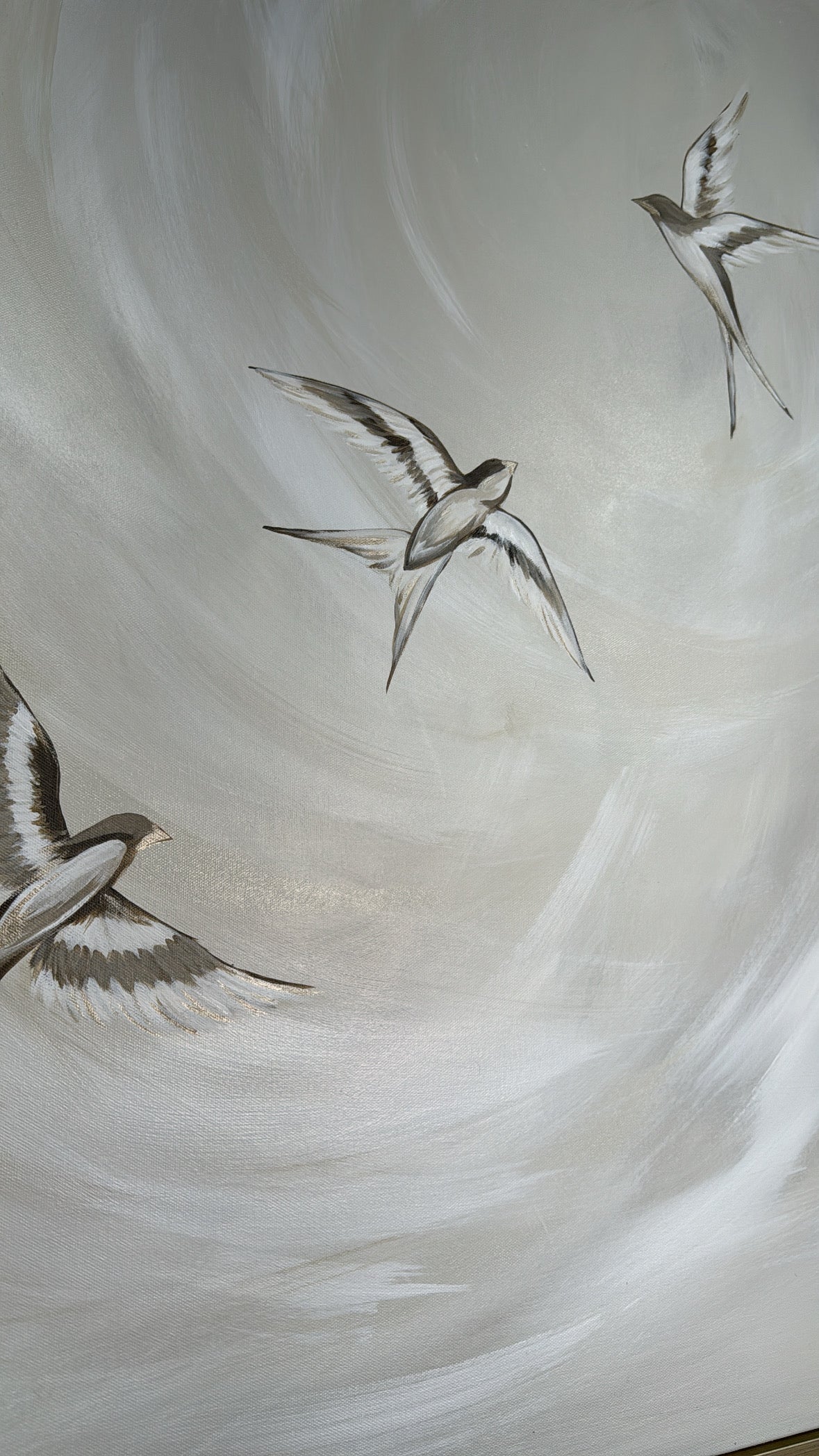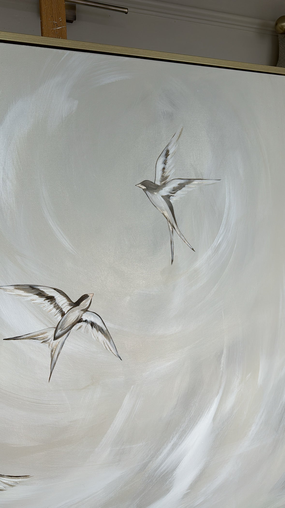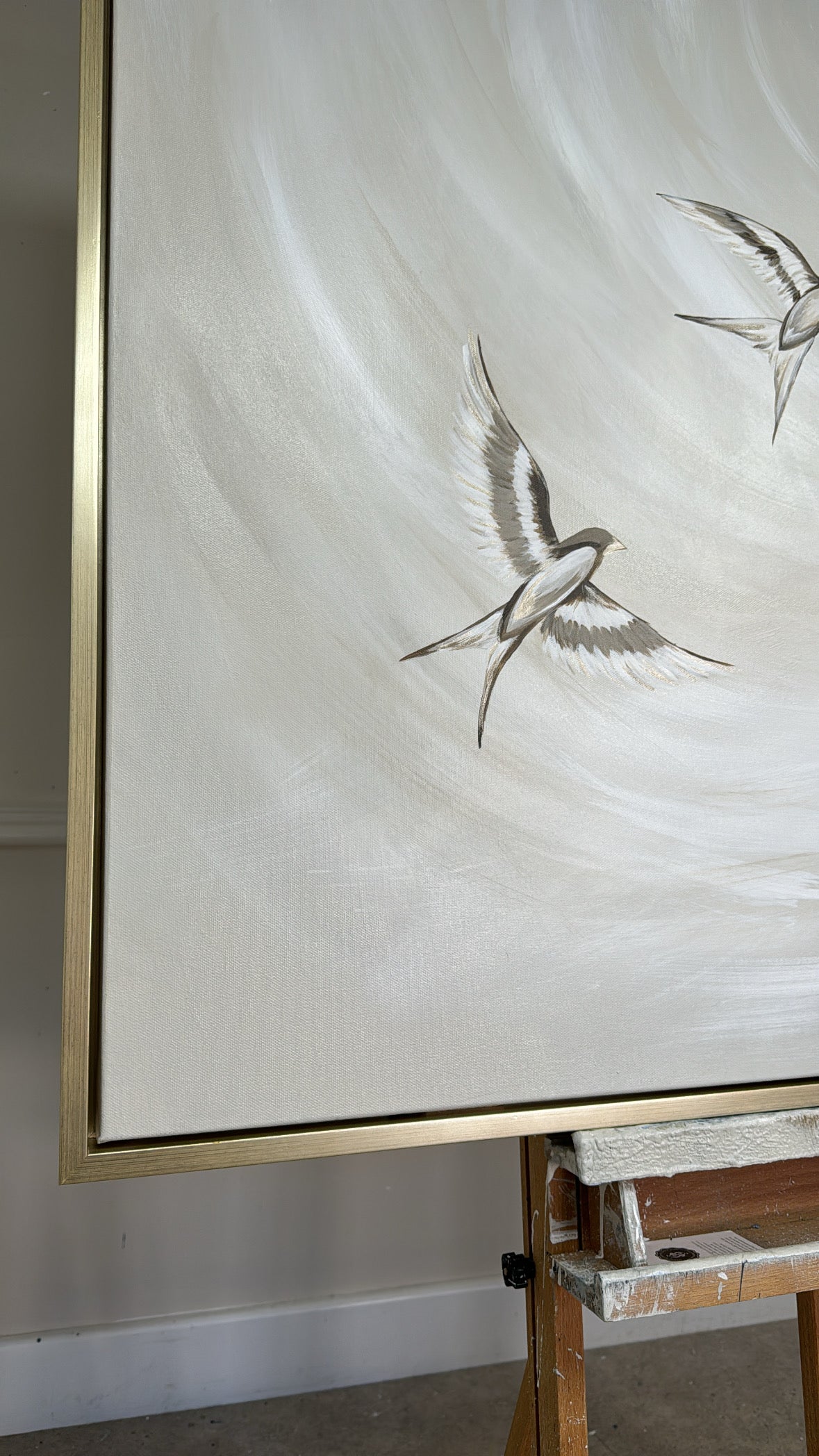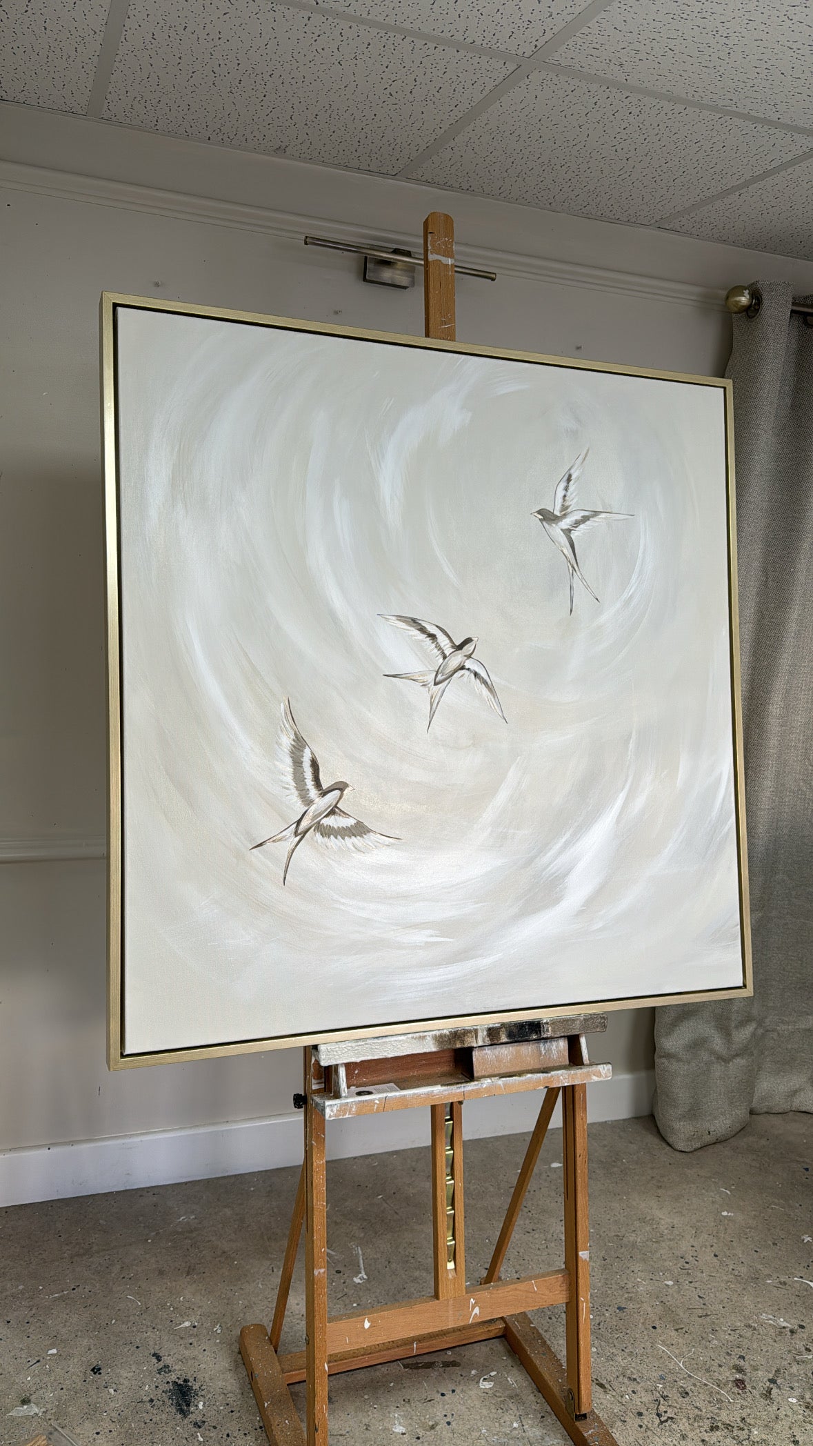 'Harmony' is a light and airy, soft cream, warm light grey and off white peaceful artwork on canvas with three brown white and gold birds with golden beaks. The canvas size is 100x100cm and is resting in a champagne gold frame (Please note framing adds around 3-4cm all round dependant on frame option selected) Framing is included in the cost.