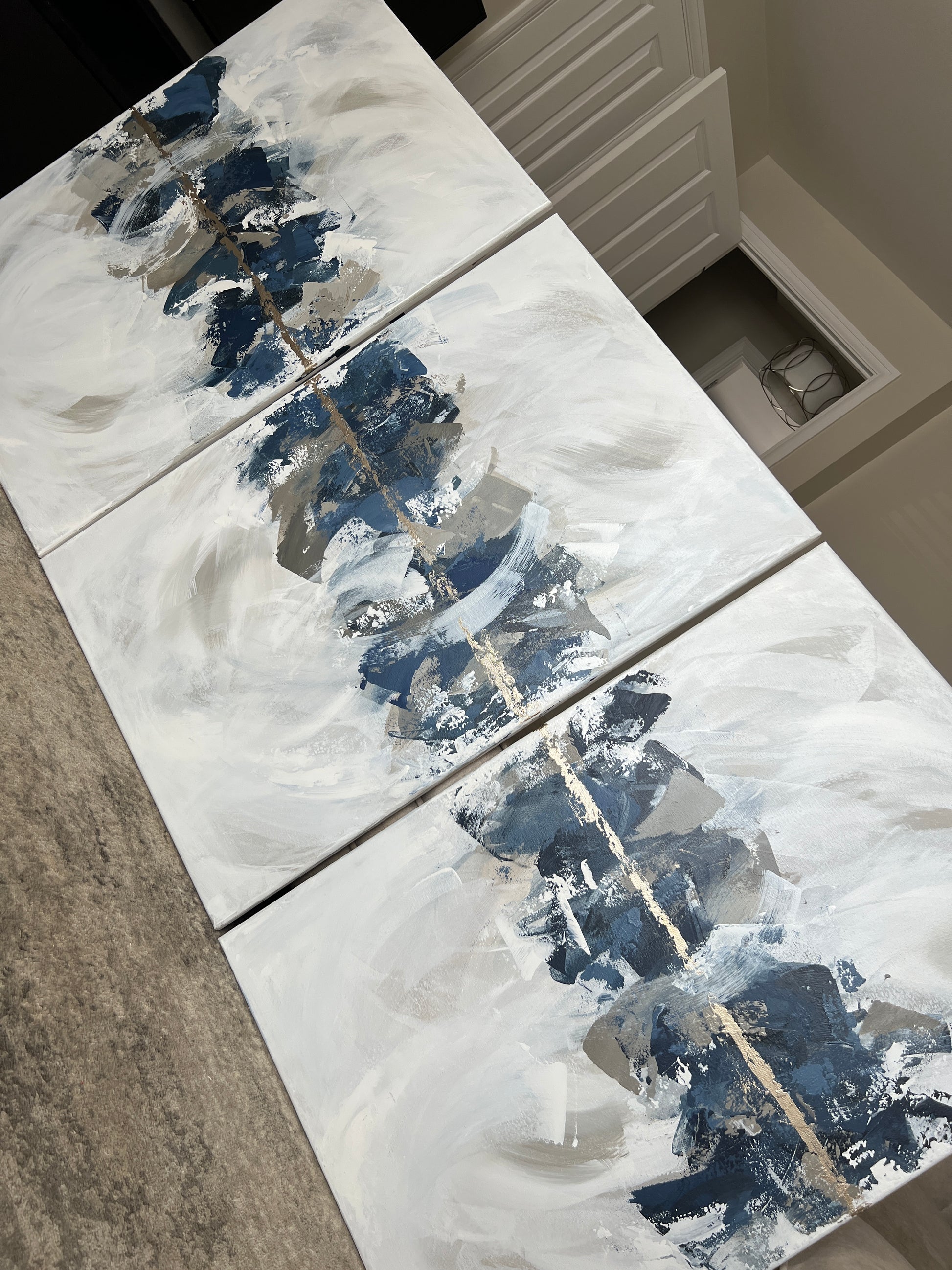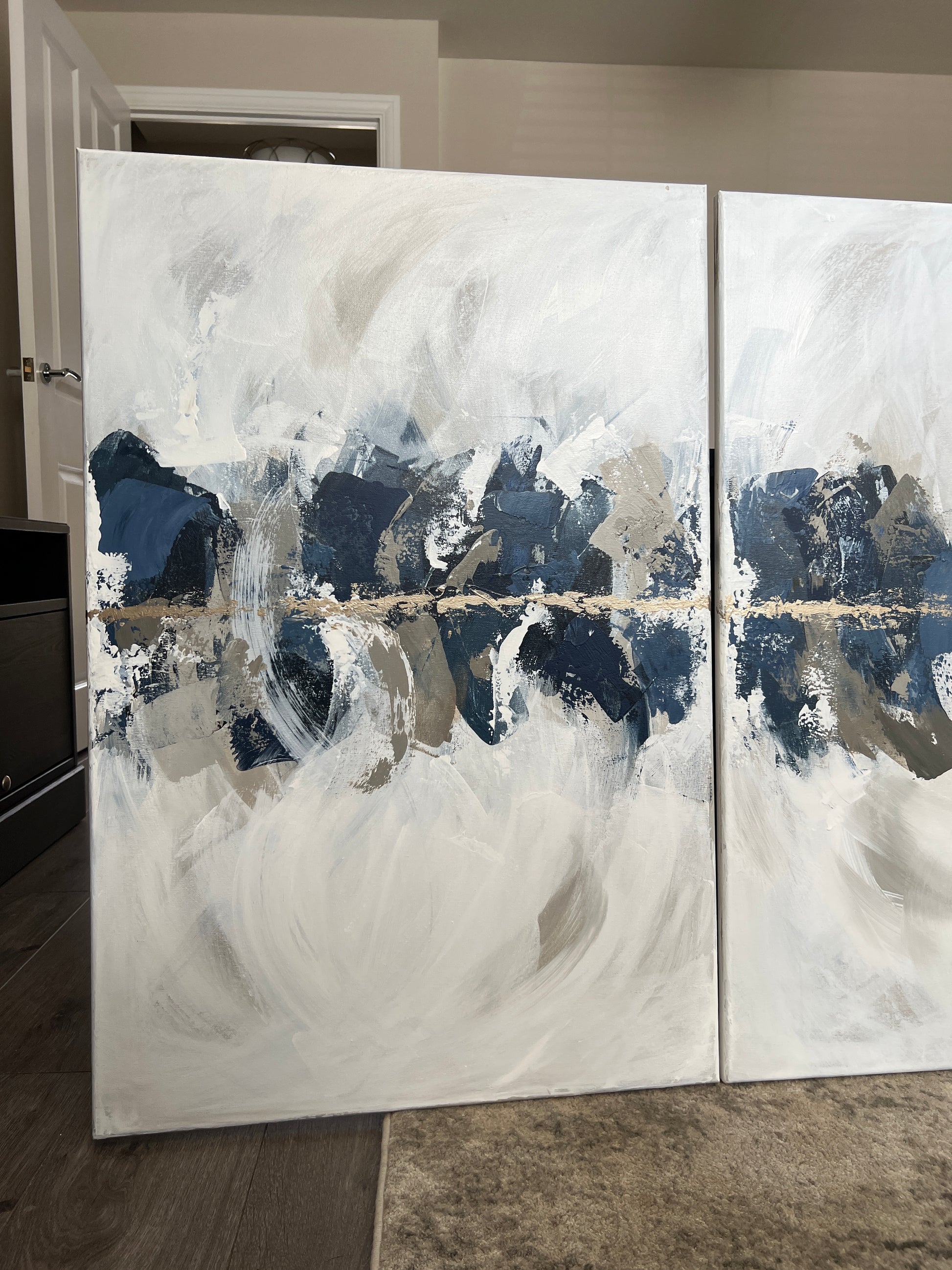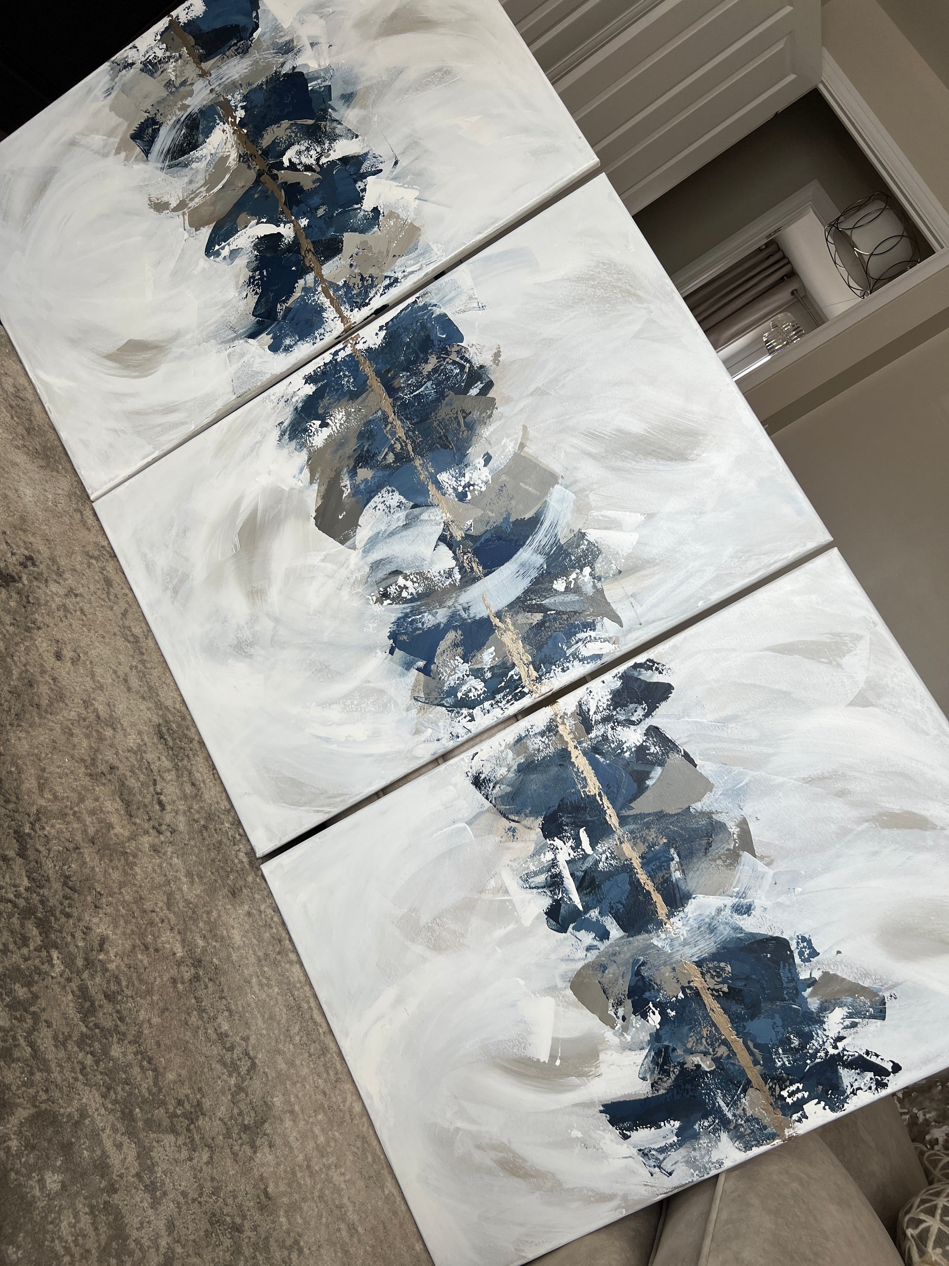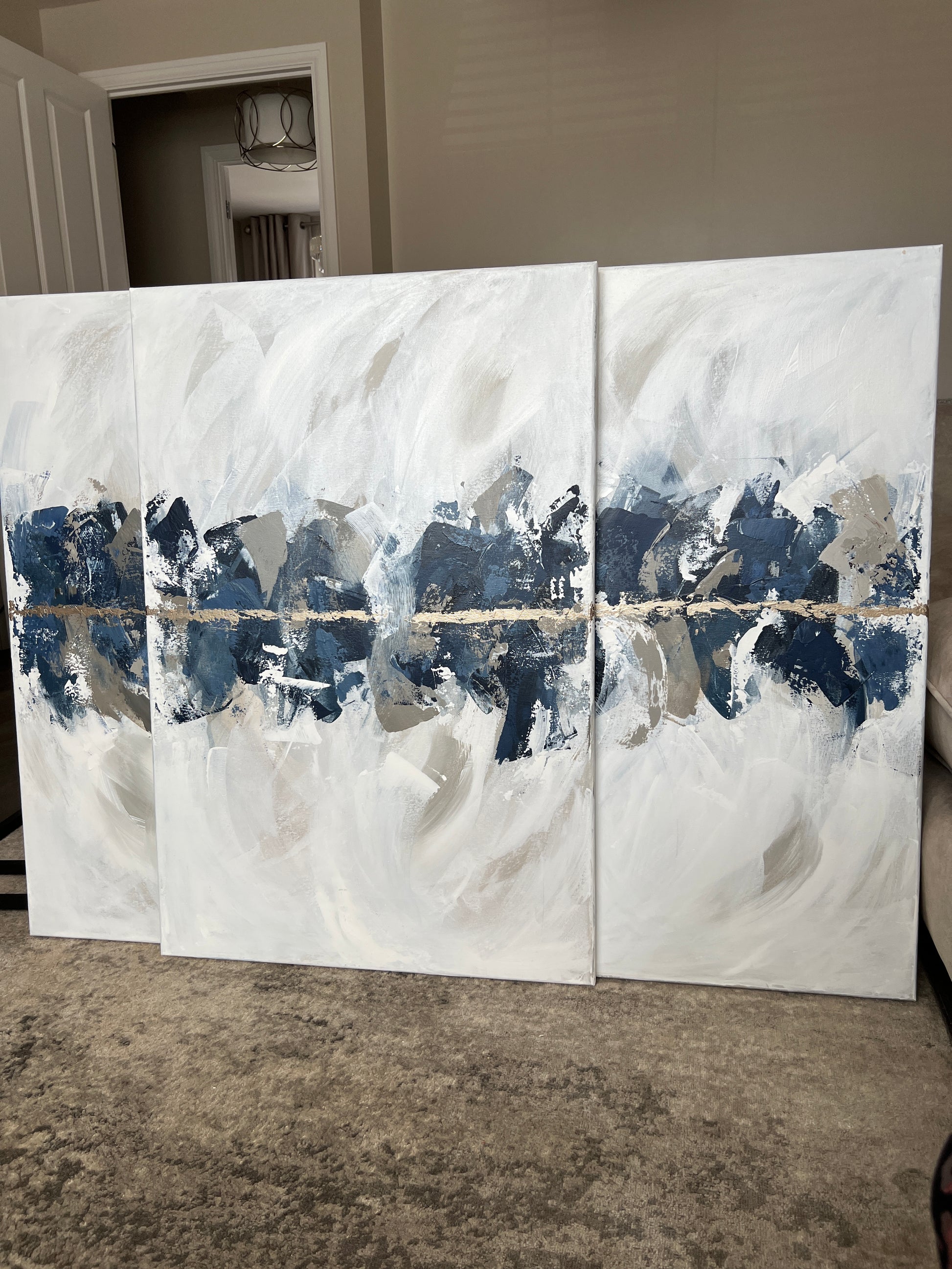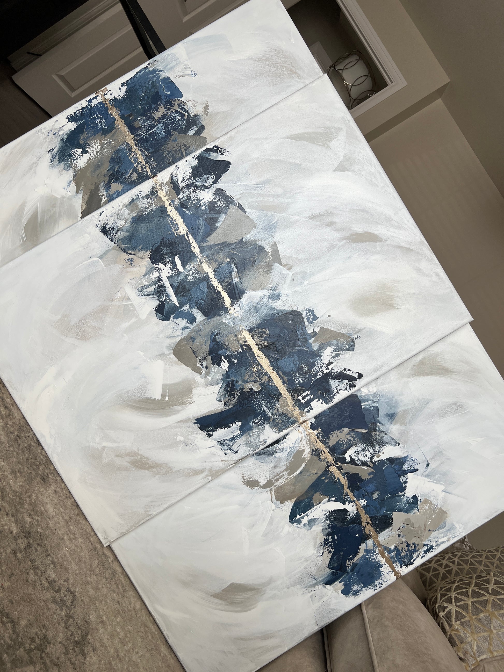 ‘Indigo Trio' was Created with deep navy and dusky blues, subtle taupe's, greiges, creams, soft beige and off white undertones and finished with gold . The size of the canvases are 61x91cm and are unframed in the images above. (Please note framing adds around 3-4cm all round dependant on frame option selected)
