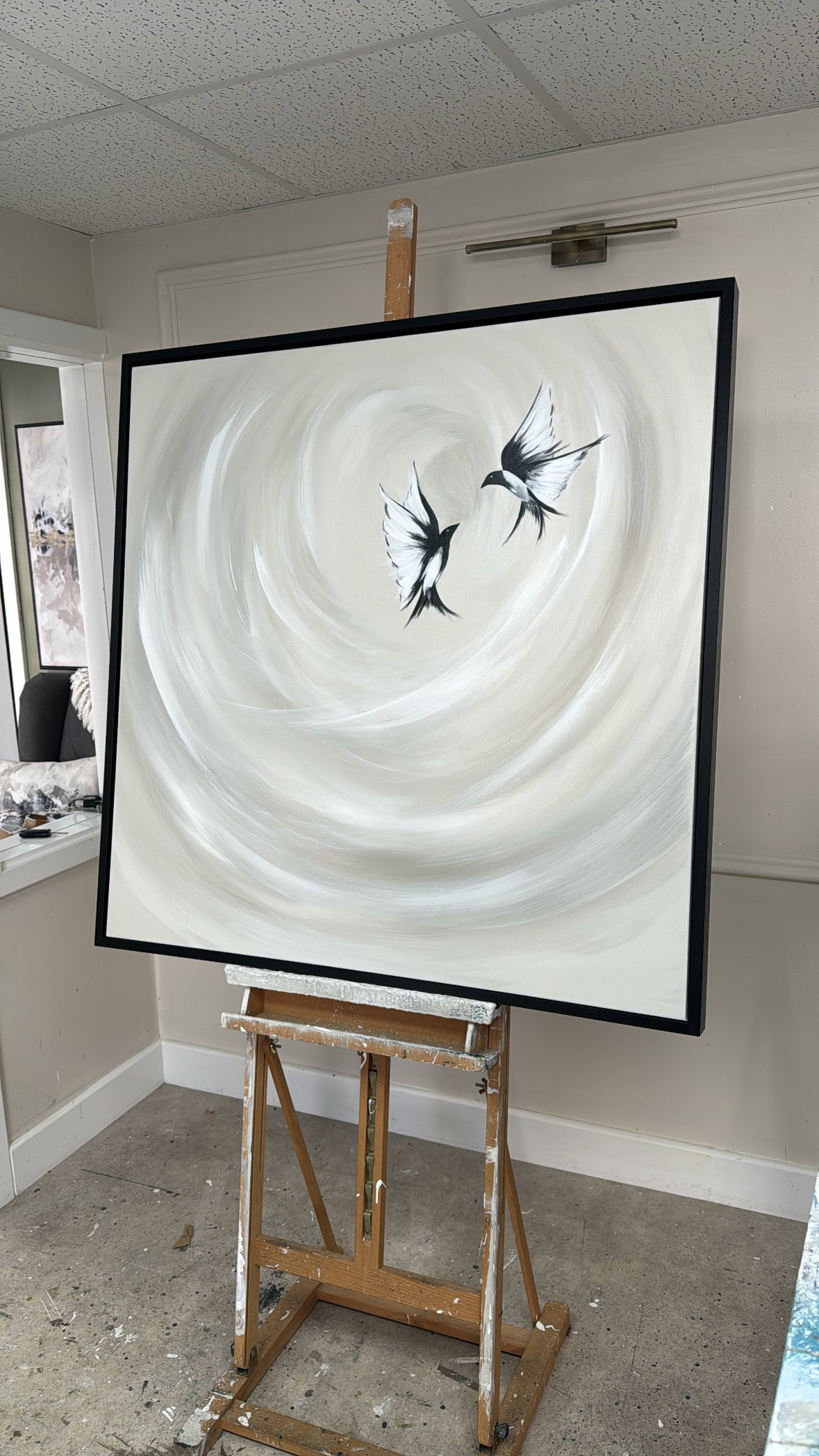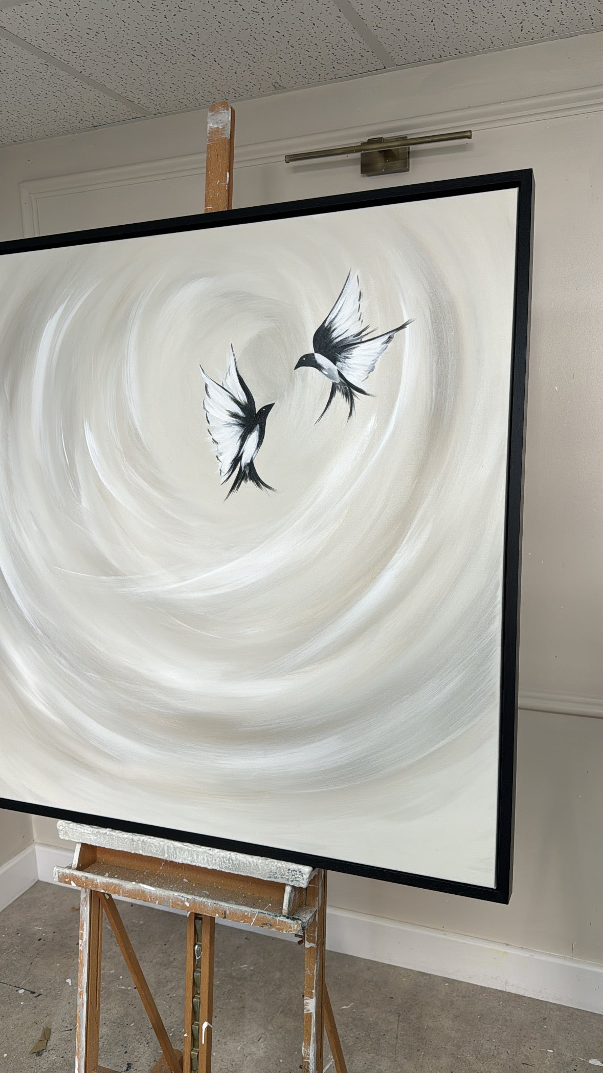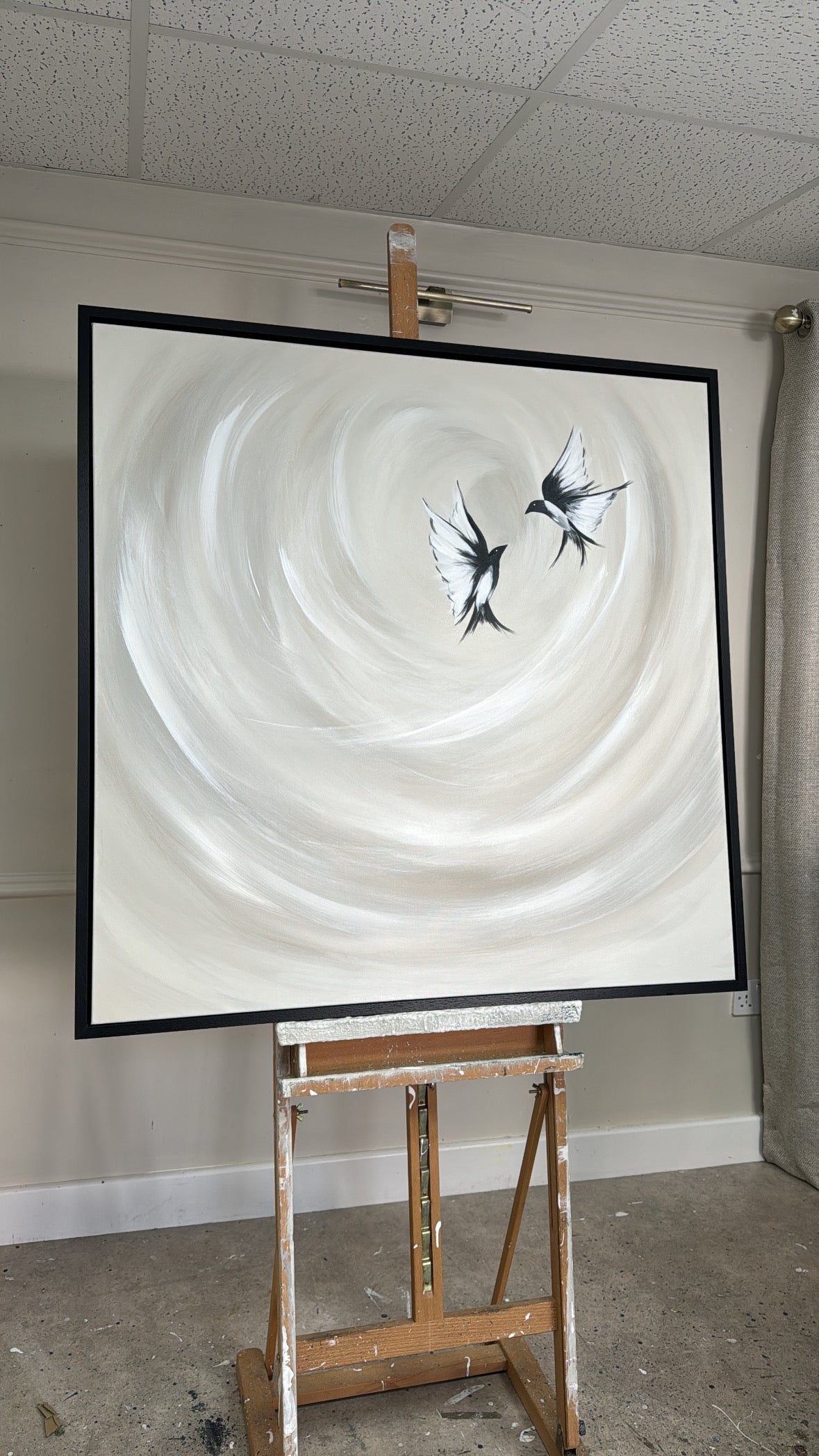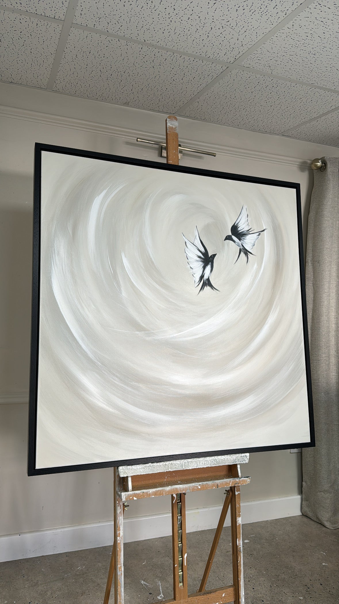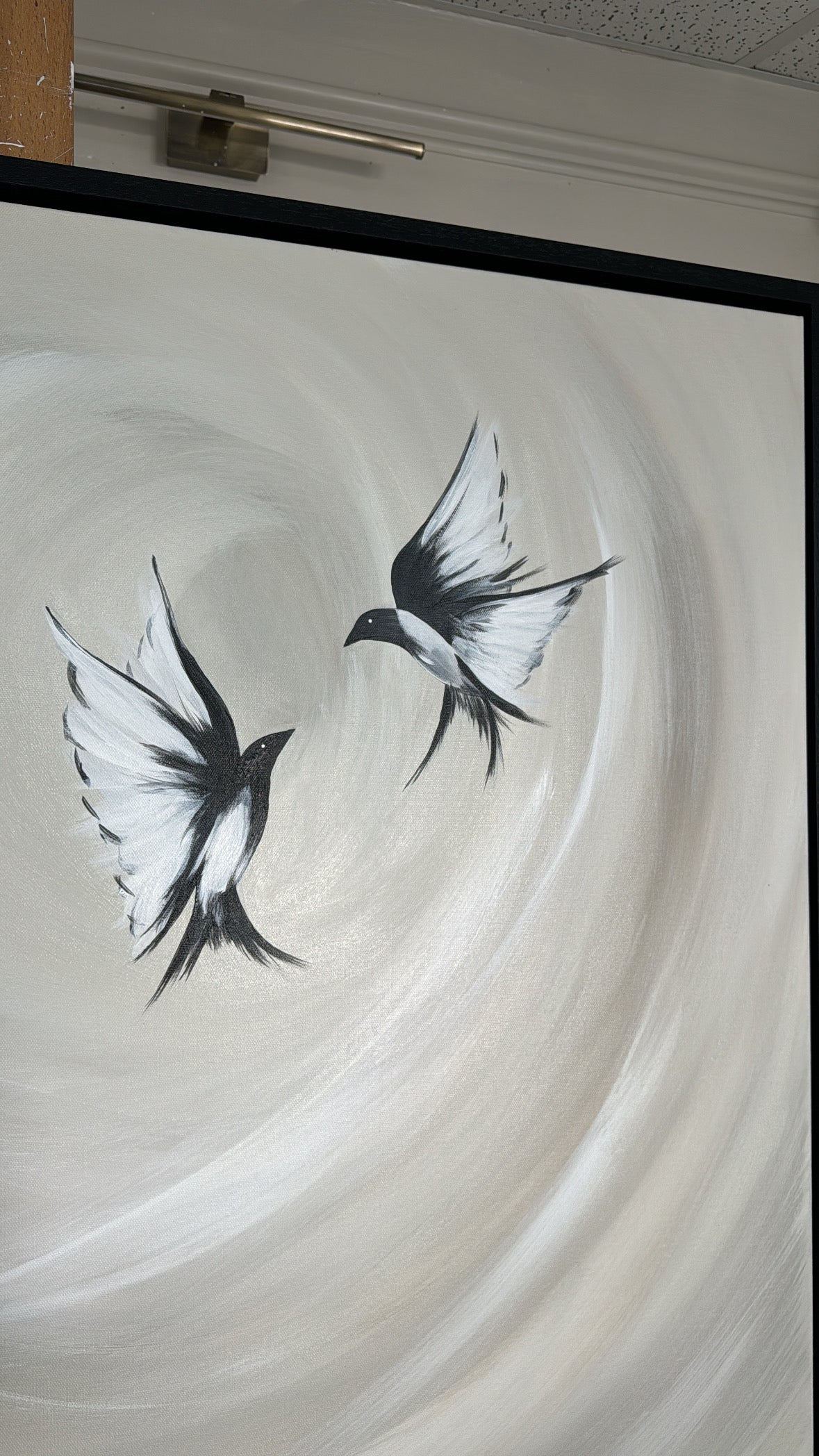 'Magpie Moon' is a warm soft taupe, cream, light grey, off white peaceful artwork on canvas with two white and black birds. The canvas size is 100x100cm (Please note framing adds around 3-4cm all round dependant on frame option selected)