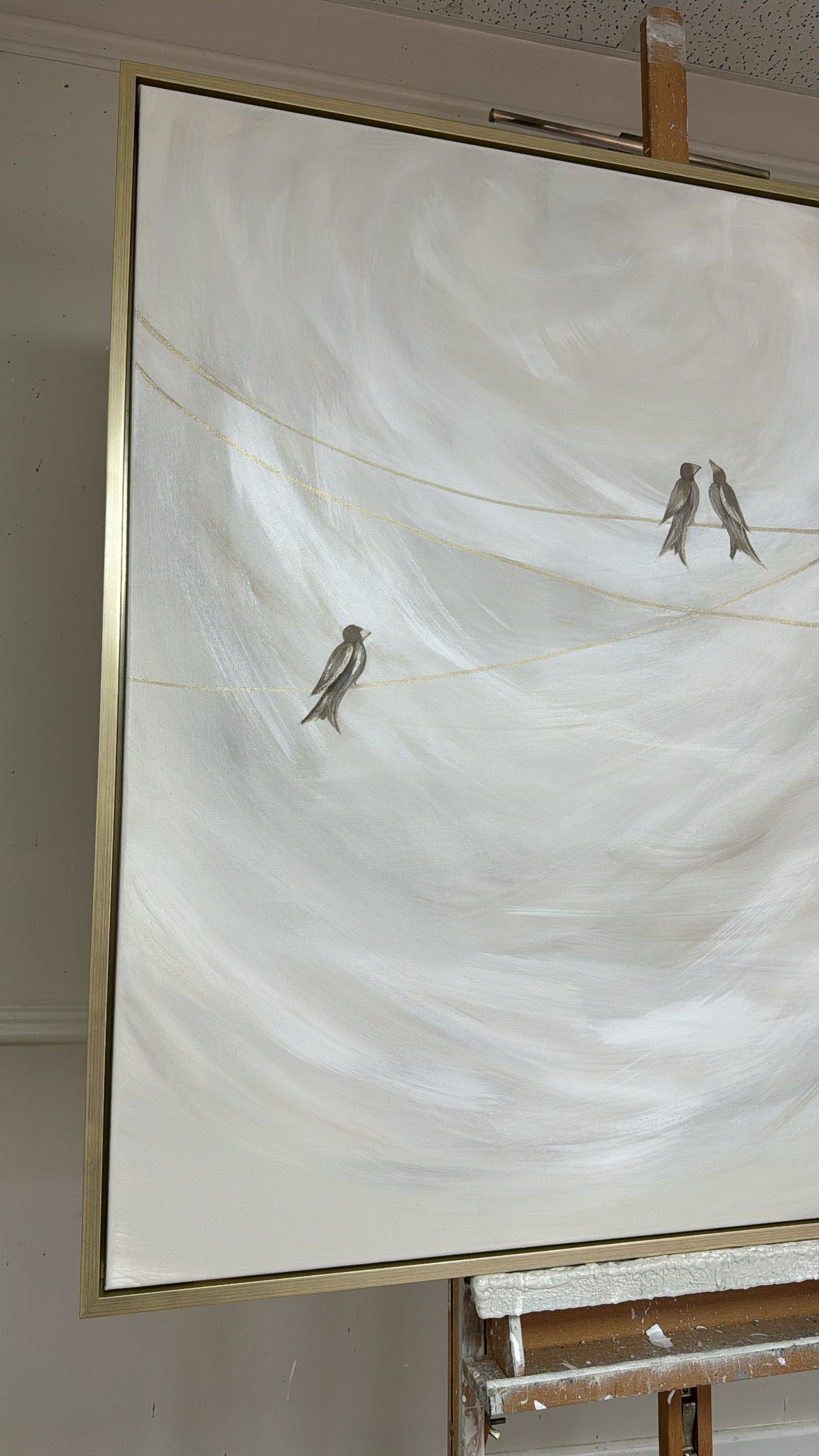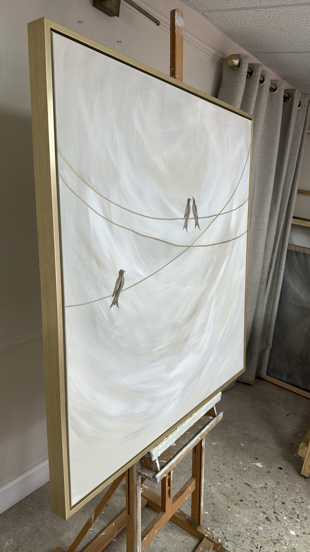 The canvas size is 100x100cm and is resting in a champagne gold frame - framing brings total measurements to approx. 104x104cm)