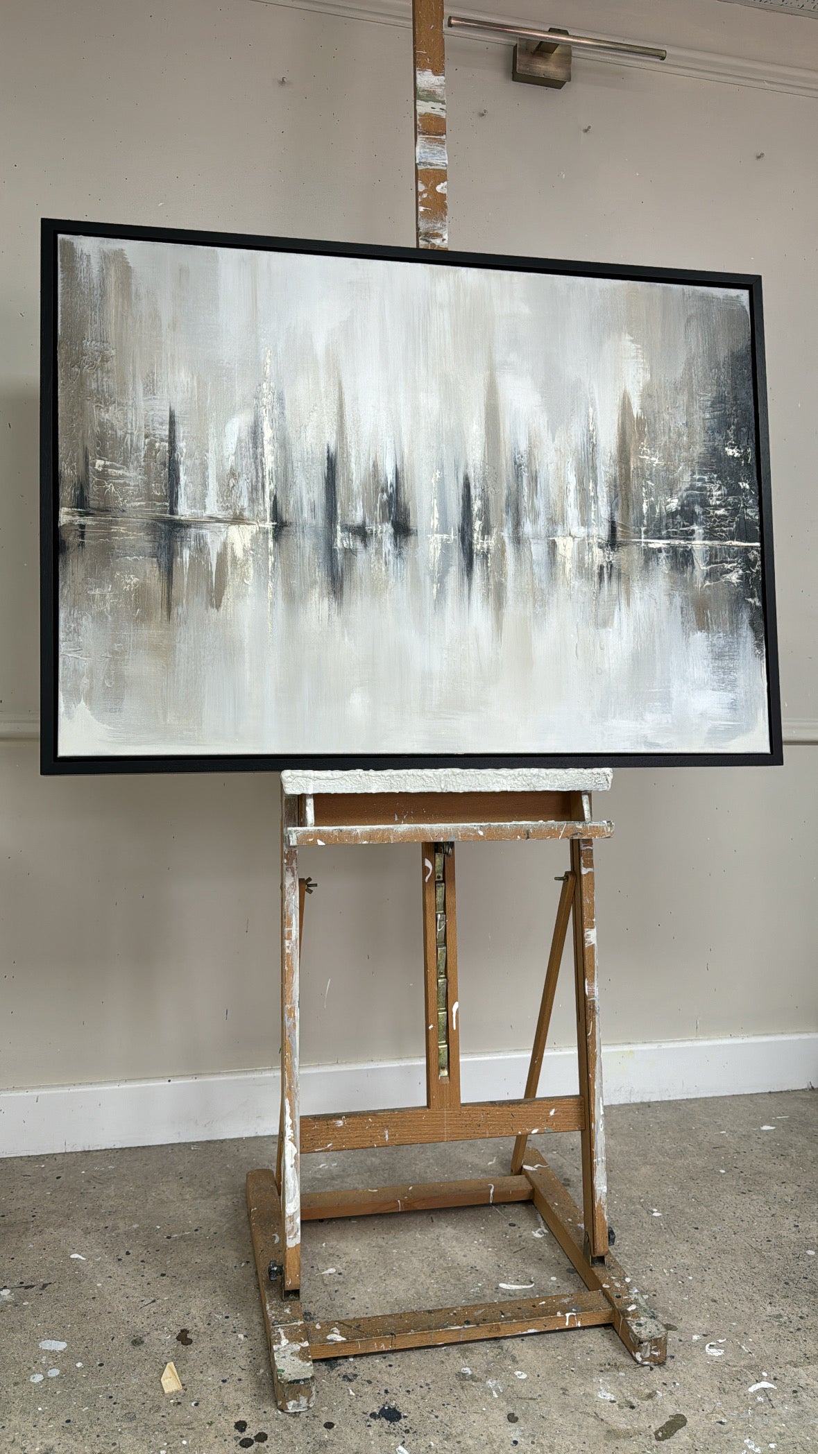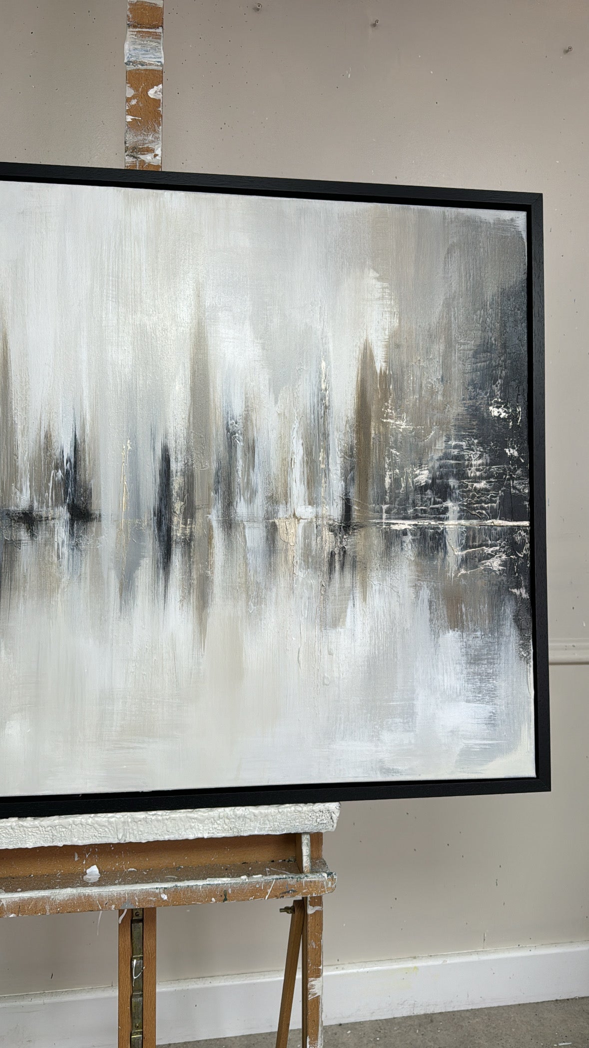 'New York City' is textured black, brown, greige, taupe, cream, off white and gold impactful artwork on canvas size 100x70cm (Please note framing adds around 3-4cm all round dependant on frame option selected, the piece is currently displayed in a black frame but there is a choice of black, white, silver or gold (framing is included in the price) x