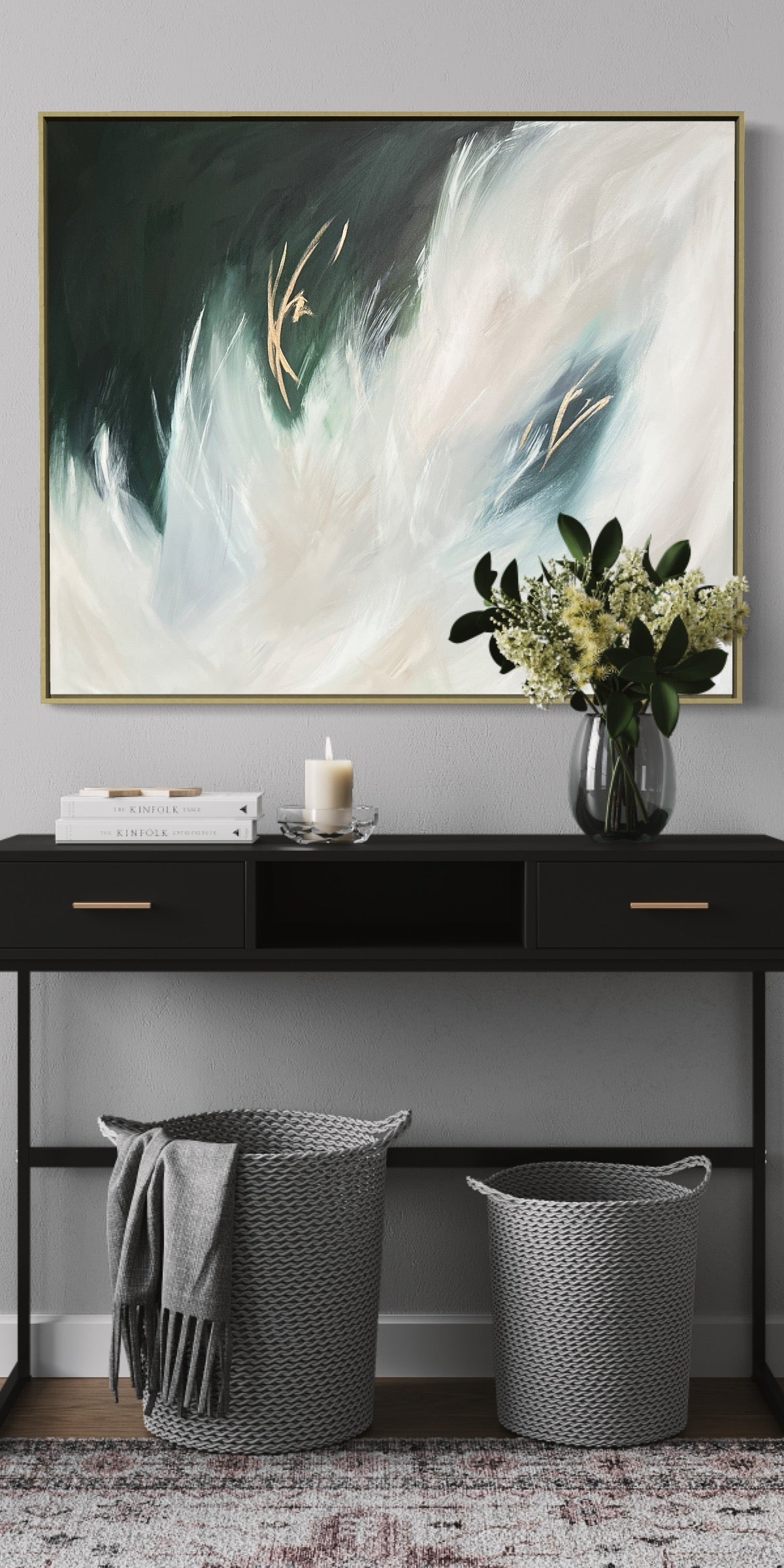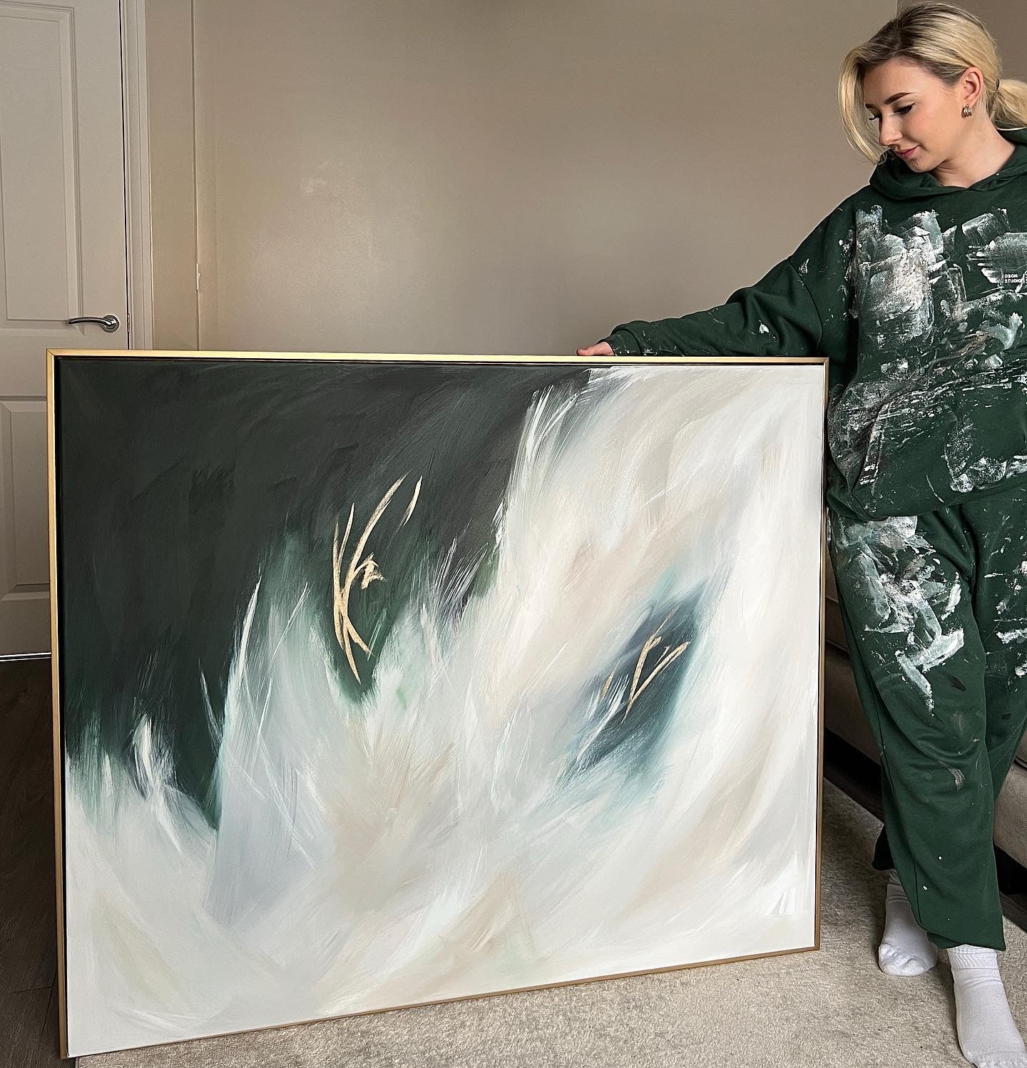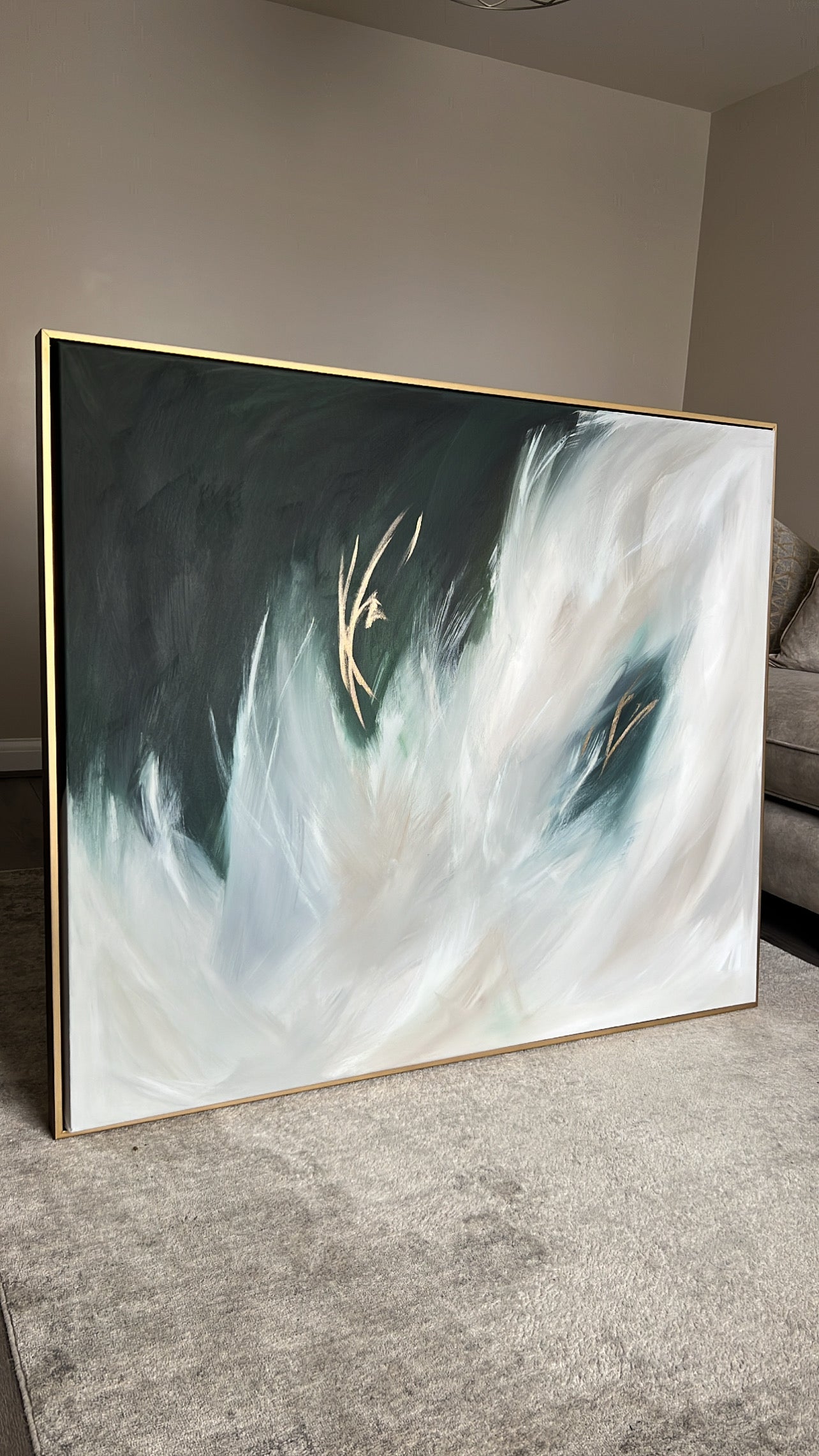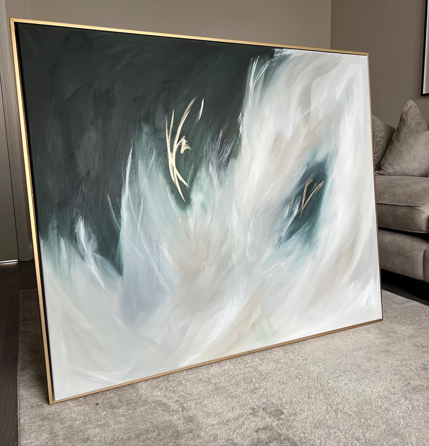 'Pine' Originally shown here in deep pine green amongst shades of emerald, earthy tones of deep taupe, cream, grey, off whites and golden metallic elements. In Size 100x120cm