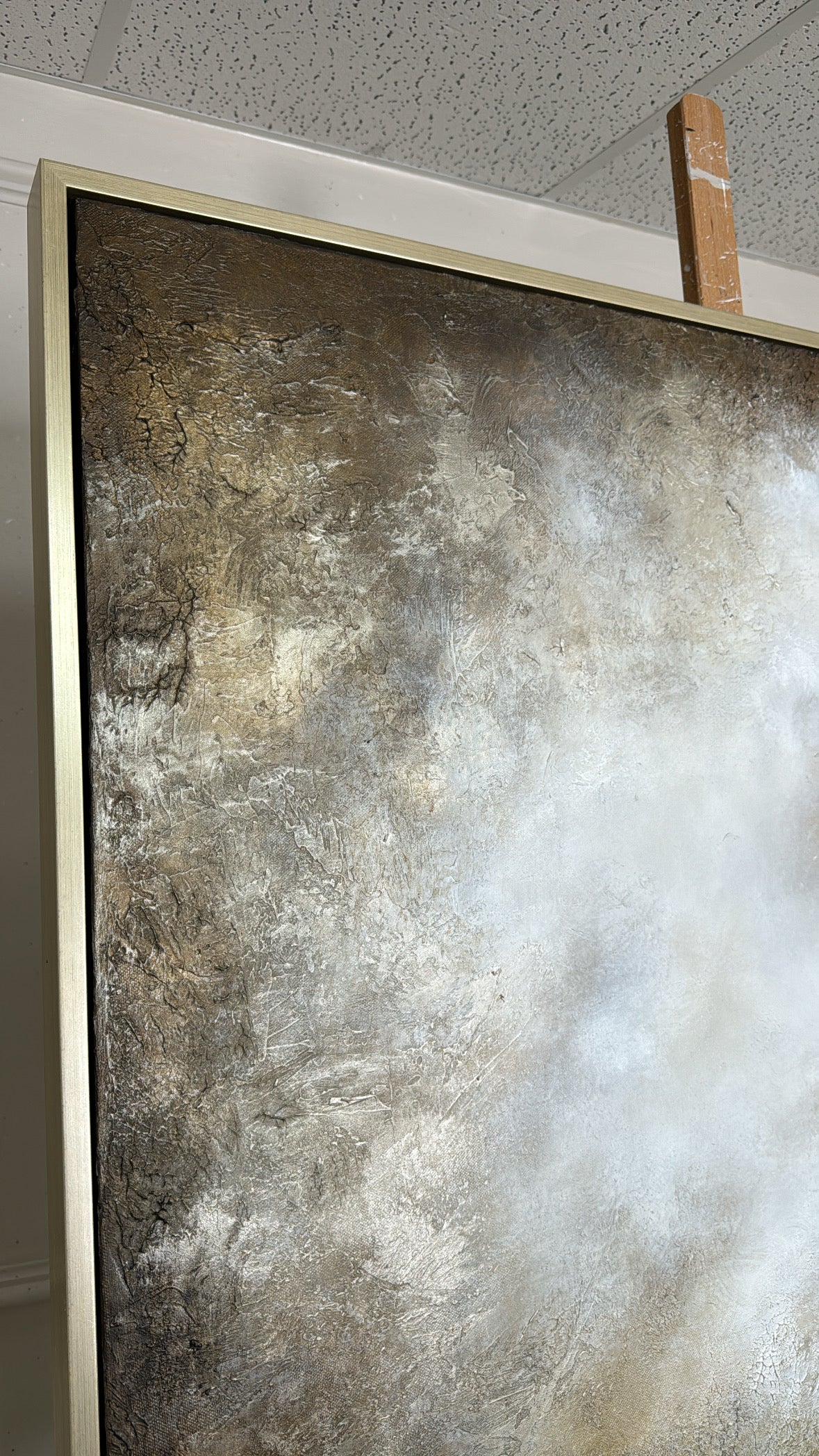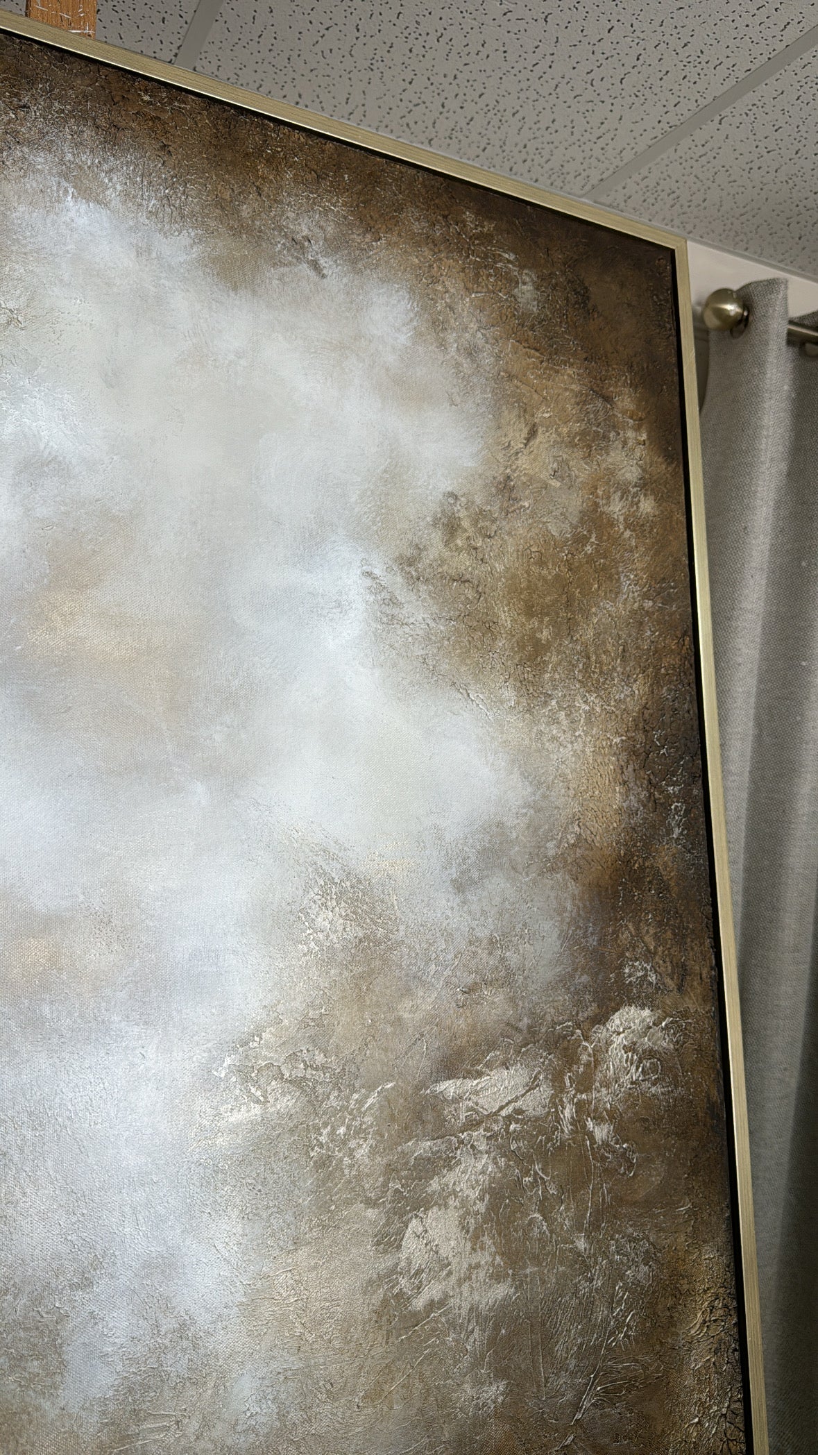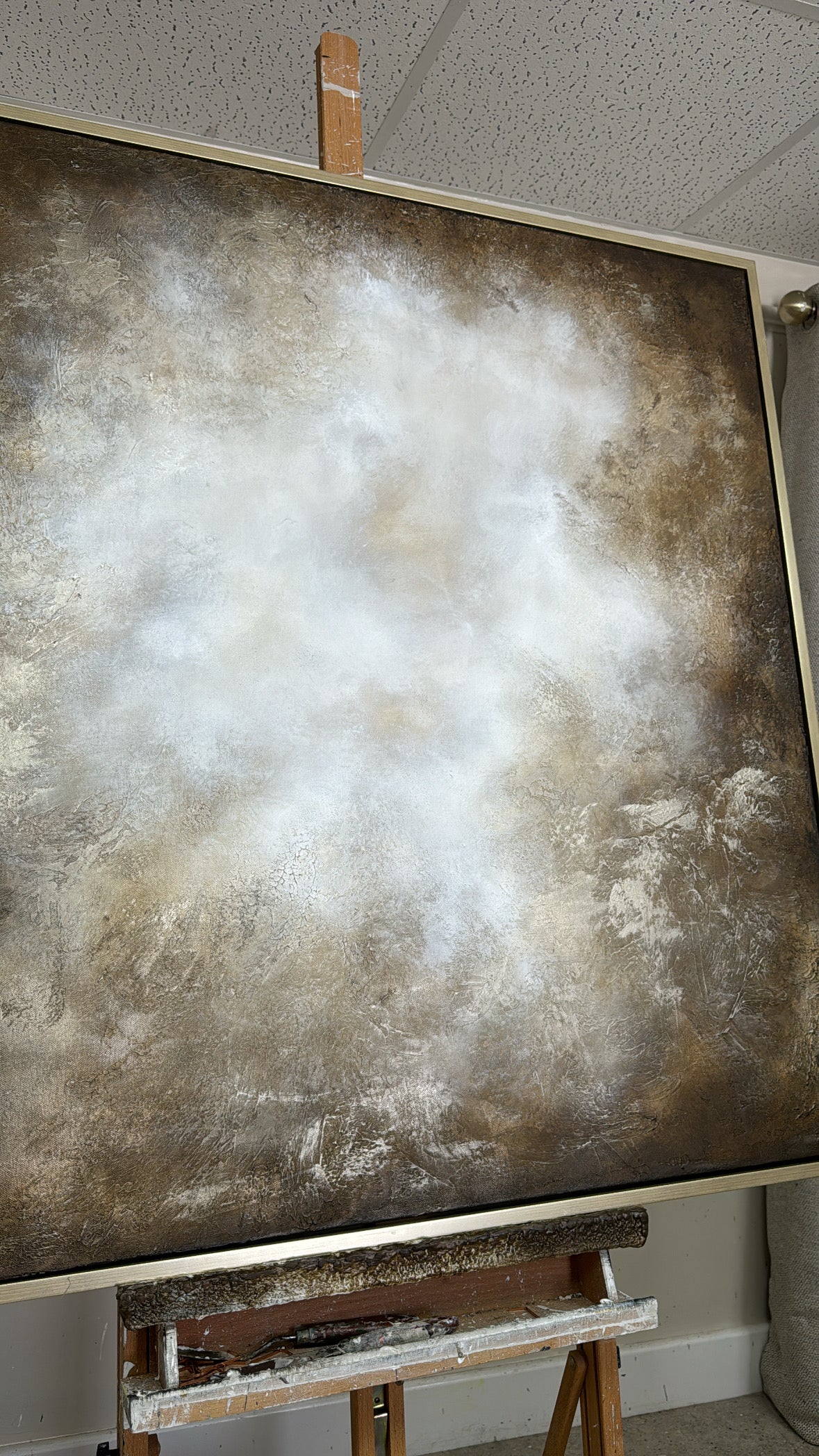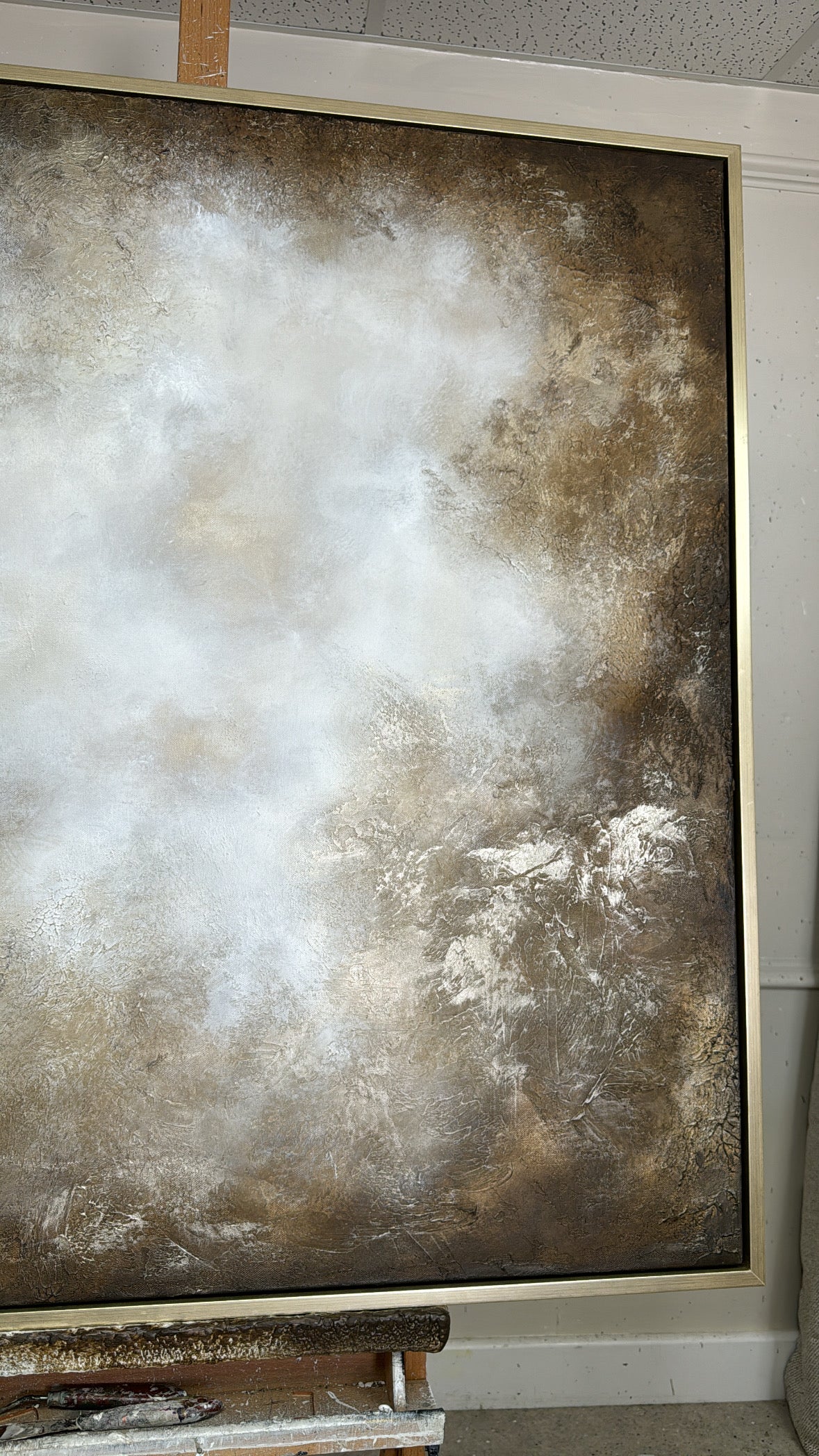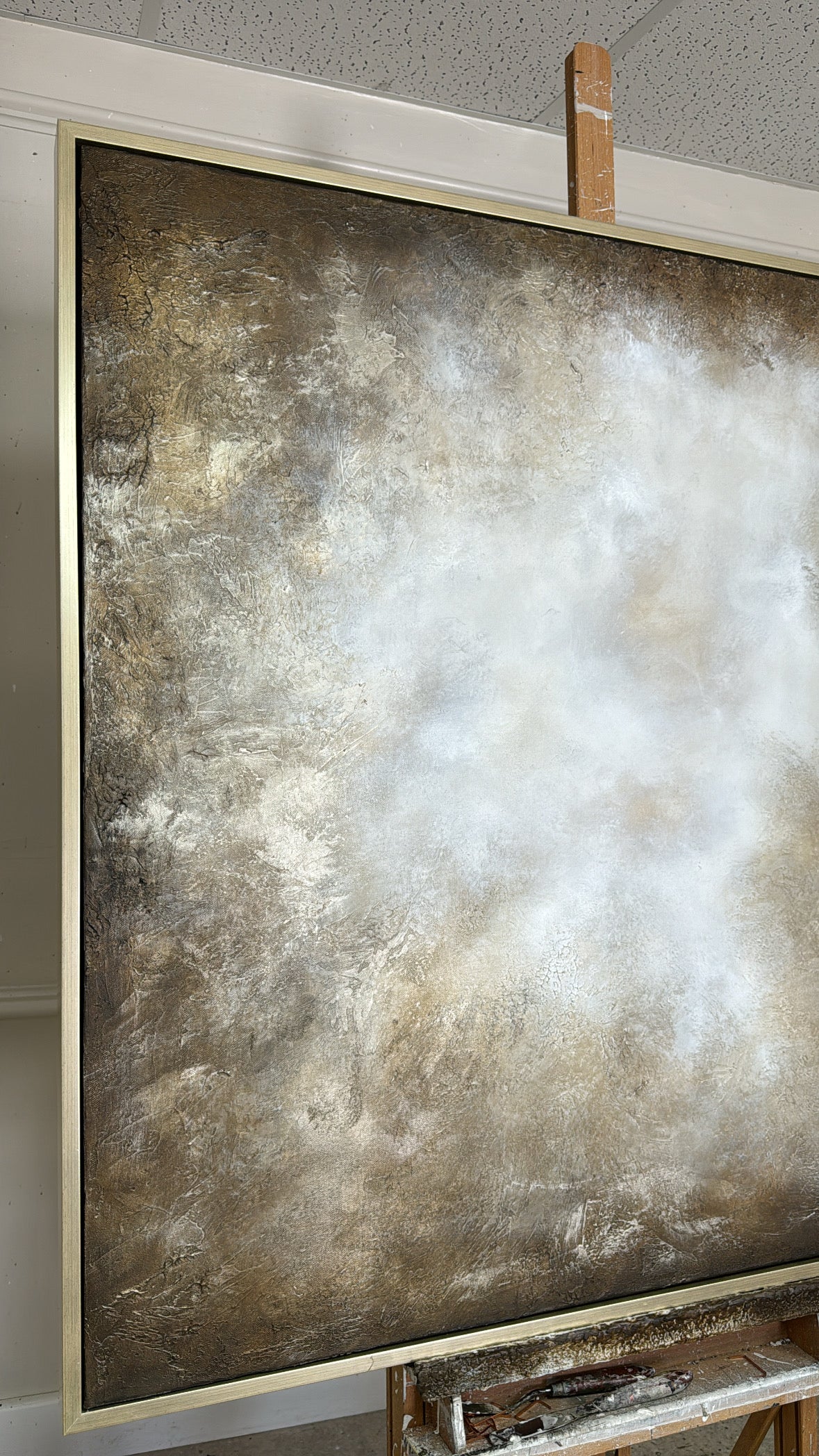 The Details - ''Realm I" is a very heavily textured brown and neutral piece with lashings of gold. The size is a 100x100cm and is resting in a gold frame which brings the total measurements to approximately 104x104cm