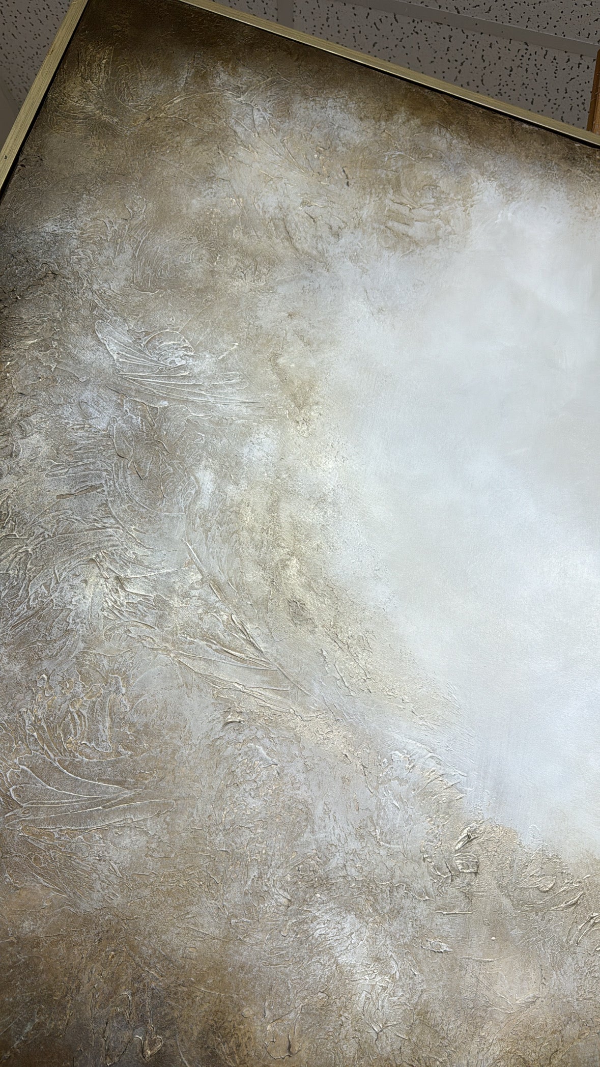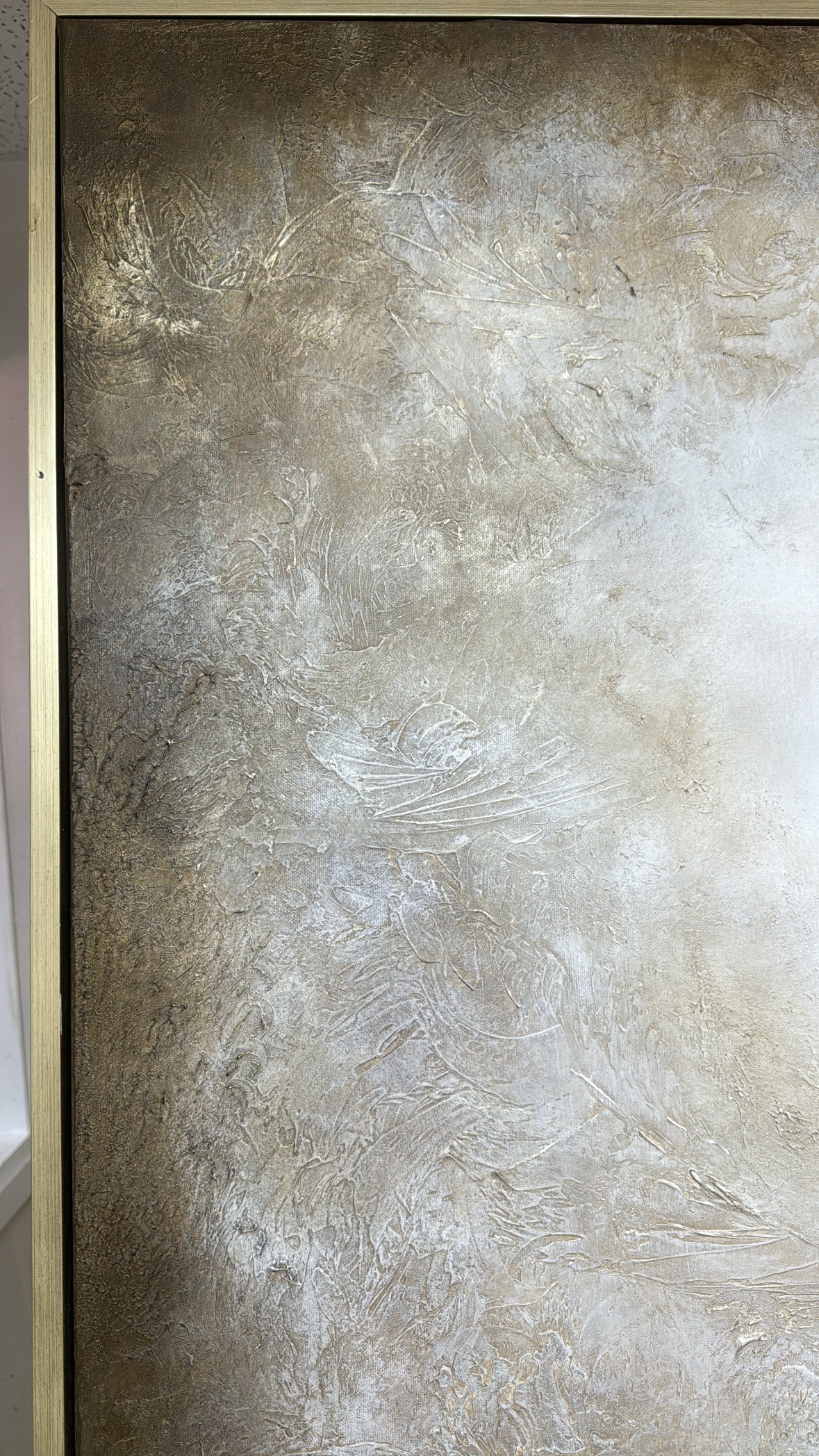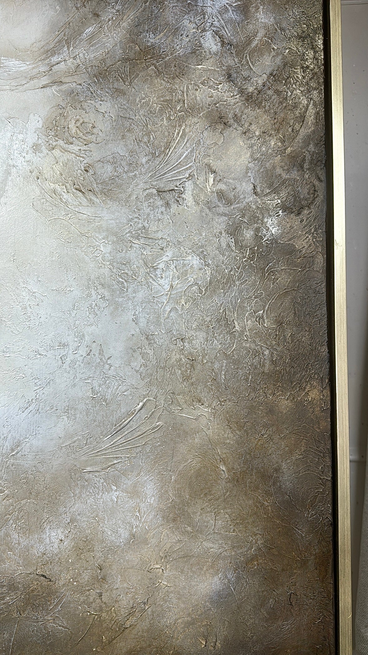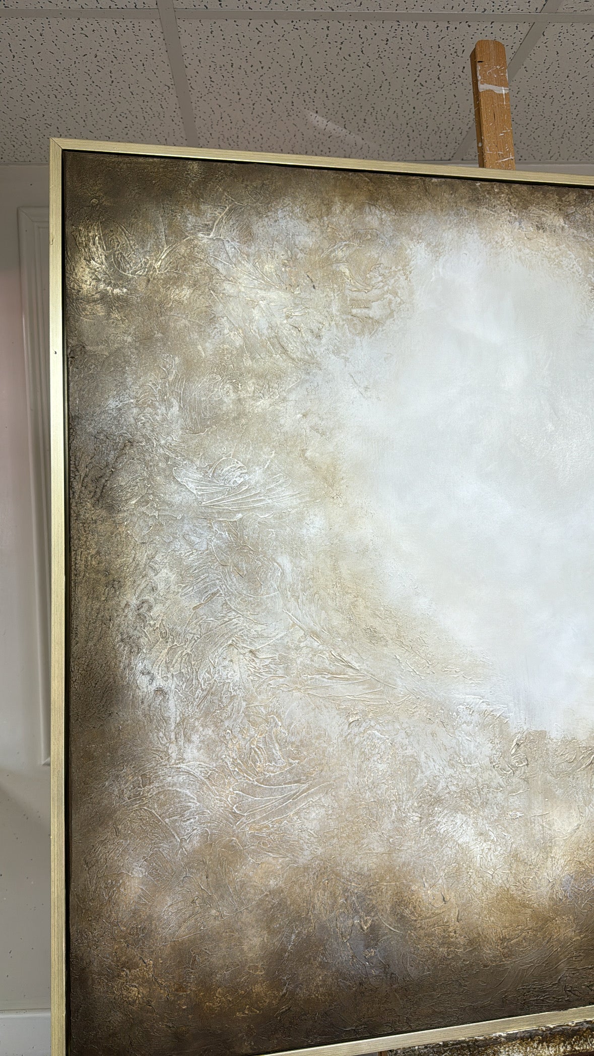 The Details - ''Realm II" is a very heavily textured with the hint of wings and other interesting interpretations. Coloured brown and neutral with lashings of gold. The size is a 100x120cm and is resting in a gold frame which brings the total measurements to approximately 104x124cm