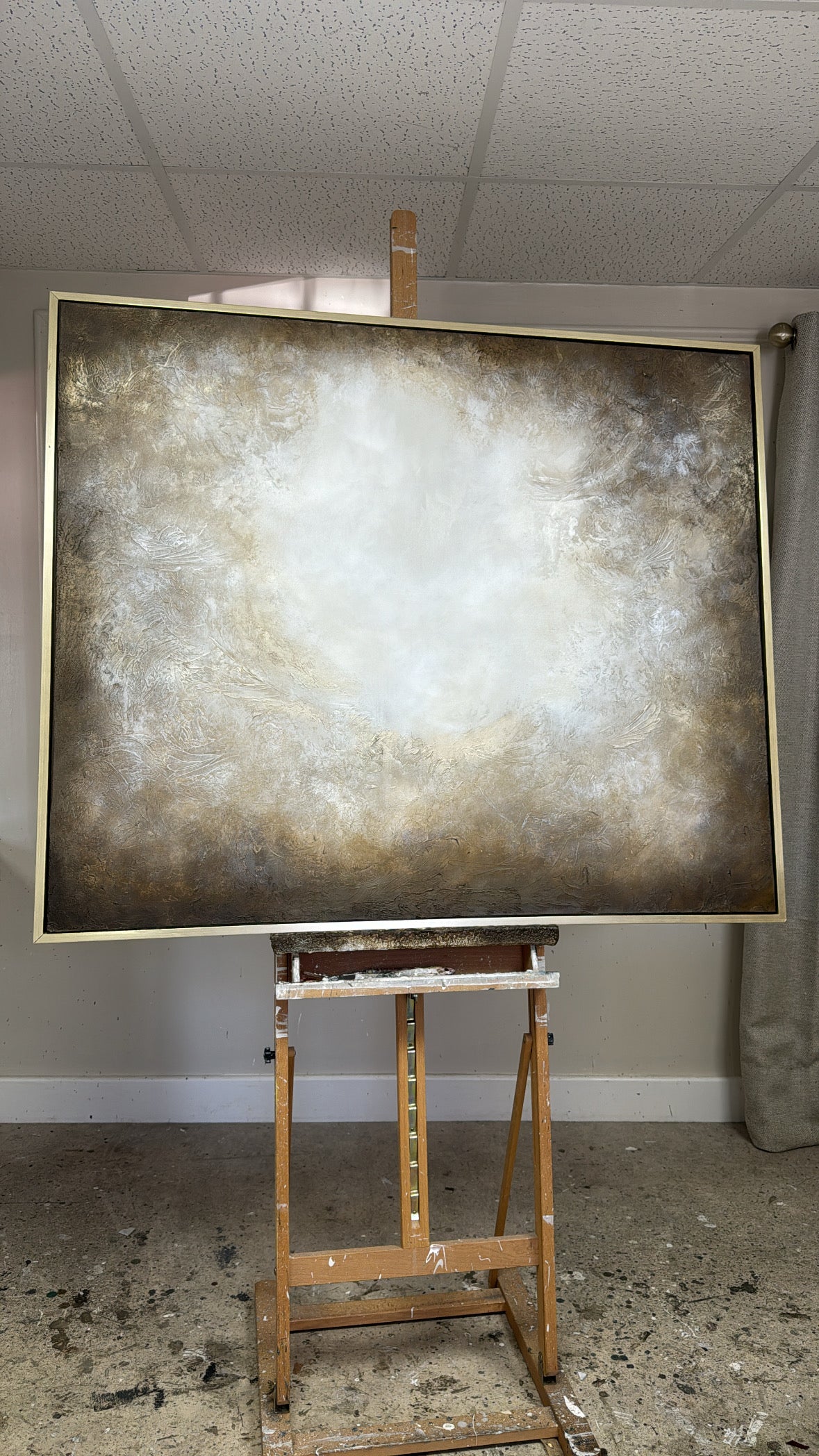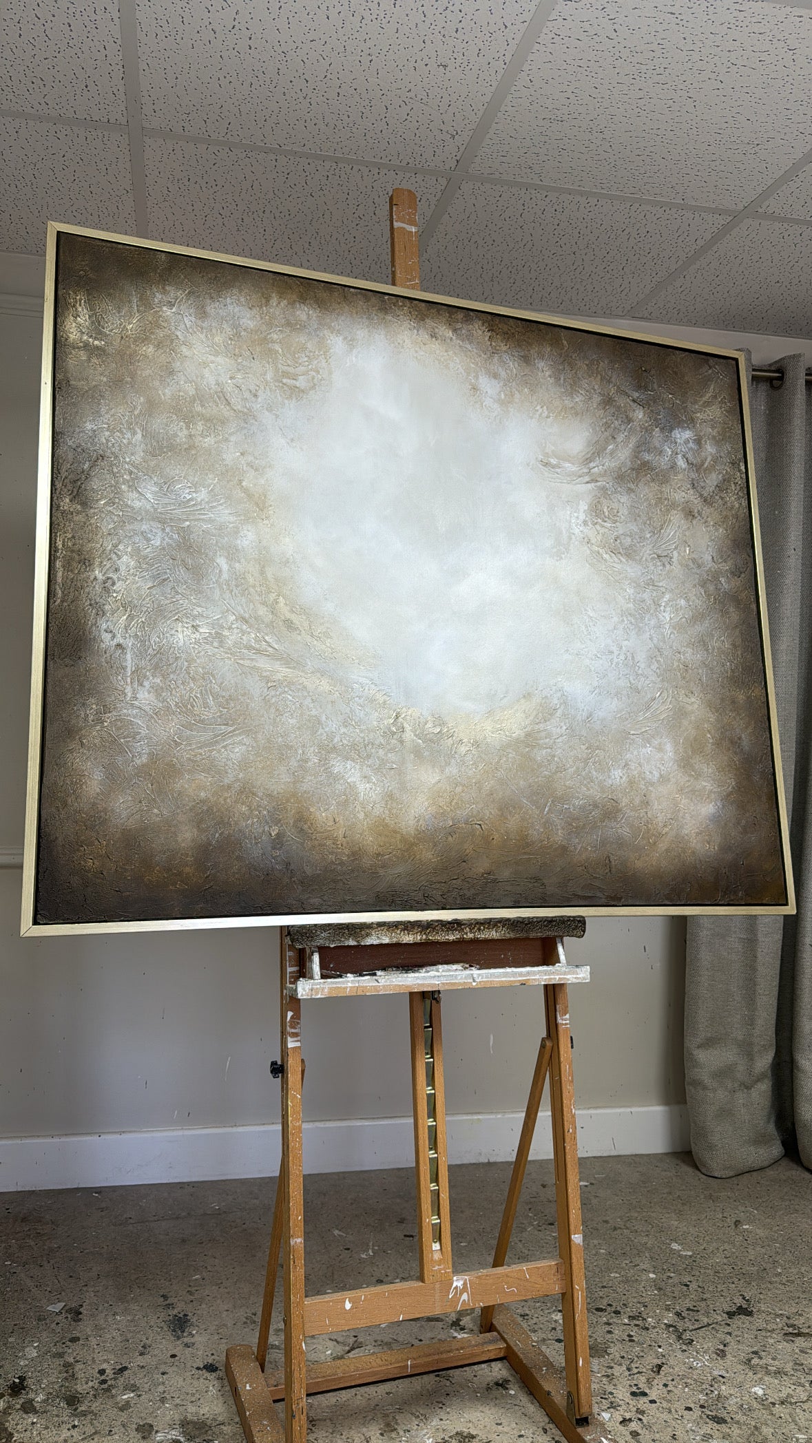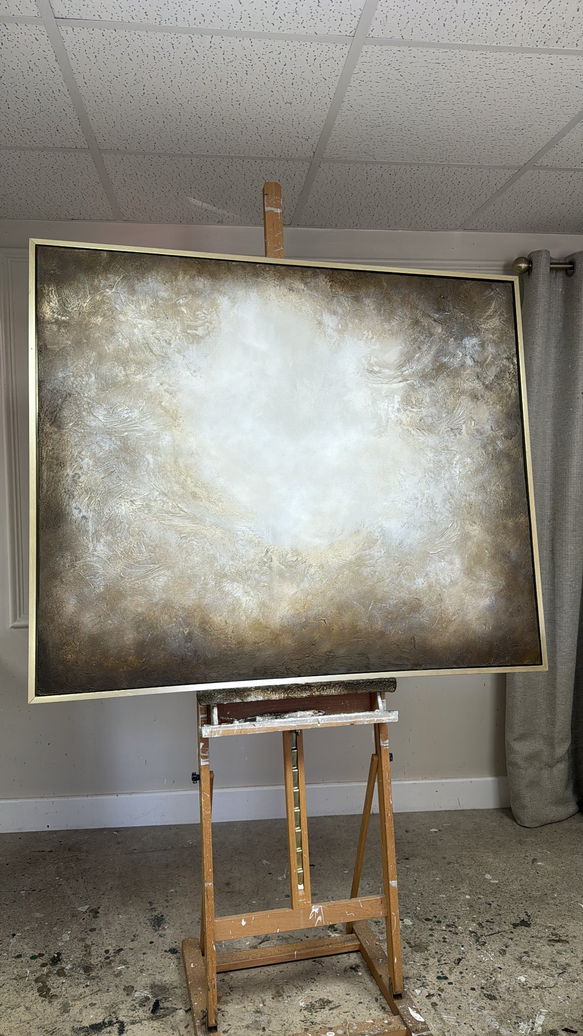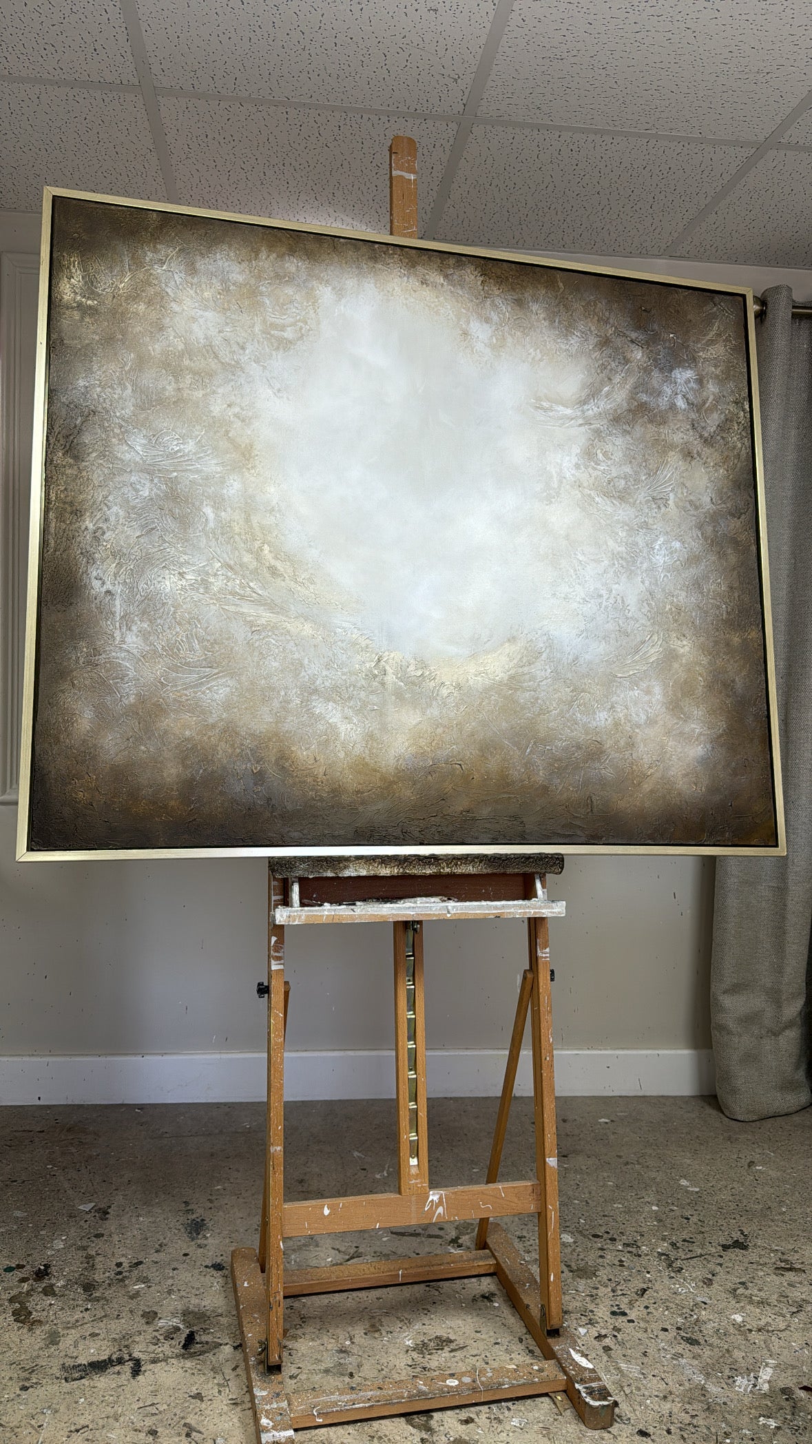 The Details - ''Realm II" is a very heavily textured with the hint of wings and other interesting interpretations. Coloured brown and neutral with lashings of gold. The size is a 100x120cm and is resting in a gold frame which brings the total measurements to approximately 104x124cm