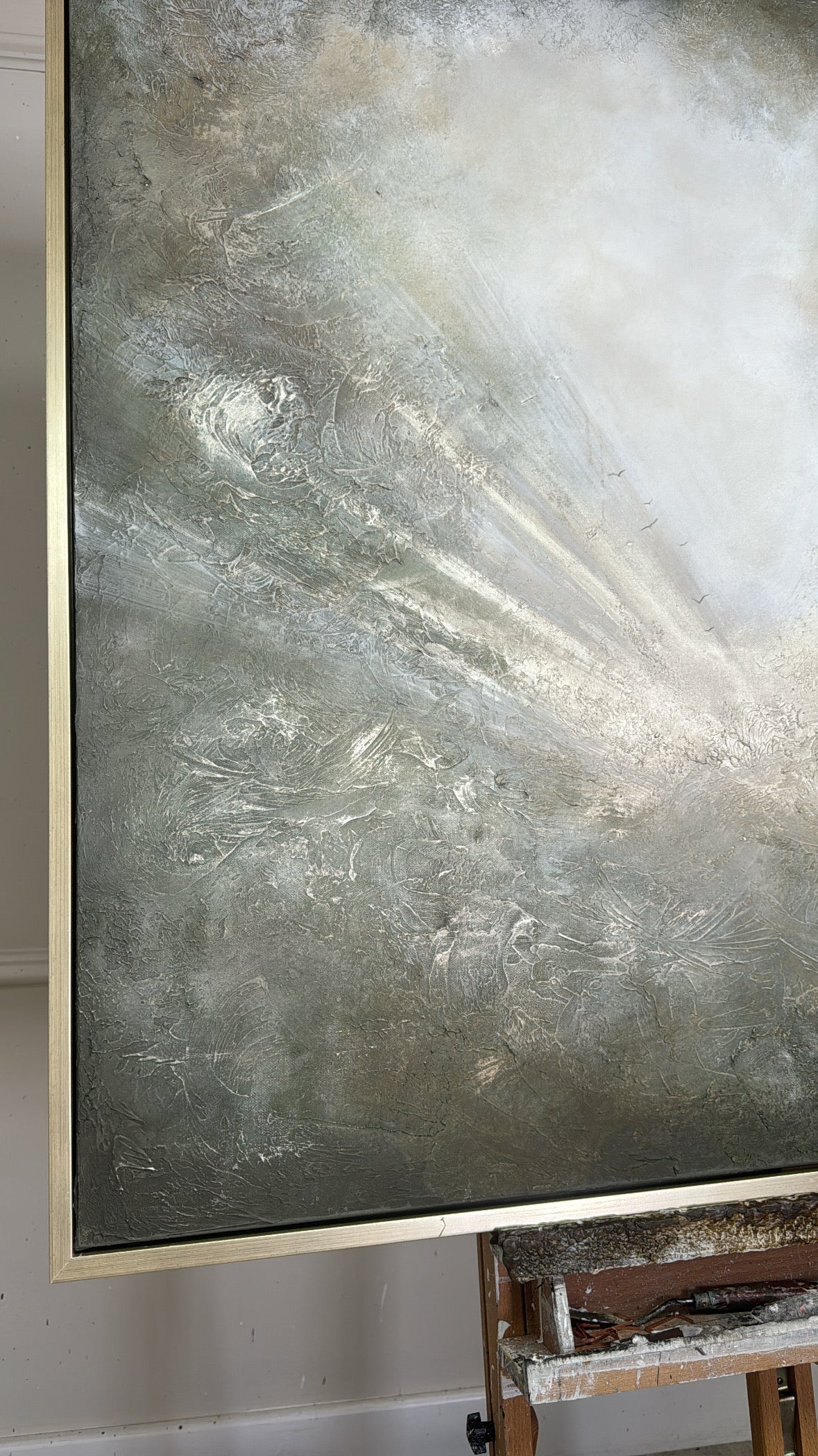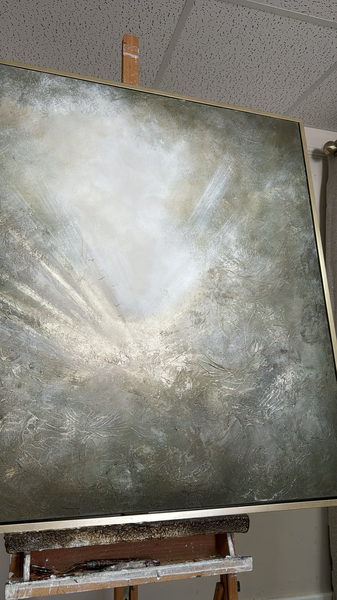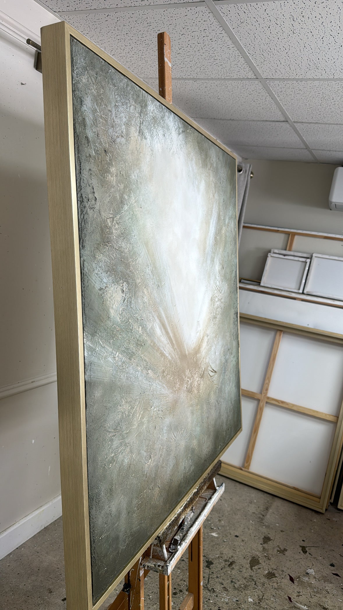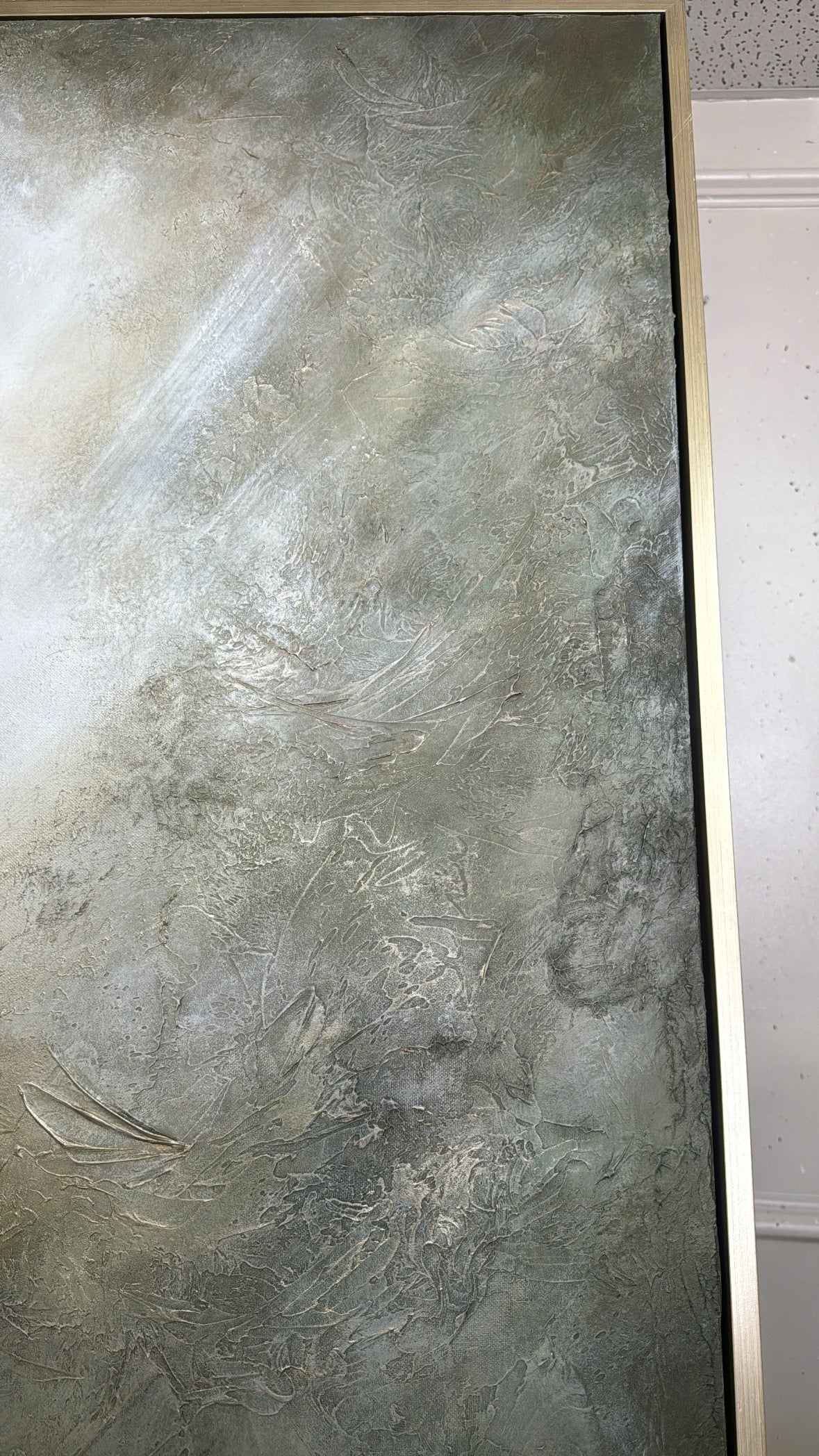 The Details - ''Realm III" is a very heavily textured with some areas alluding to wings. Coloured with luscious greens and neutrals and lashings of gold. flying into the light are little bird silhouettes. The size is a 100x100cm and is resting in a gold frame which brings the total measurements to approximately 104x104cm