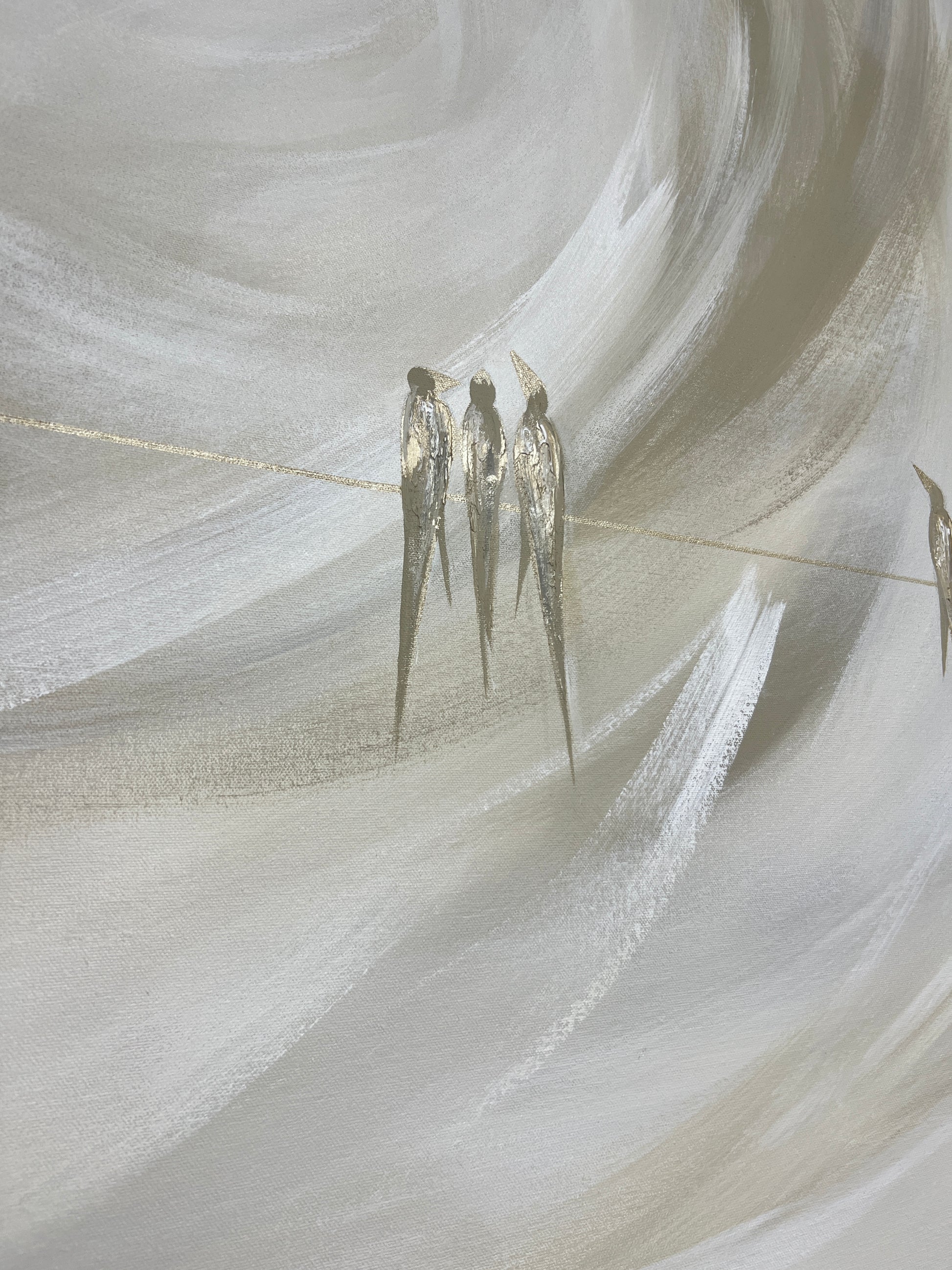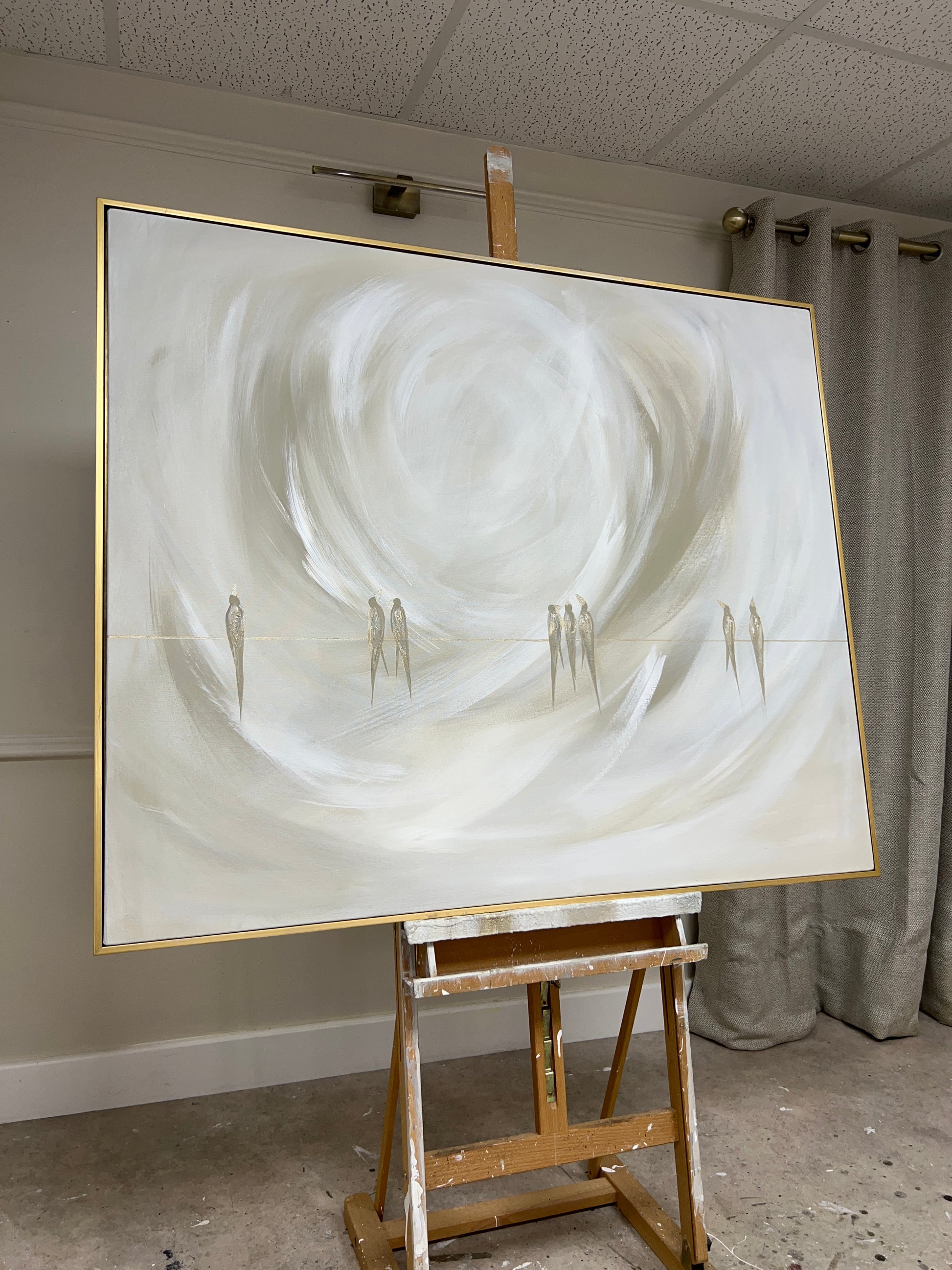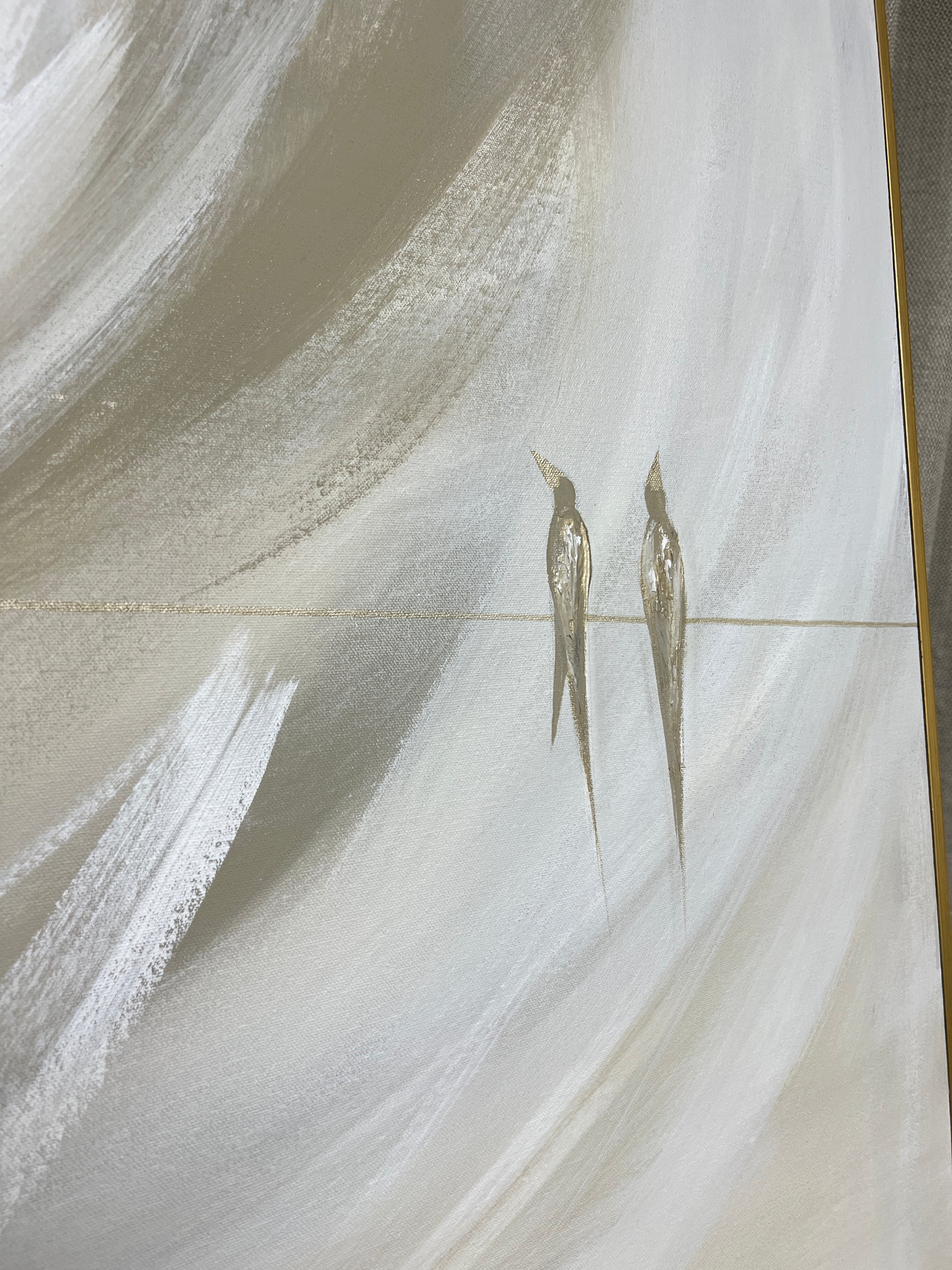 ‘The Flock' is a very soft taupe, cream,, off white and gold impactful artwork on canvas size 100x120cm with textured gold and taupe birds on a gold string (Please note framing adds around 3-4cm all round dependant on frame option selected
