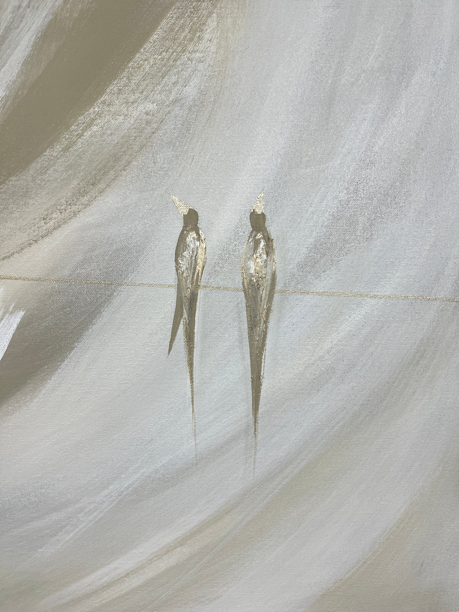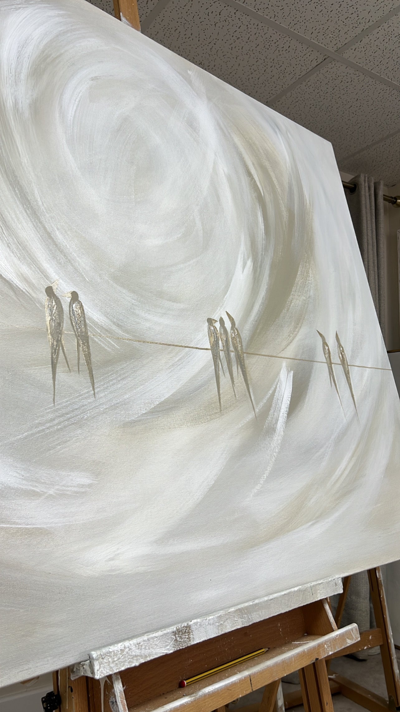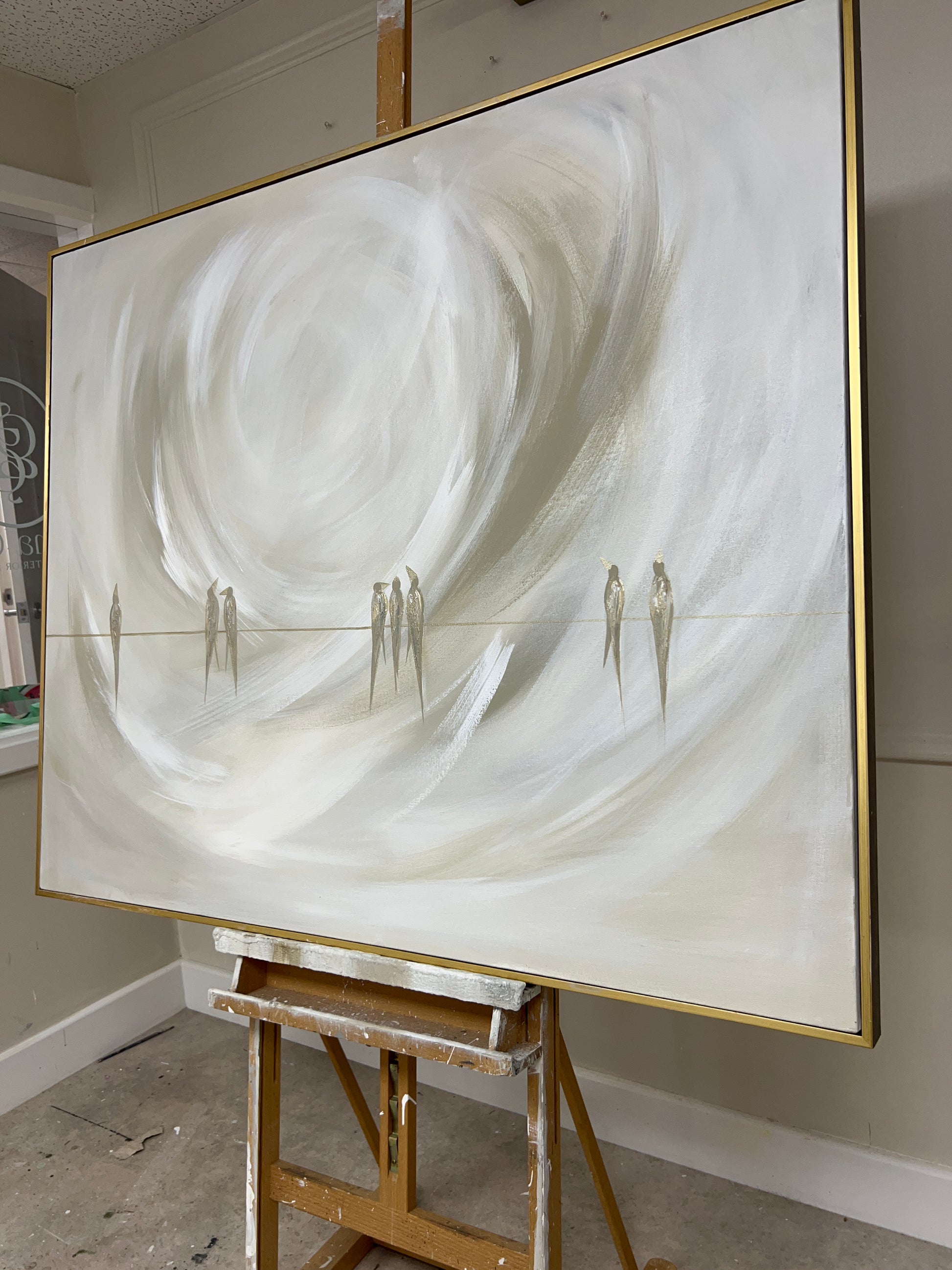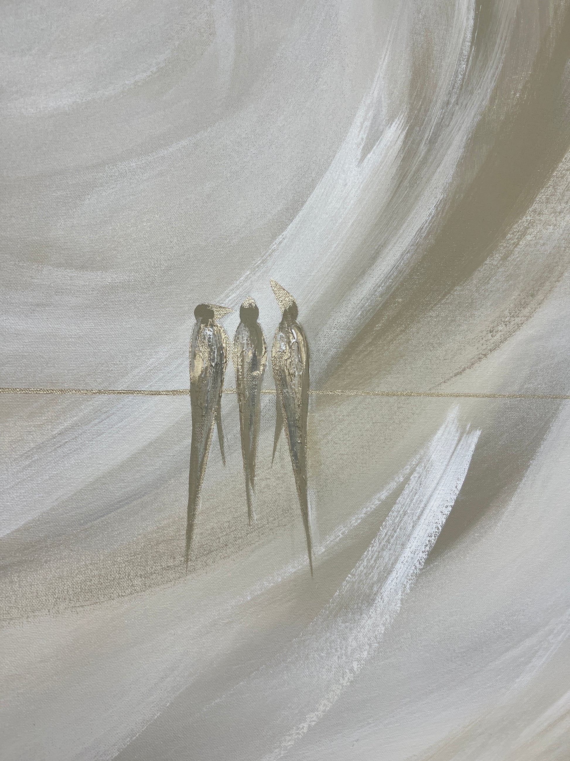 ‘The Flock' is a very soft taupe, cream,, off white and gold impactful artwork on canvas size 100x120cm with textured gold and taupe birds on a gold string (Please note framing adds around 3-4cm all round dependant on frame option selected