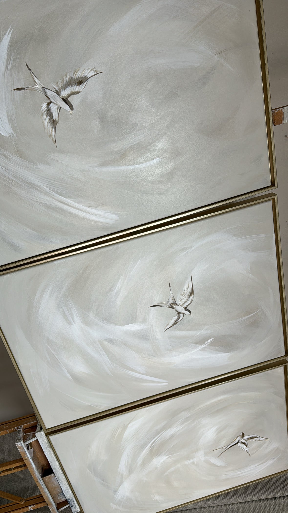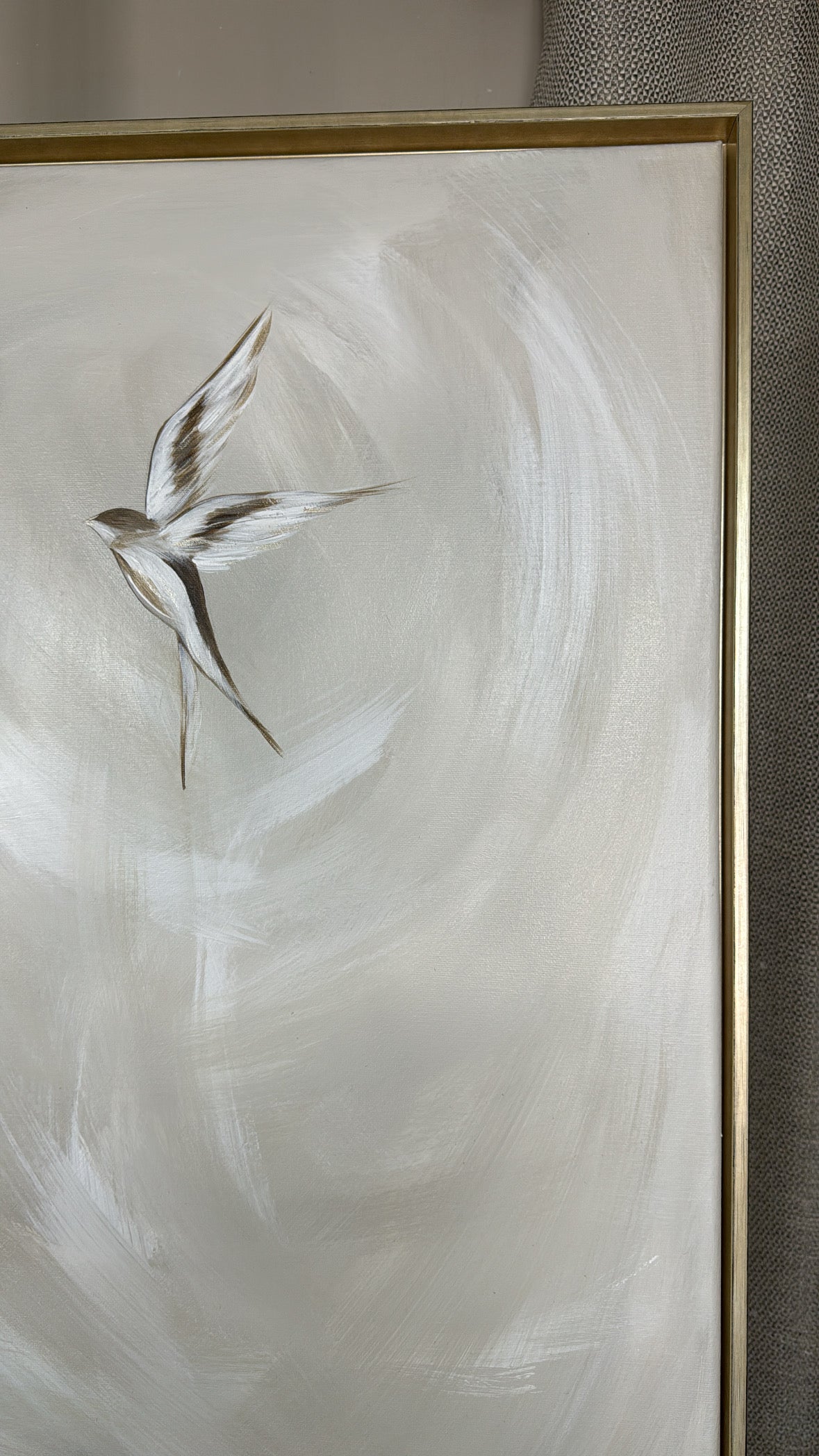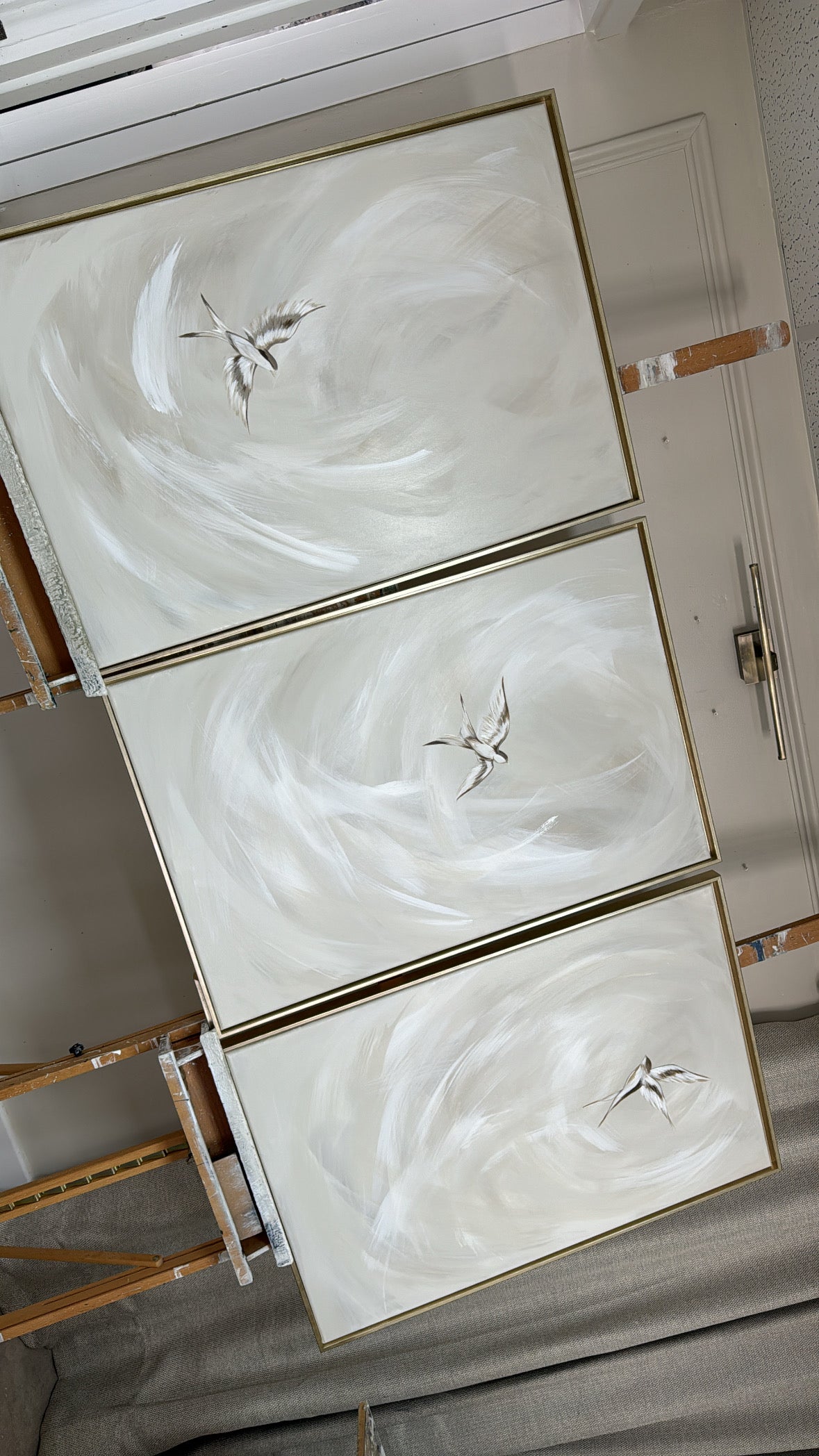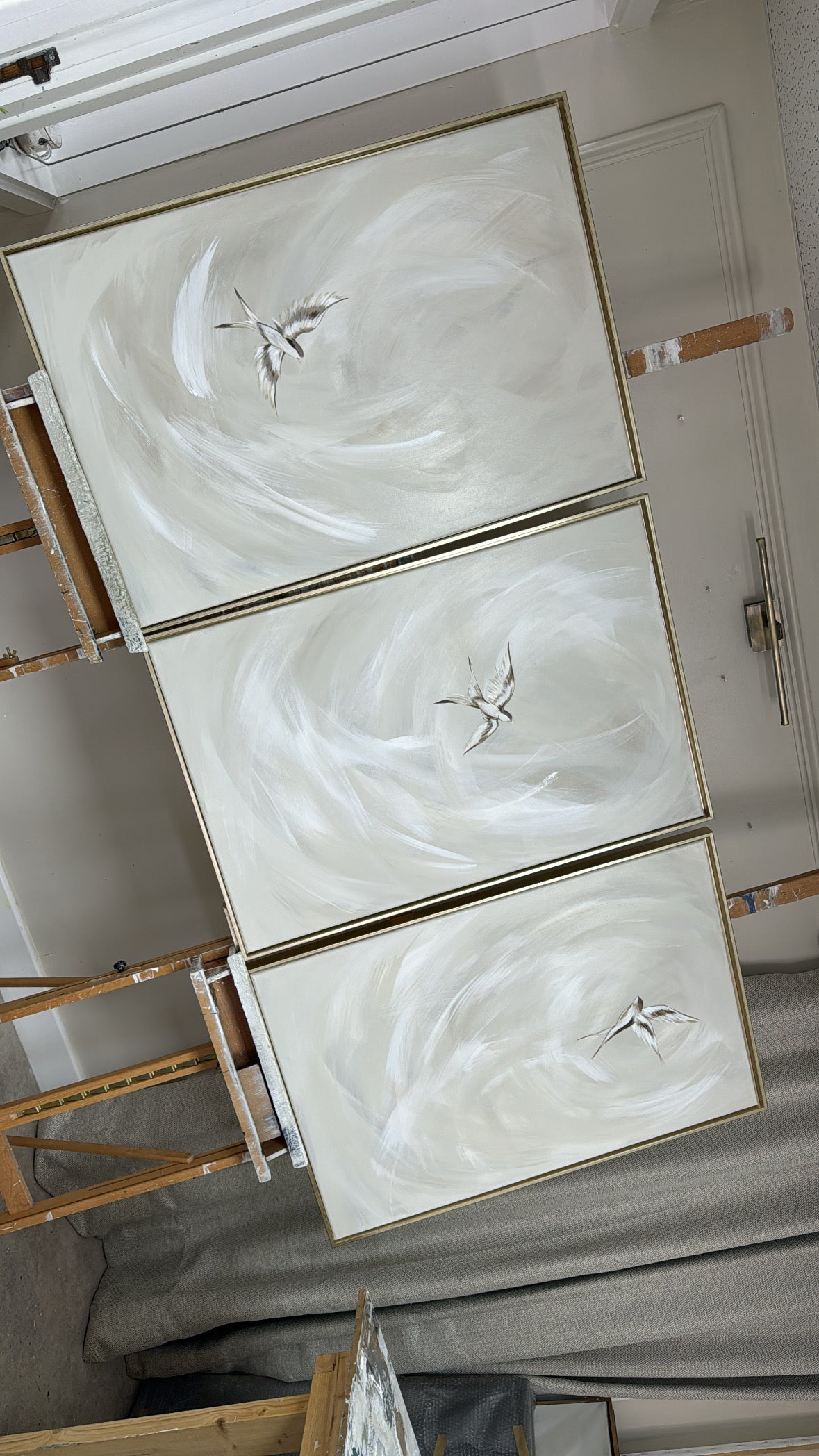 ‘Tranquil Trio - Neutral' was created with soft and airy creams, soft beige and off white undertones. On each piece is a single brown, taupe and gold bird. The size of the canvases are 61x91cm per piece and are resting in champagne gold frames. (Please note the frames adds around 2-4cm all round dependant on frame option selected) Bespoke framing is included in the cost.