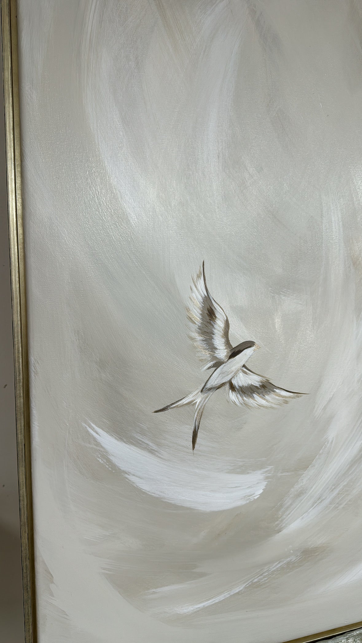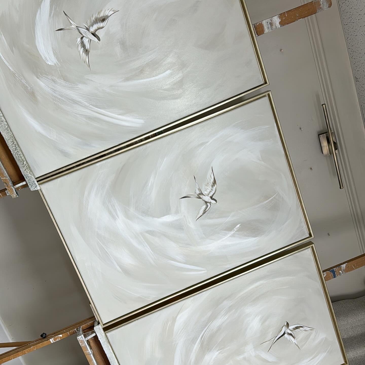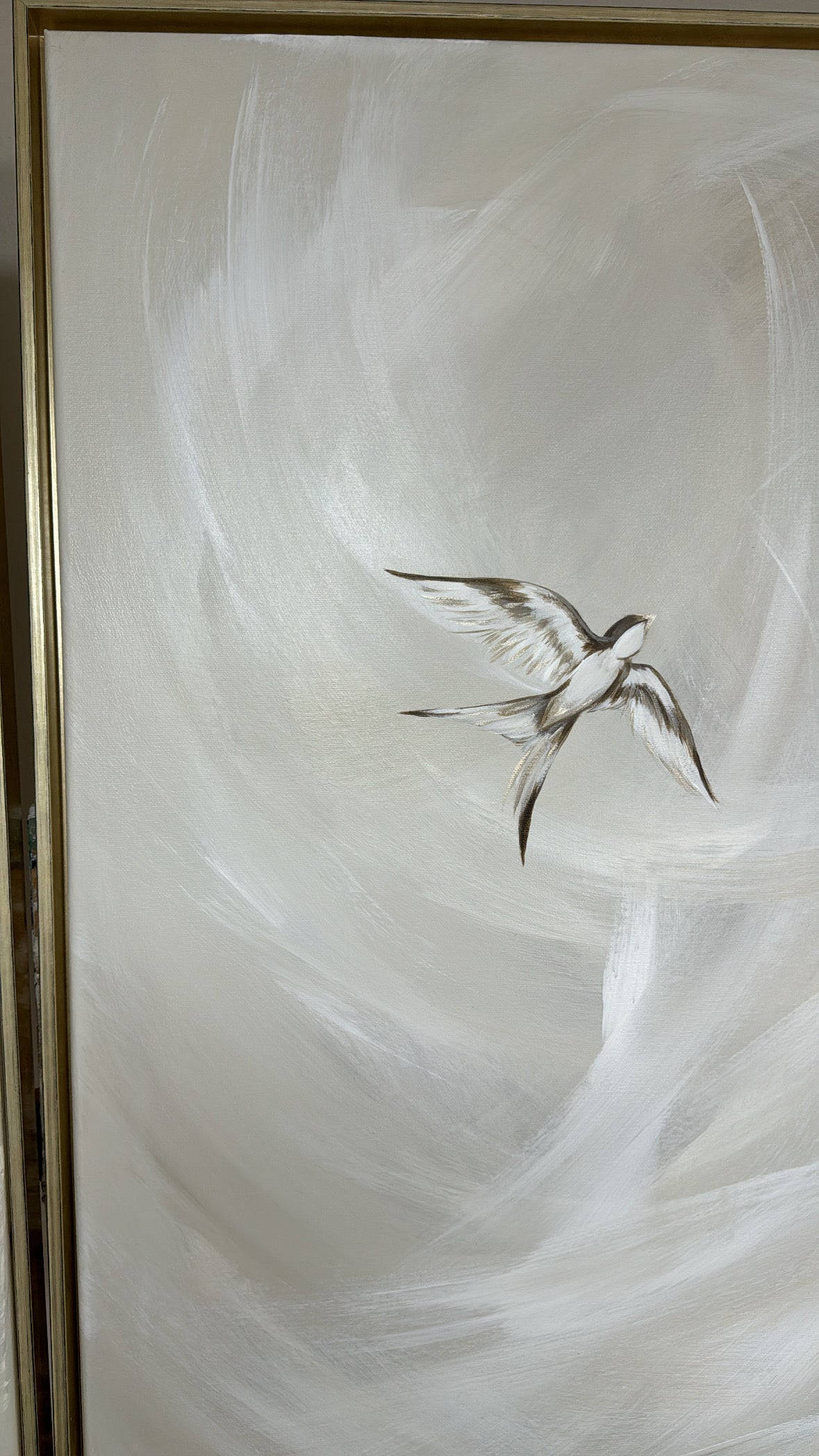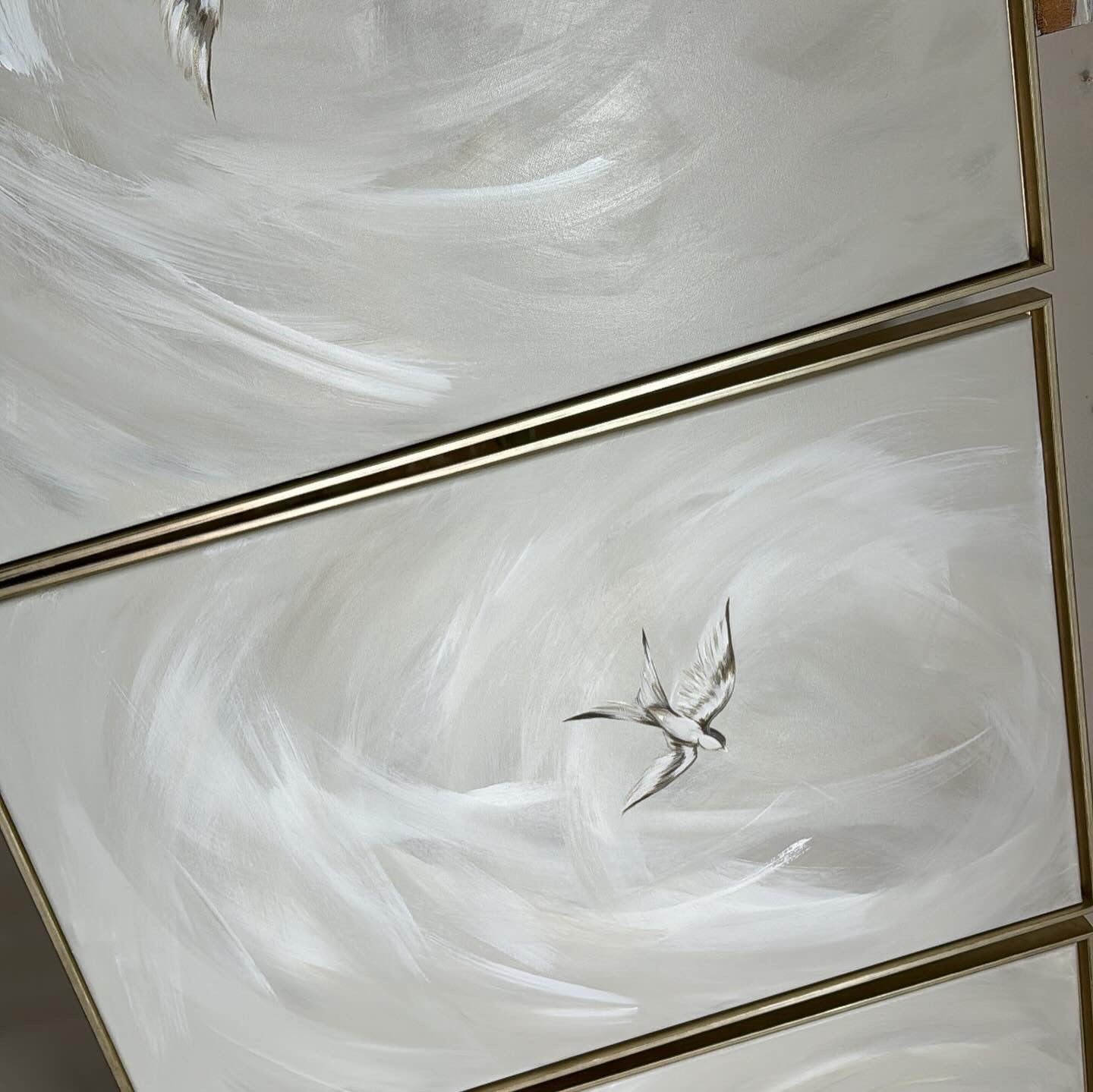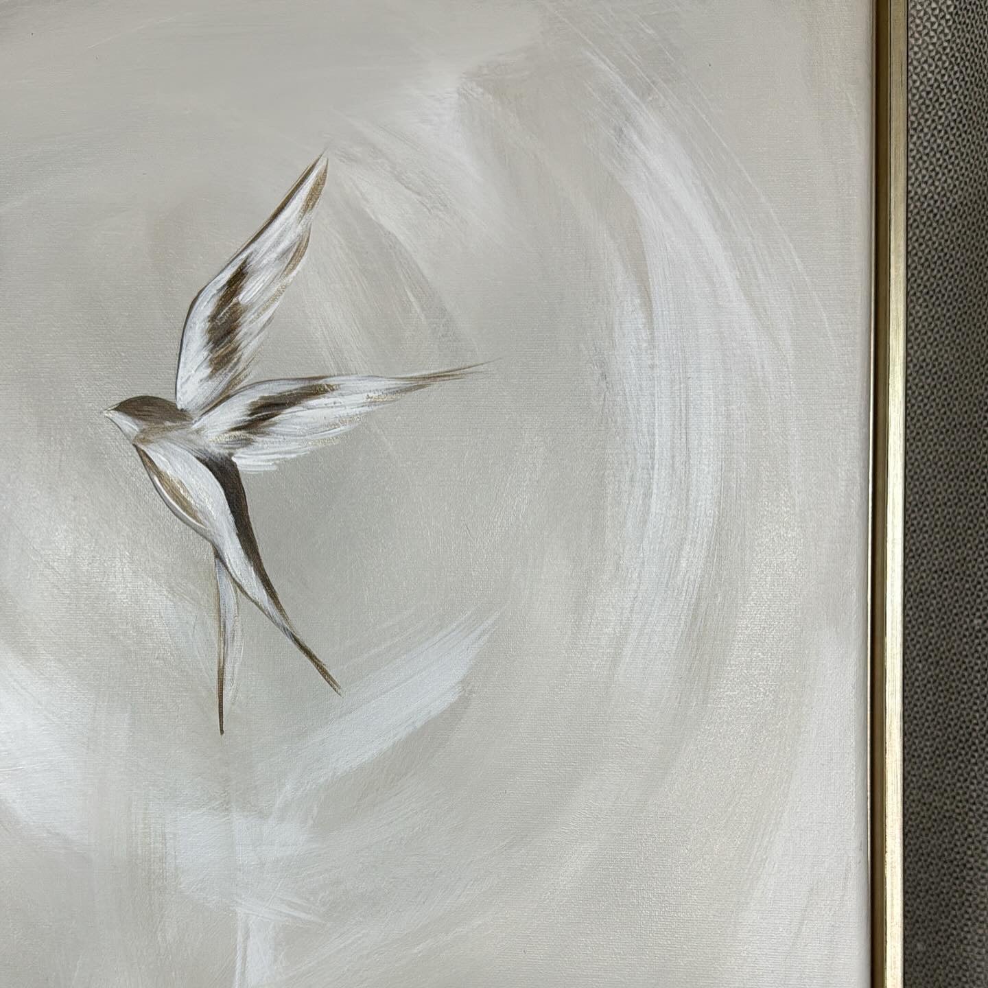 ‘Tranquil Trio - Neutral' was created with soft and airy creams, soft beige and off white undertones. On each piece is a single brown, taupe and gold bird. The size of the canvases are 61x91cm per piece and are resting in champagne gold frames. (Please note the frames adds around 2-4cm all round dependant on frame option selected) Bespoke framing is included in the cost.