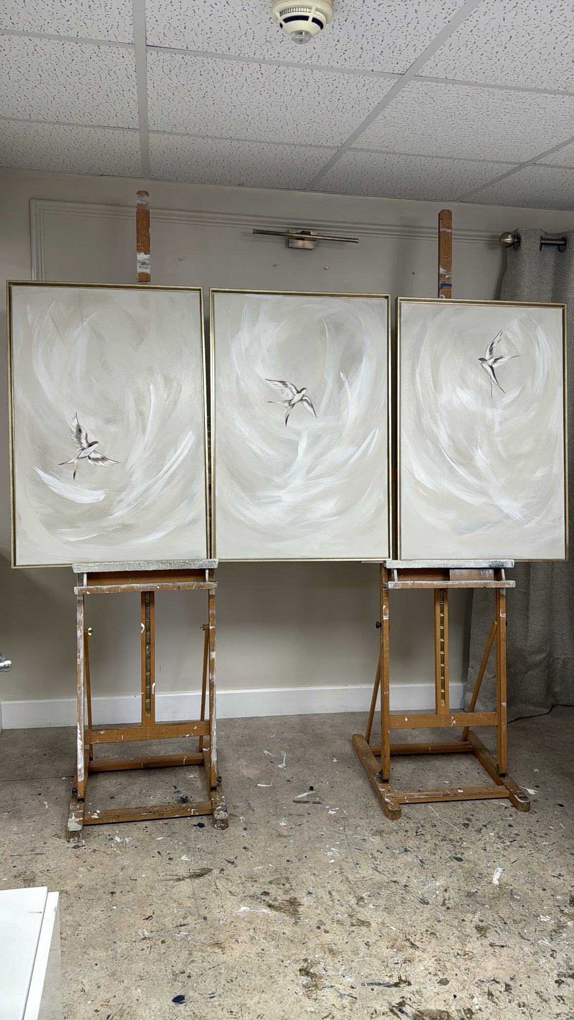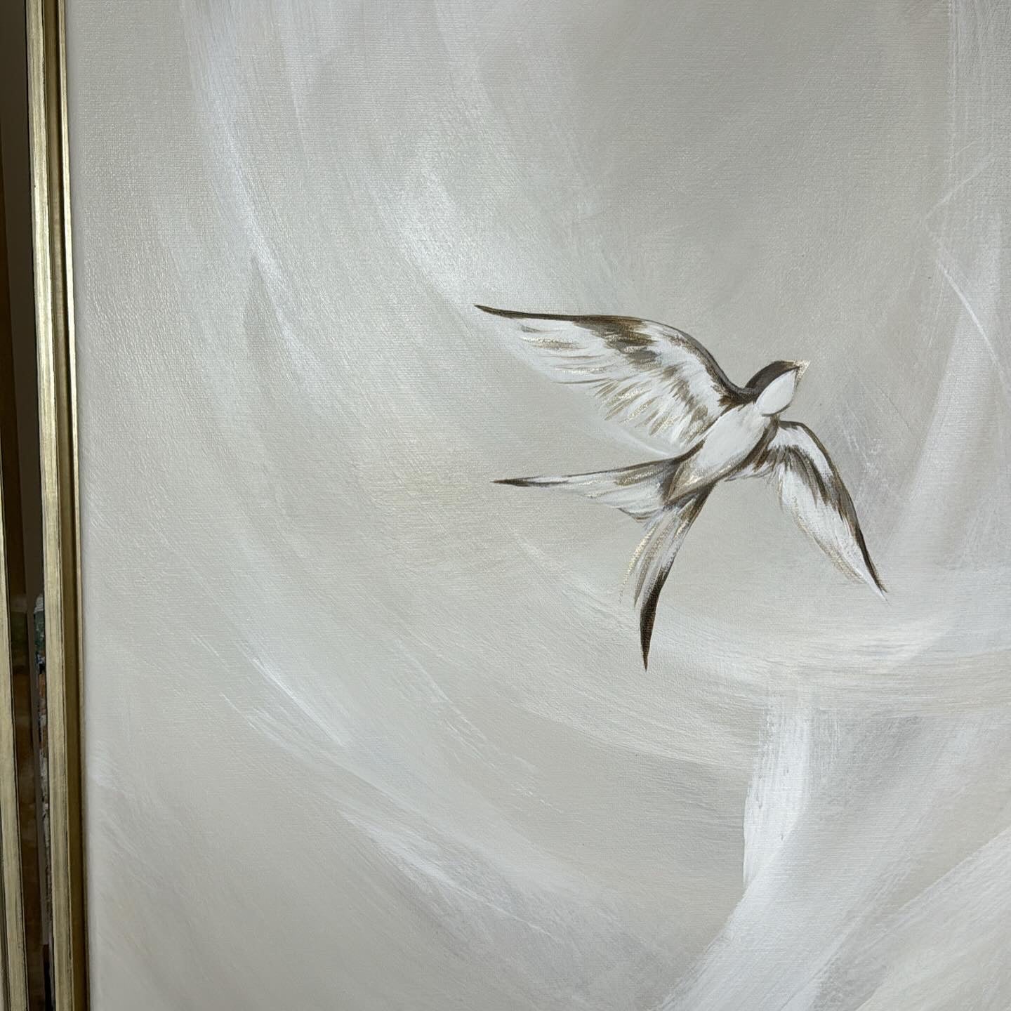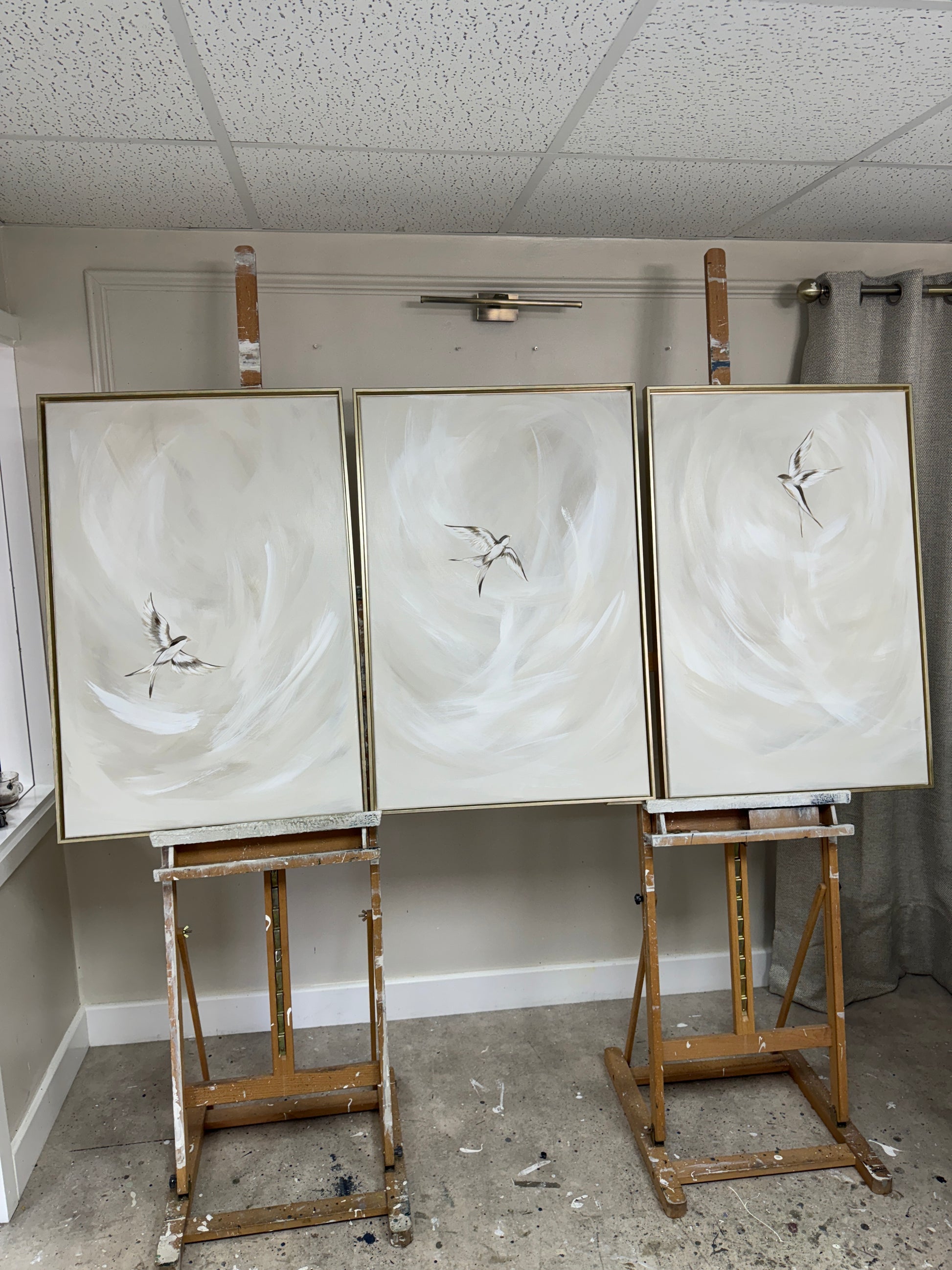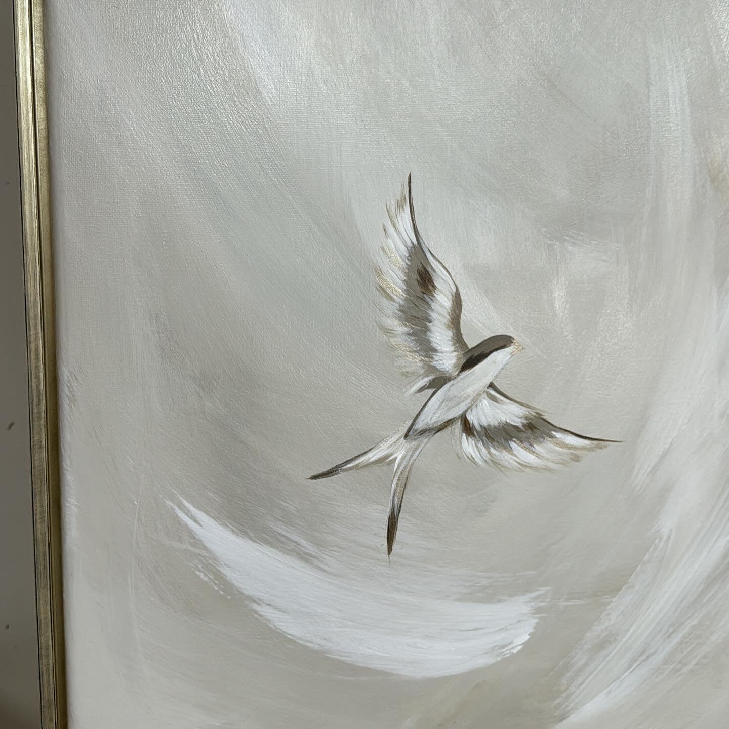 ‘Tranquil Trio - Neutral' was created with soft and airy creams, soft beige and off white undertones. On each piece is a single brown, taupe and gold bird. The size of the canvases are 61x91cm per piece and are resting in champagne gold frames. (Please note the frames adds around 2-4cm all round dependant on frame option selected) Bespoke framing is included in the cost.