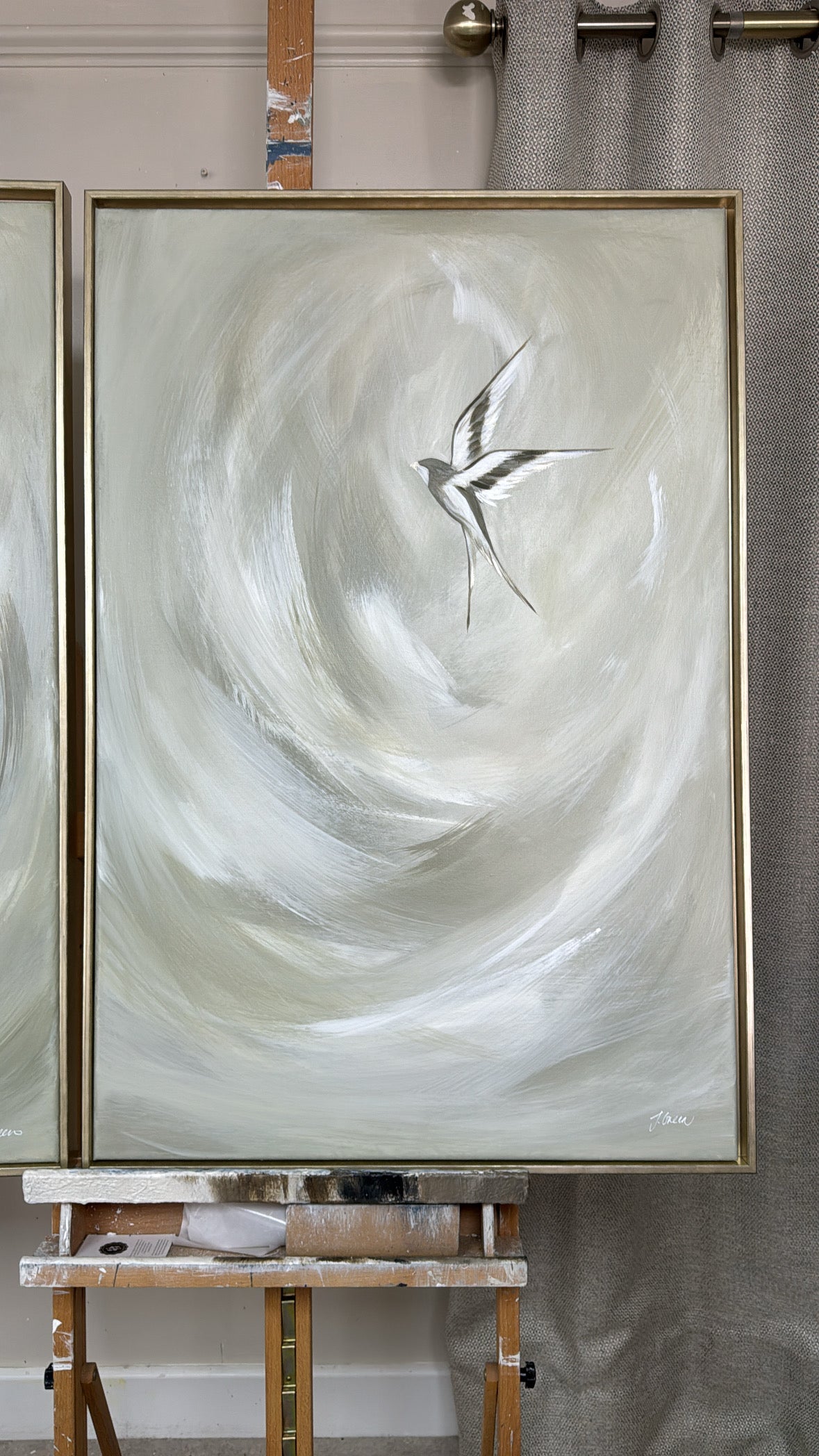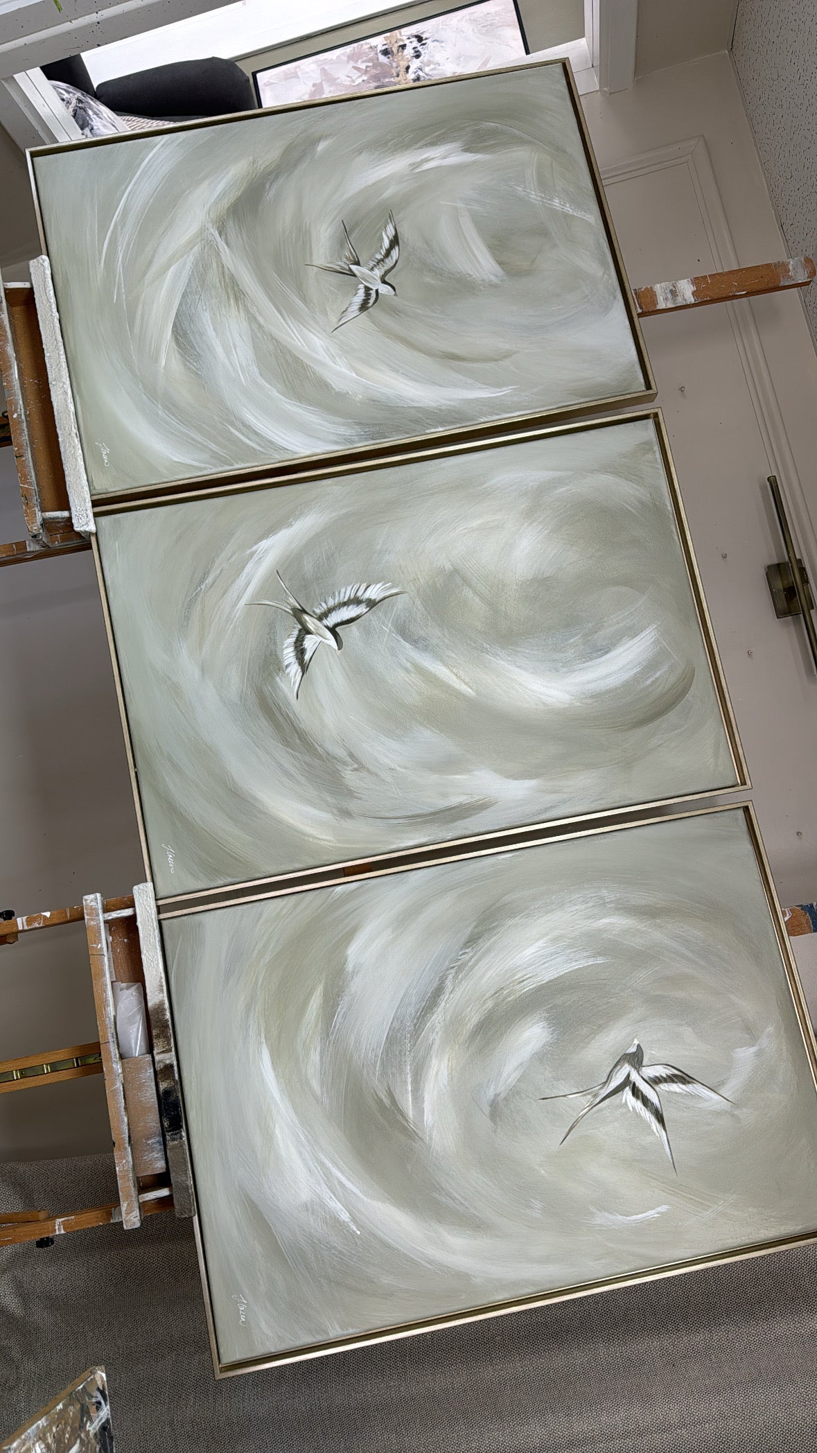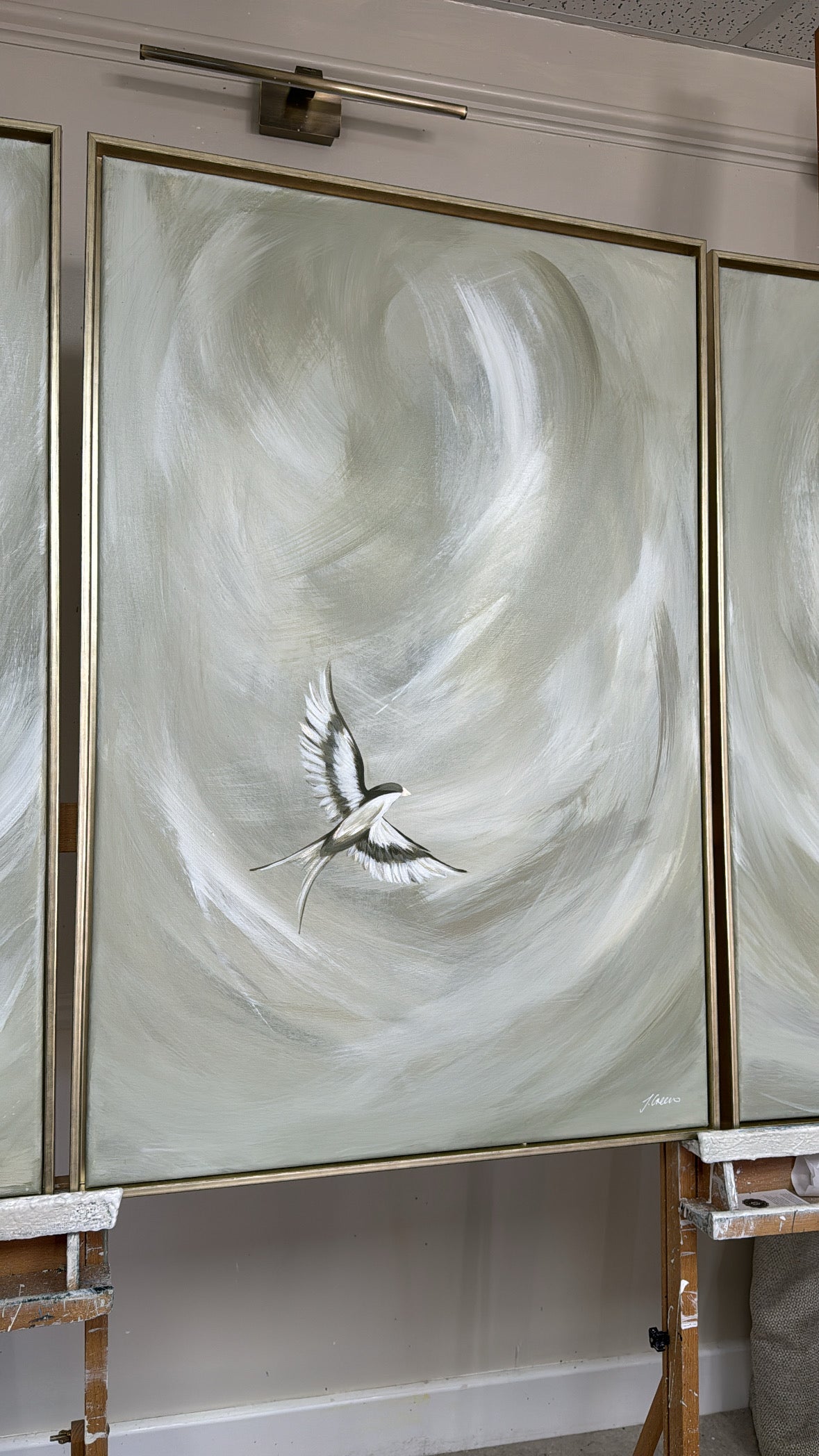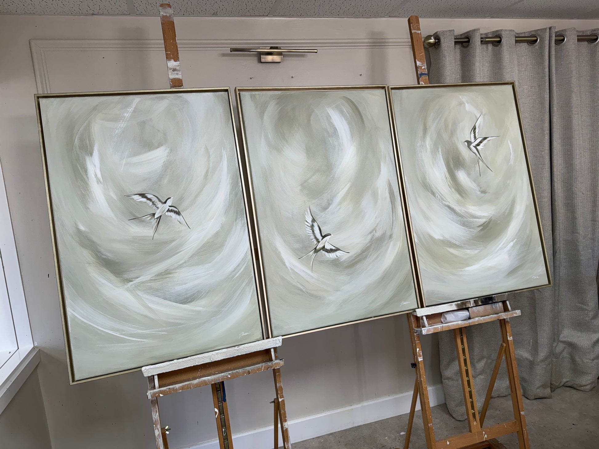 ‘Tranquil Trio - Sage' was created with soft and airy sage greens with off white undertones. On each piece is a single khaki, taupe and gold bird. The size of the canvases are 61x91cm per piece and are resting in champagne gold frames. (Please note the frames adds around 2-4cm all round dependant on frame option selected) Bespoke framing is included in the cost.