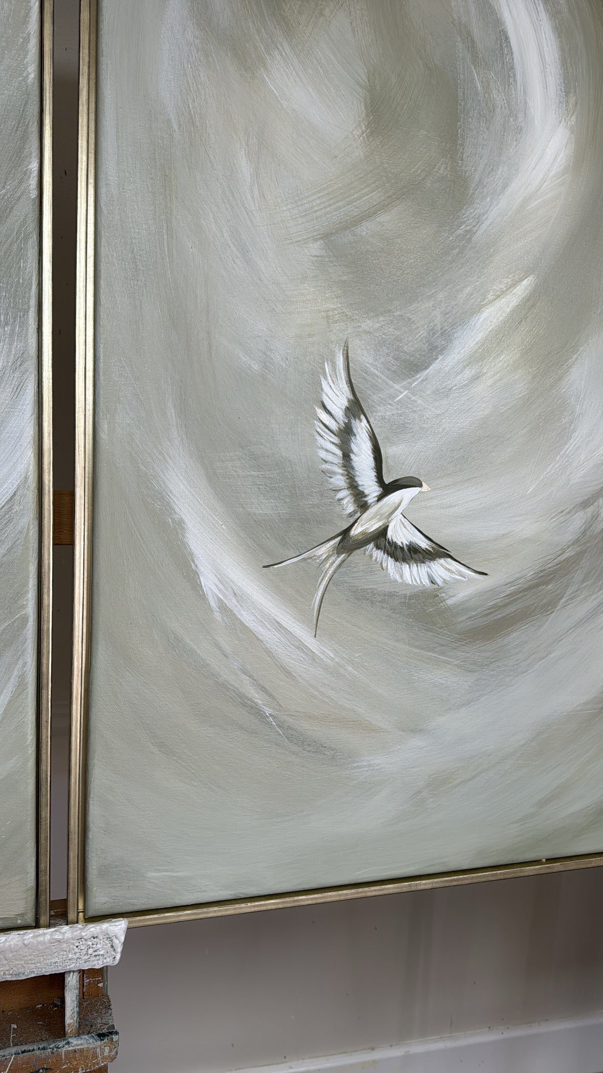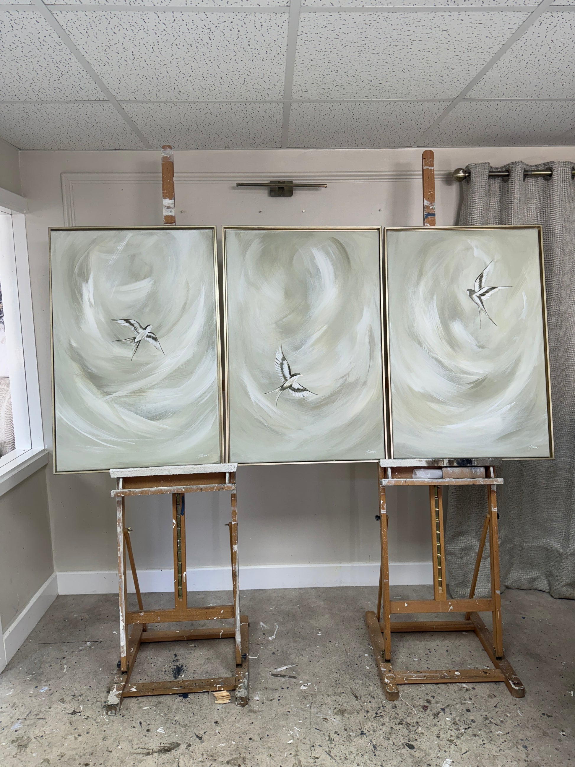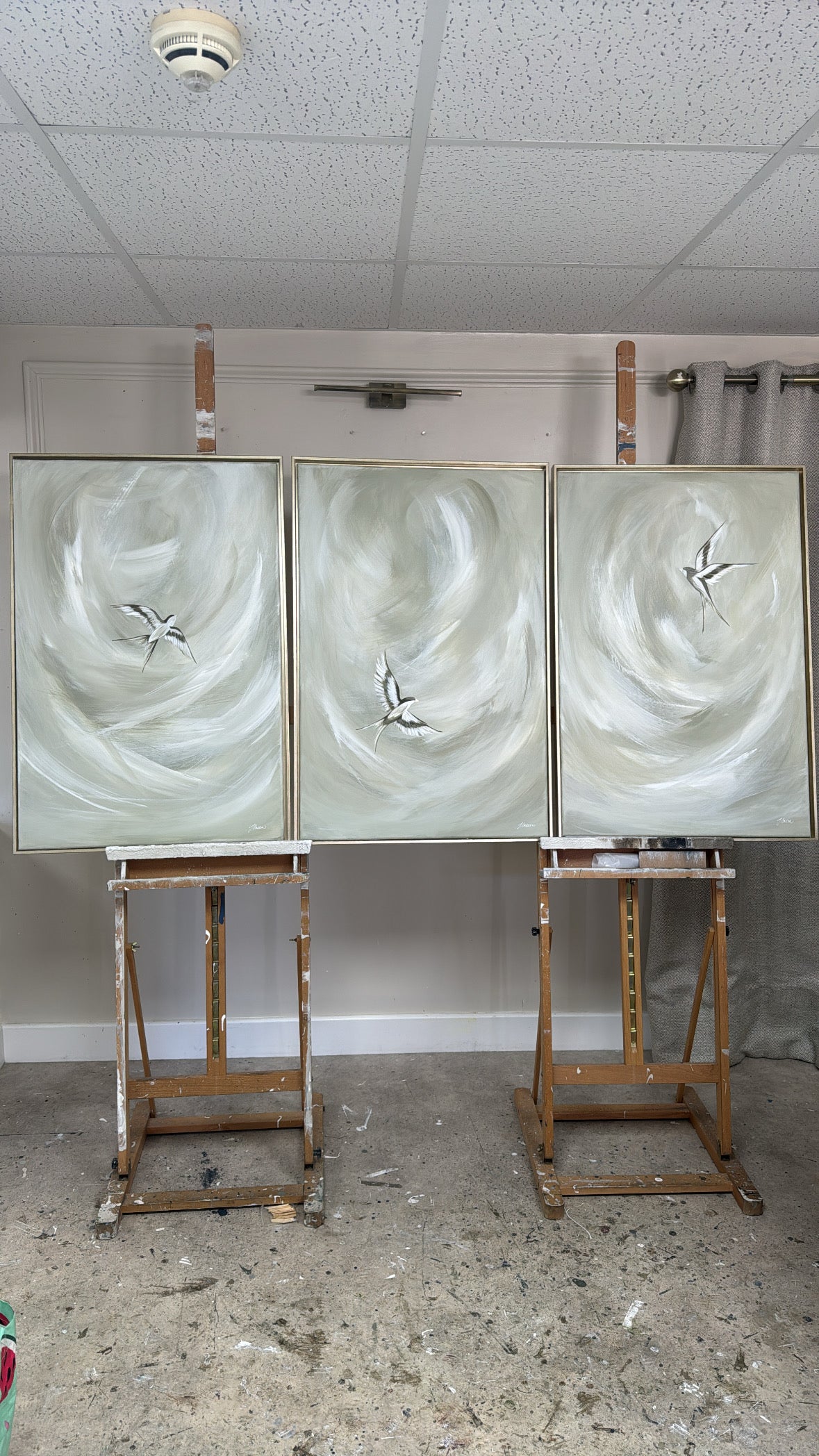 ‘Tranquil Trio - Sage' was created with soft and airy sage greens with off white undertones. On each piece is a single khaki, taupe and gold bird. The size of the canvases are 61x91cm per piece and are resting in champagne gold frames. (Please note the frames adds around 2-4cm all round dependant on frame option selected) Bespoke framing is included in the cost.