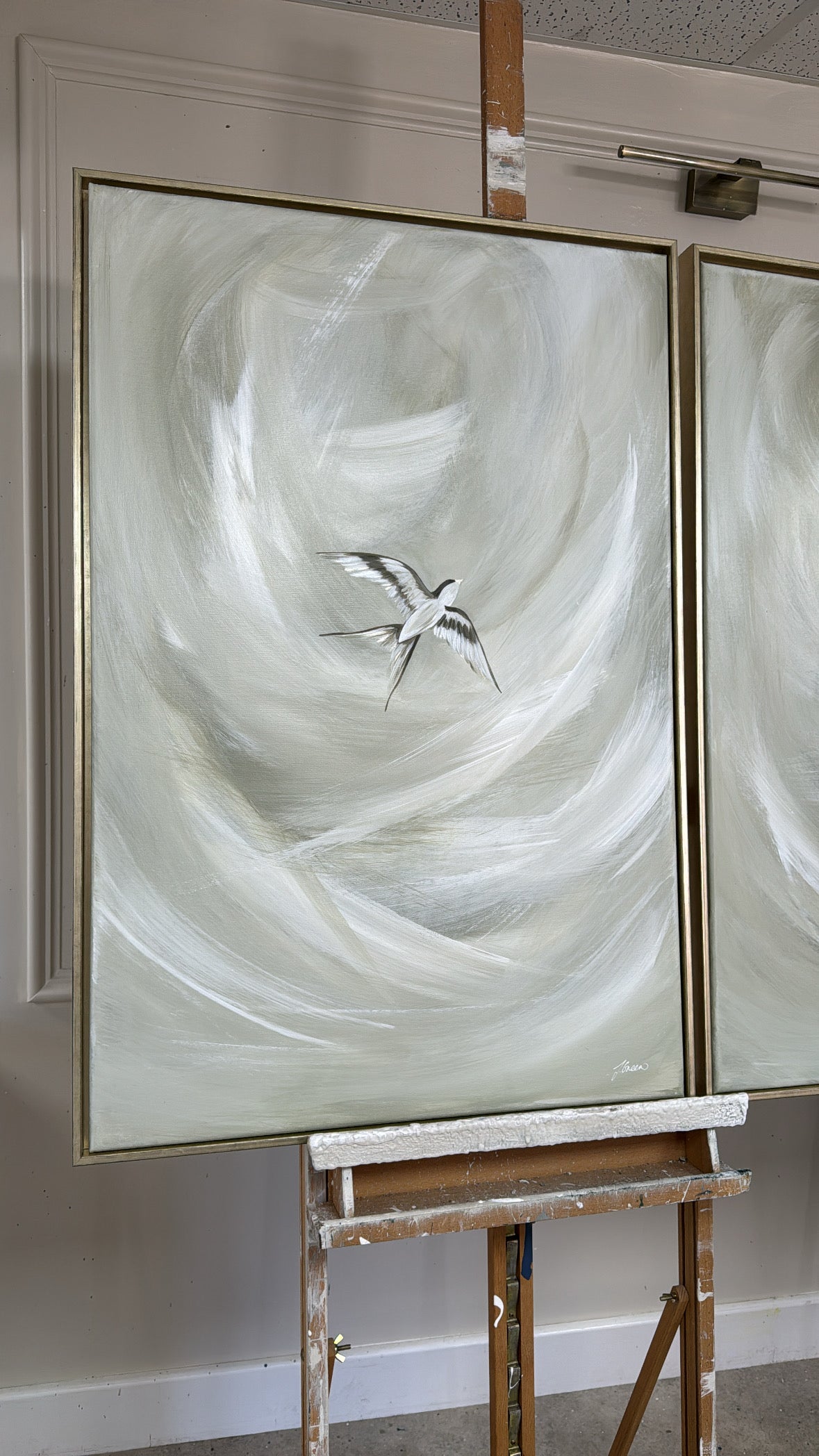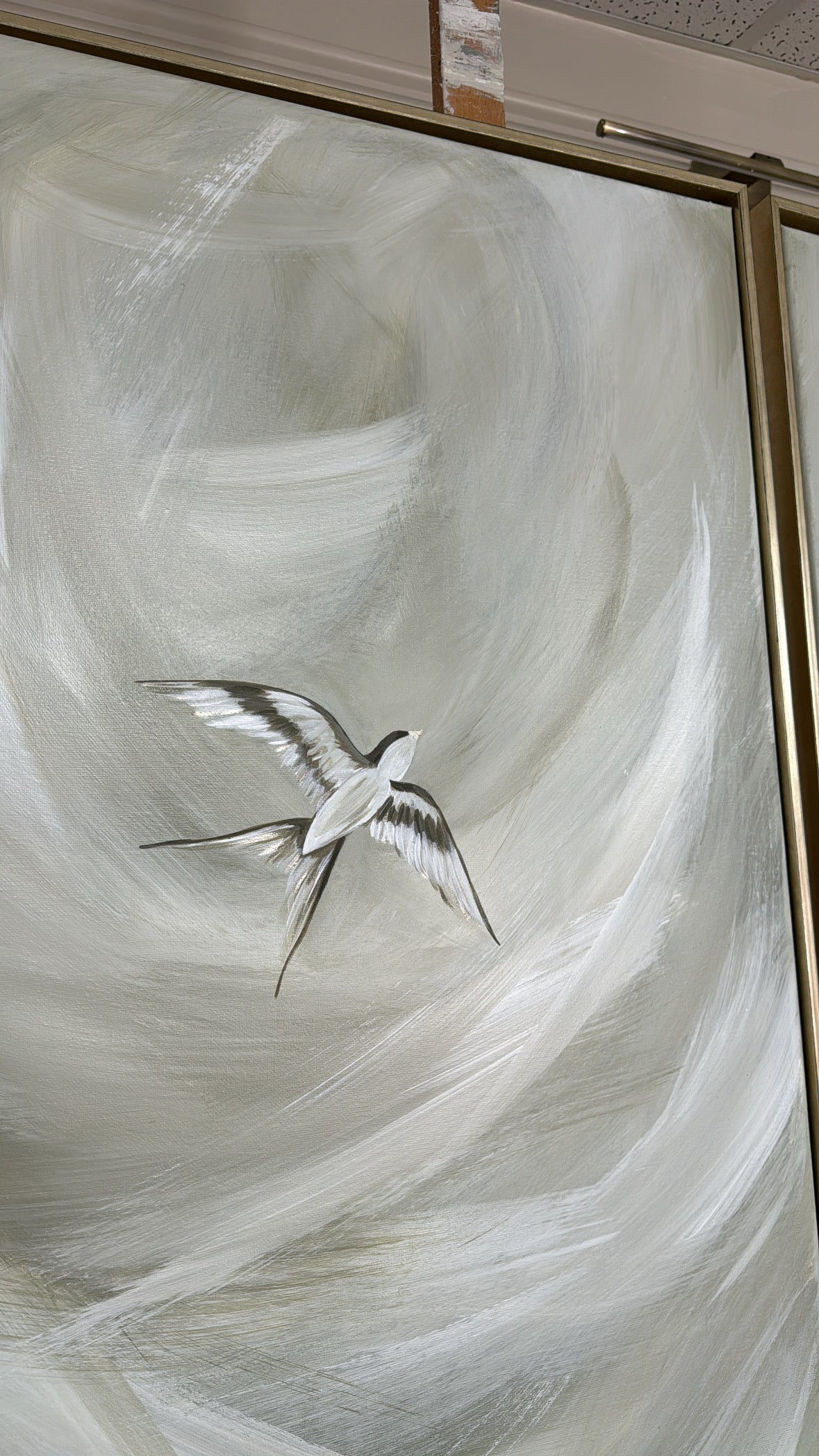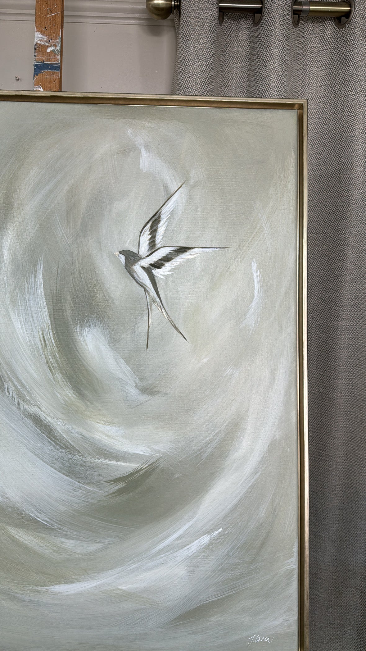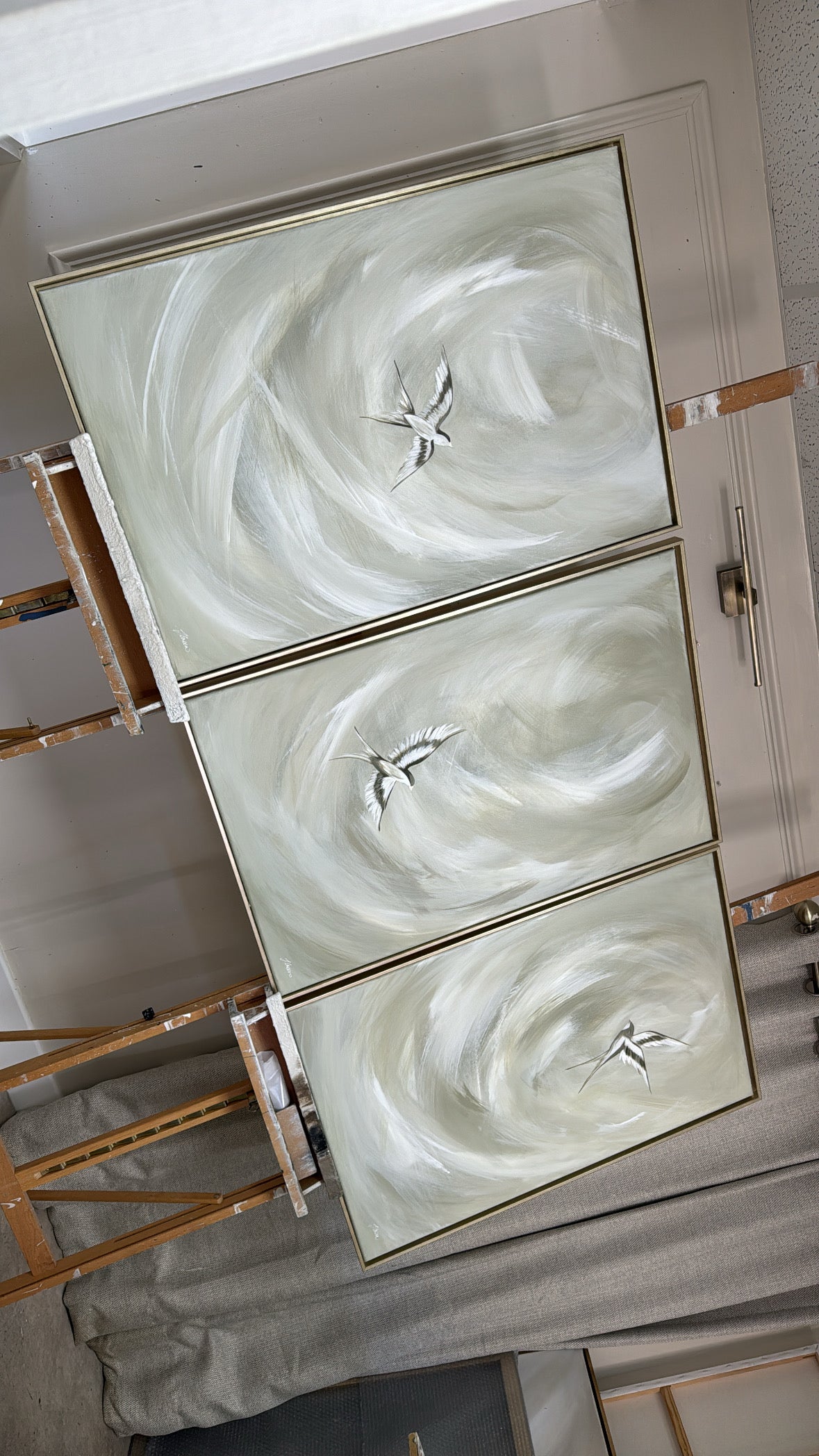 ‘Tranquil Trio - Sage' was created with soft and airy sage greens with off white undertones. On each piece is a single khaki, taupe and gold bird. The size of the canvases are 61x91cm per piece and are resting in champagne gold frames. (Please note the frames adds around 2-4cm all round dependant on frame option selected) Bespoke framing is included in the cost.