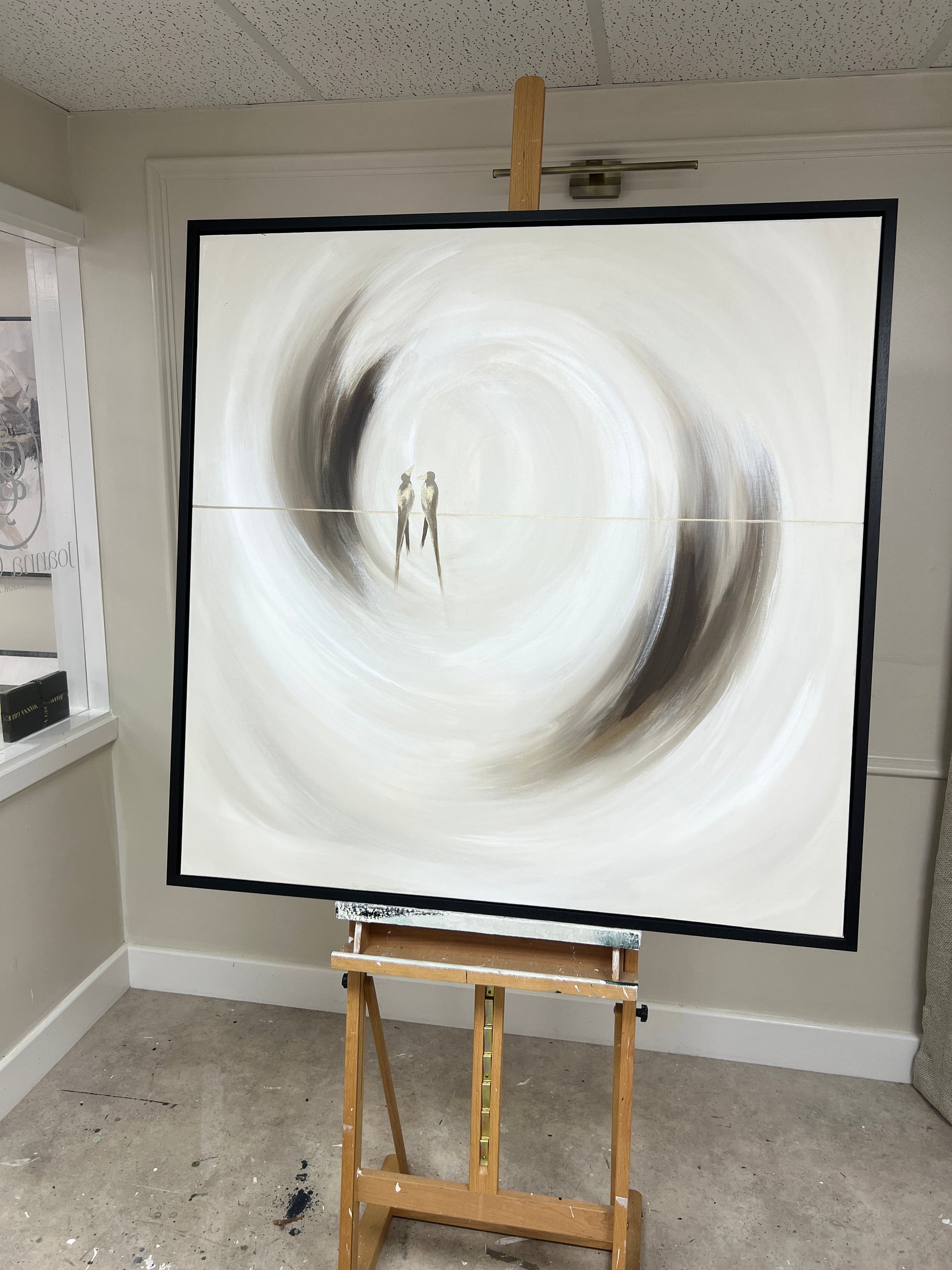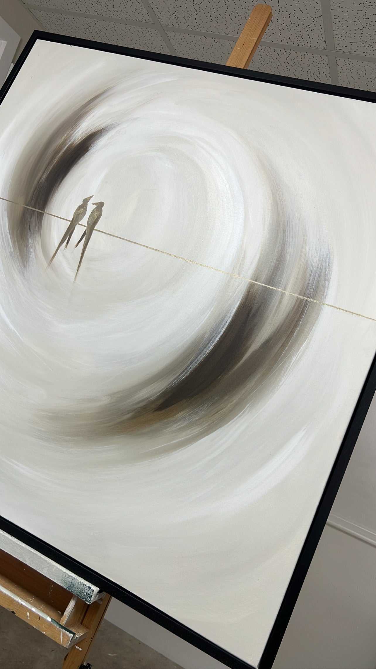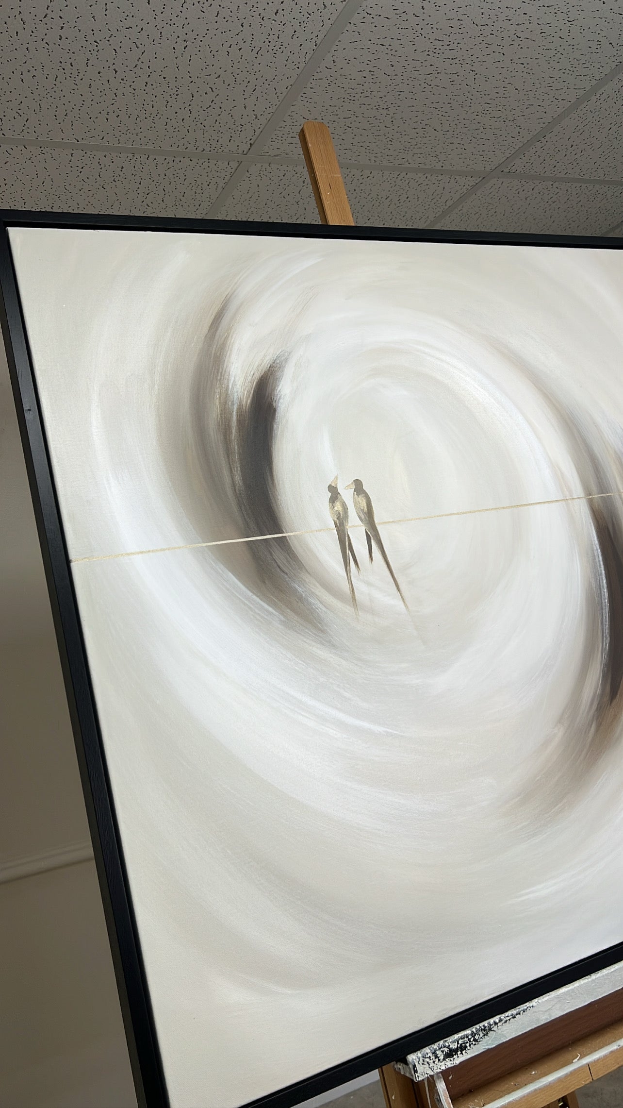 ‘Two For Joy - Mocha Birds' is a mix of warm umber browns, tans, cream and off white artwork on canvas with a two deep taupe and gold birds resting on a delicate gold string. The size of the canvas is 100x100cm and is resting in a black tray frame for your reference (Please note framing adds around 3-4cm all round dependant on frame option selected)