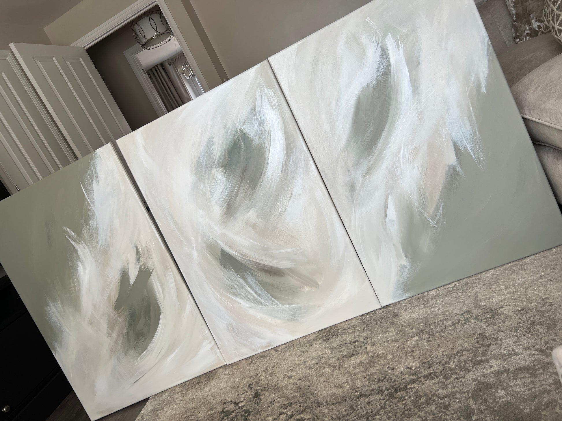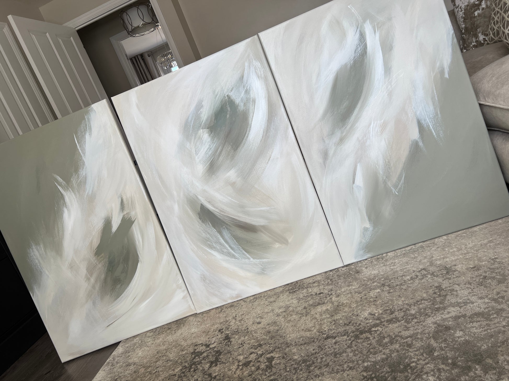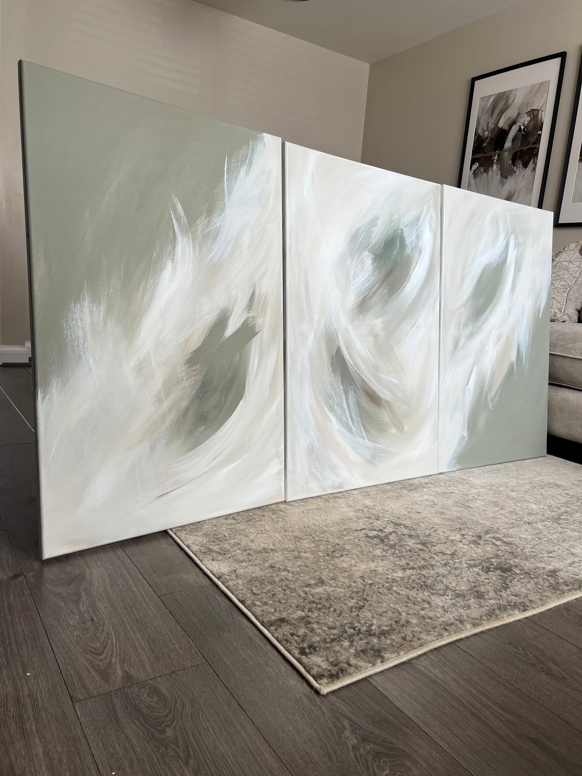 ‘Verdure Trio' was Created with deep dusky greens, subtle taupe's, , creams, soft beige and off white undertones. The size of the canvases are 61x91cm and are unframed in the images above. (Please note framing adds around 3-4cm all round dependant on frame option selected)