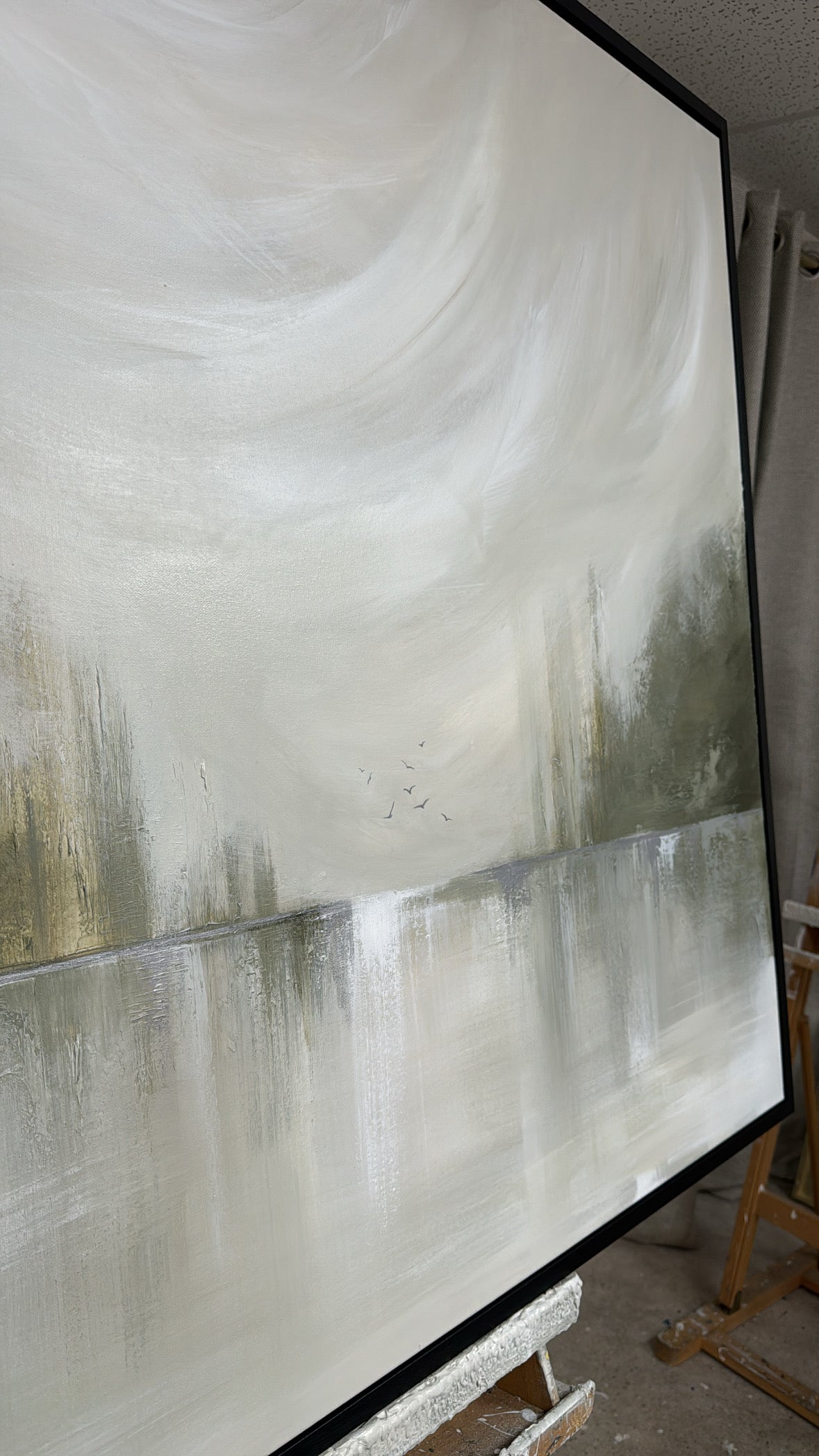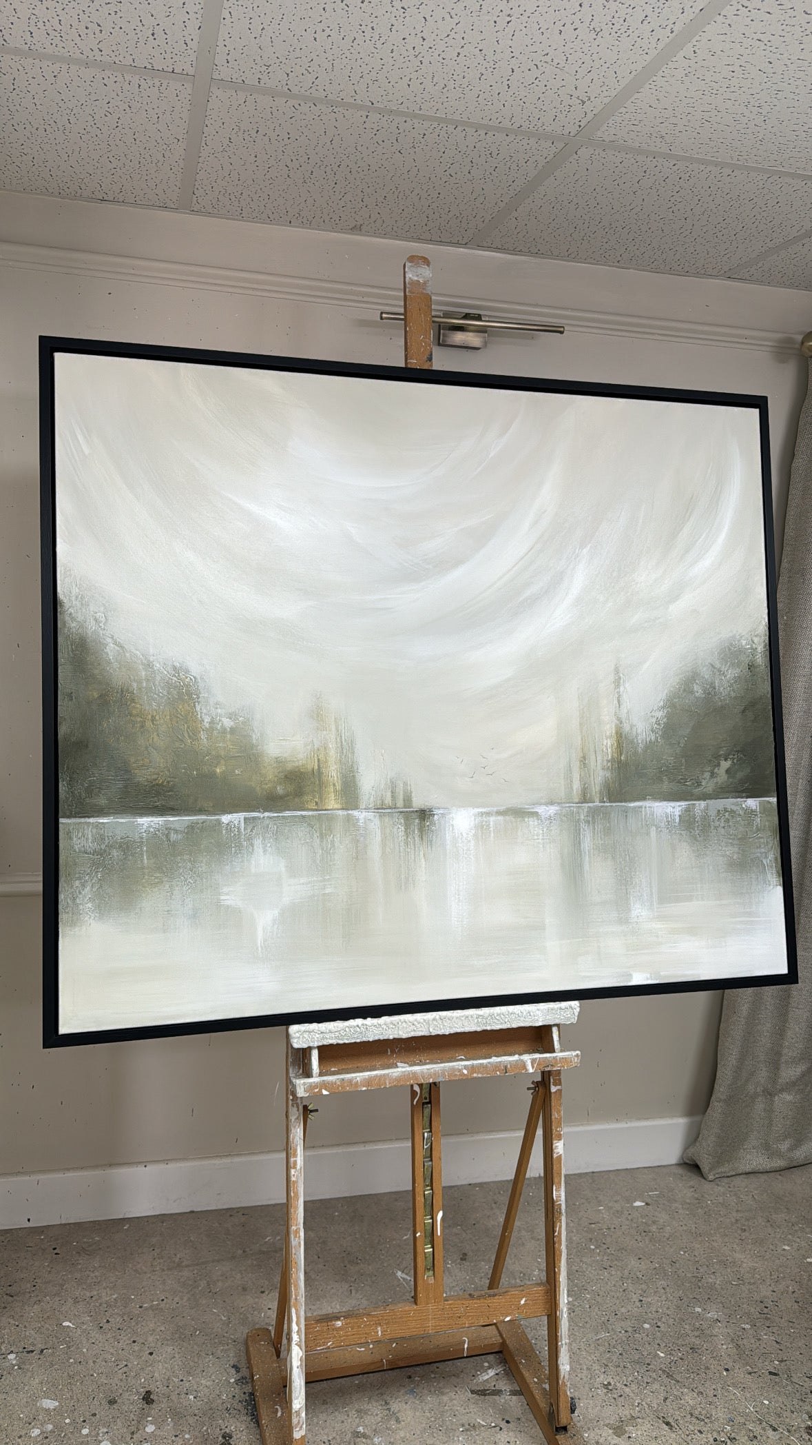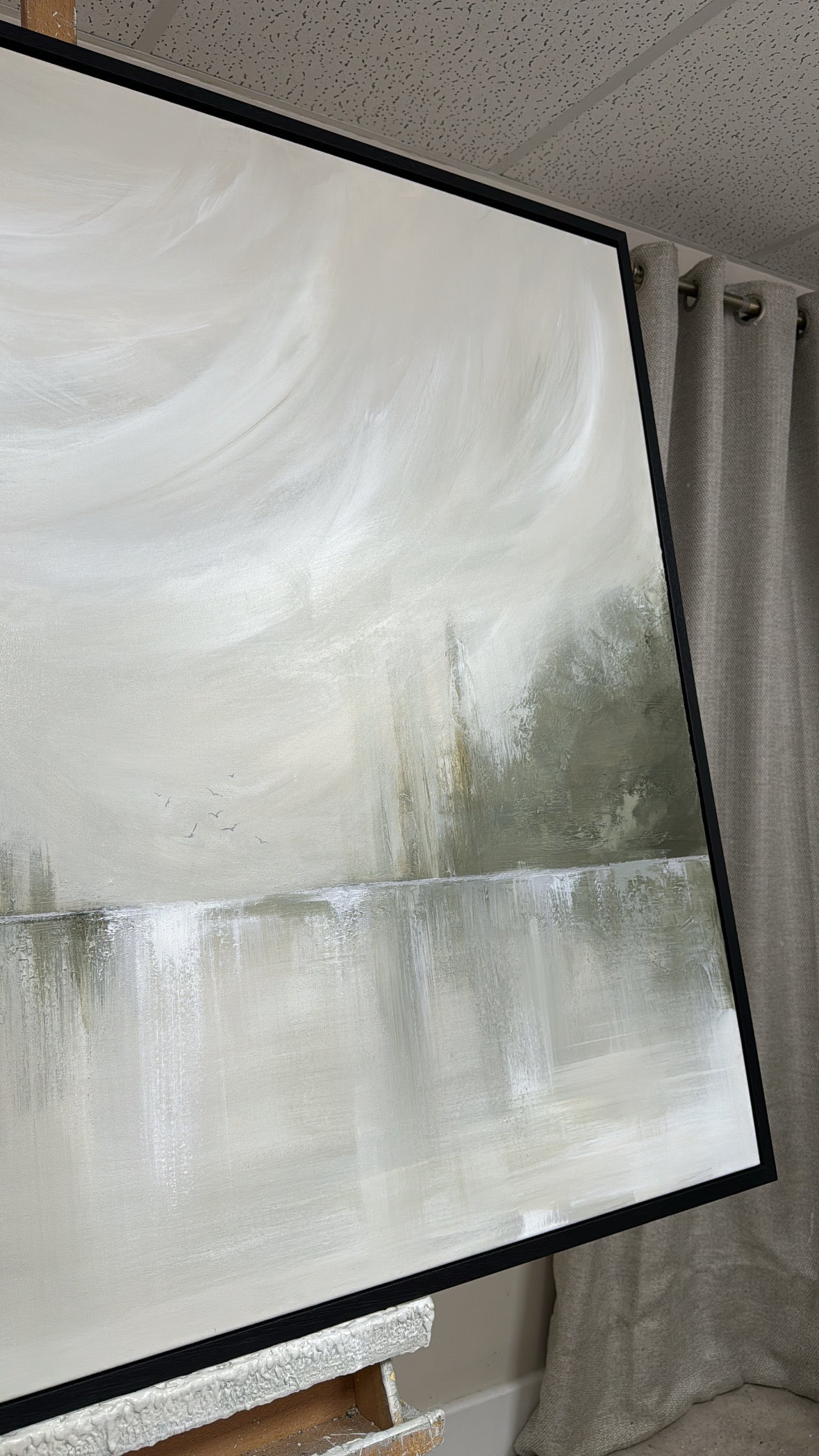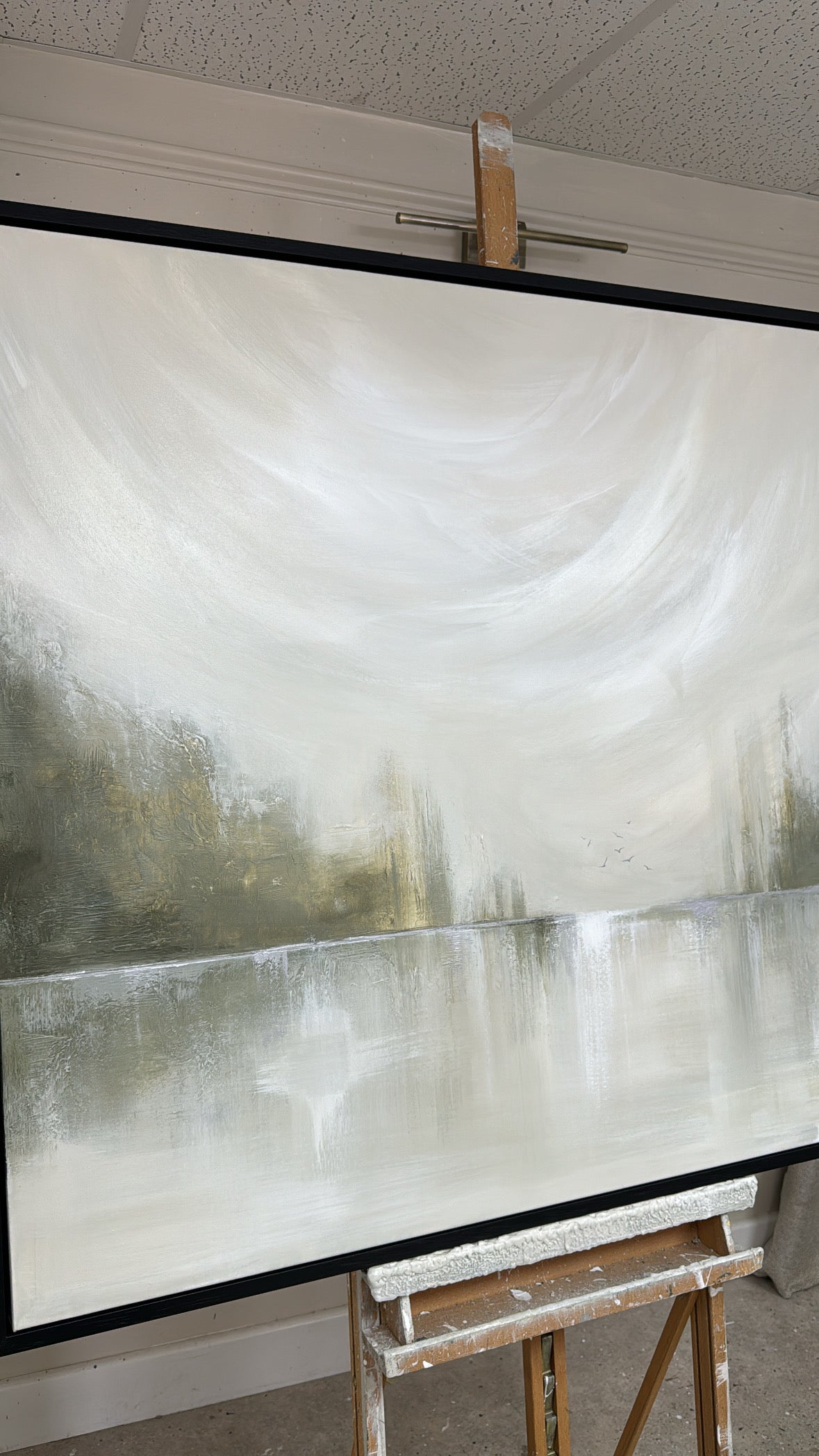 “Where the Crawdads Sing (Silver Skies) Was inspired by the beautiful book and film. Featured is a 100x120 cm piece in champagne frame (framing adds an additional few centimetres all round)